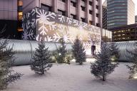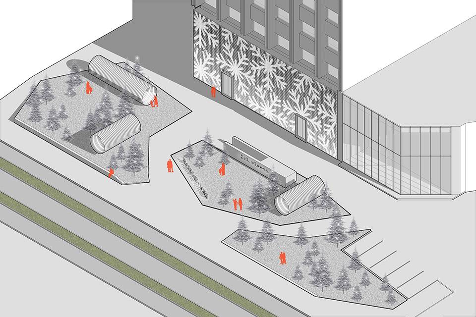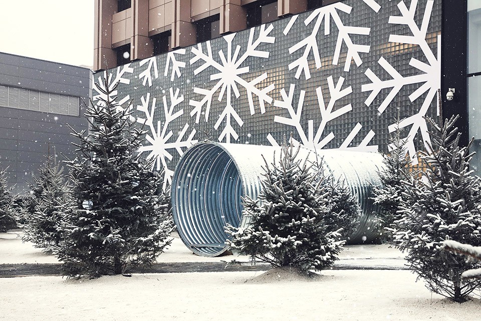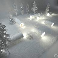 具體的組成部分首先包括原有草坪表面覆蓋的白色鵝卵石,它會(huì)將整個(gè)區(qū)域的節(jié)奏放緩,營(yíng)造寧?kù)o的氛圍。成組出現(xiàn)的不同尺度松樹(shù)使人仿佛置身大自然之中。而三個(gè)大型的內(nèi)含柔和燈光的管形小屋將進(jìn)一步吸引人們湊近感受這一冬日氛圍。