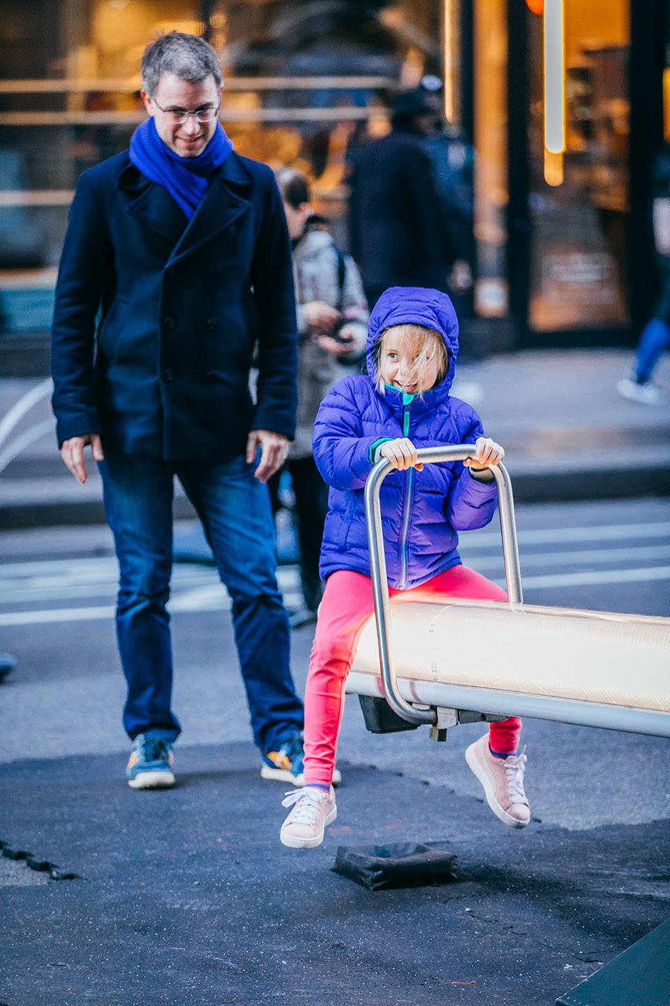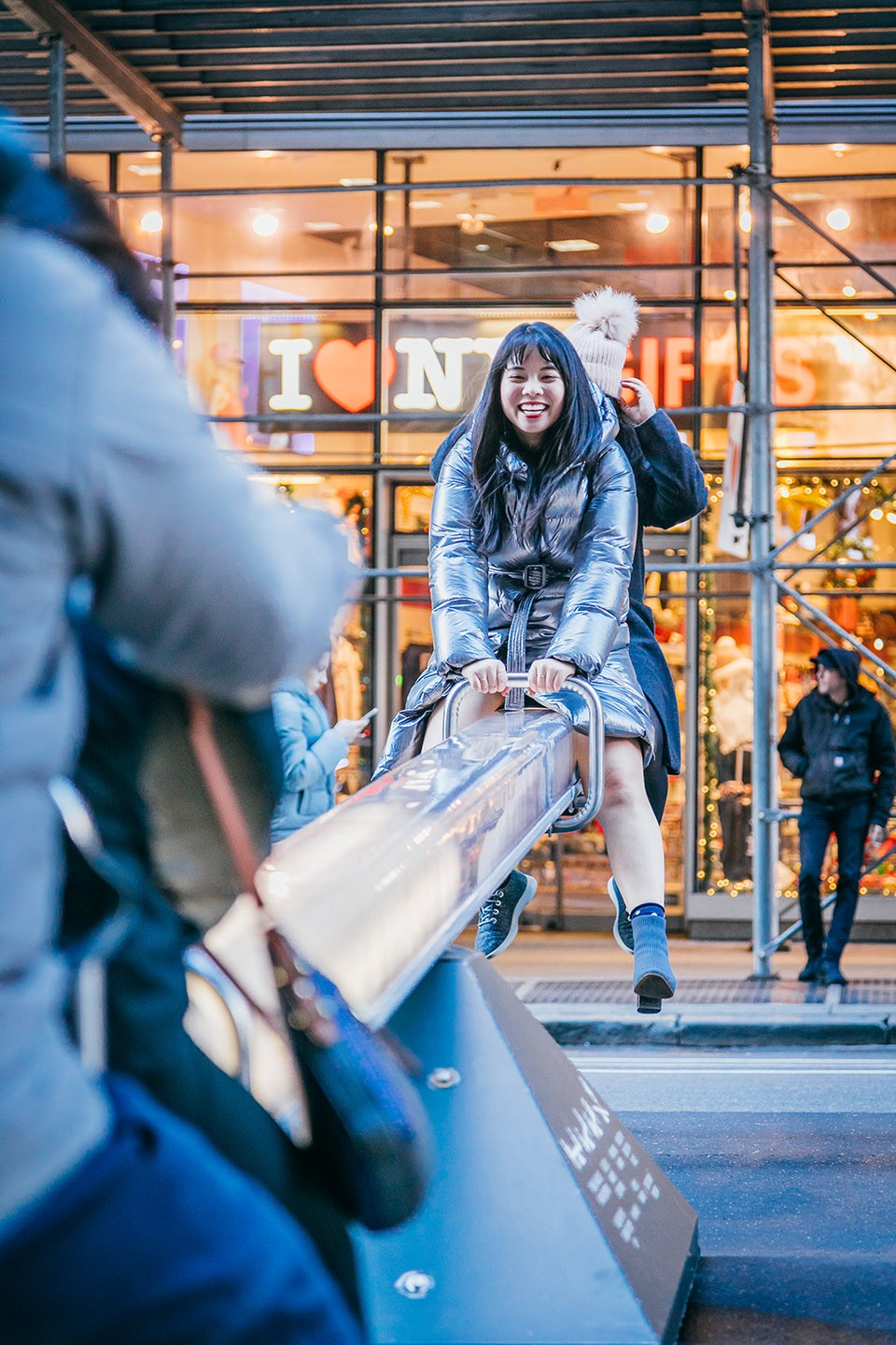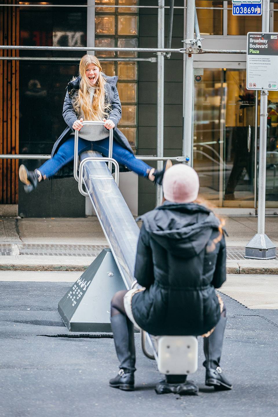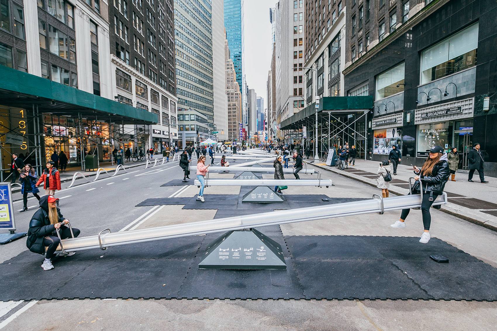當(dāng)蹺蹺板上下變化時(shí),安置于內(nèi)的揚(yáng)聲器將播放各式各樣的音樂(lè)。裝置的音量隨機(jī),并始終保持相互不同。Garment區(qū)聯(lián)盟補(bǔ)充道:“蹺蹺板不斷變化,構(gòu)成了動(dòng)態(tài)的光感和聲帶,激活并點(diǎn)亮了區(qū)內(nèi)的百老匯行人廣場(chǎng)?!?/p>