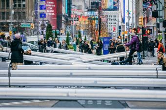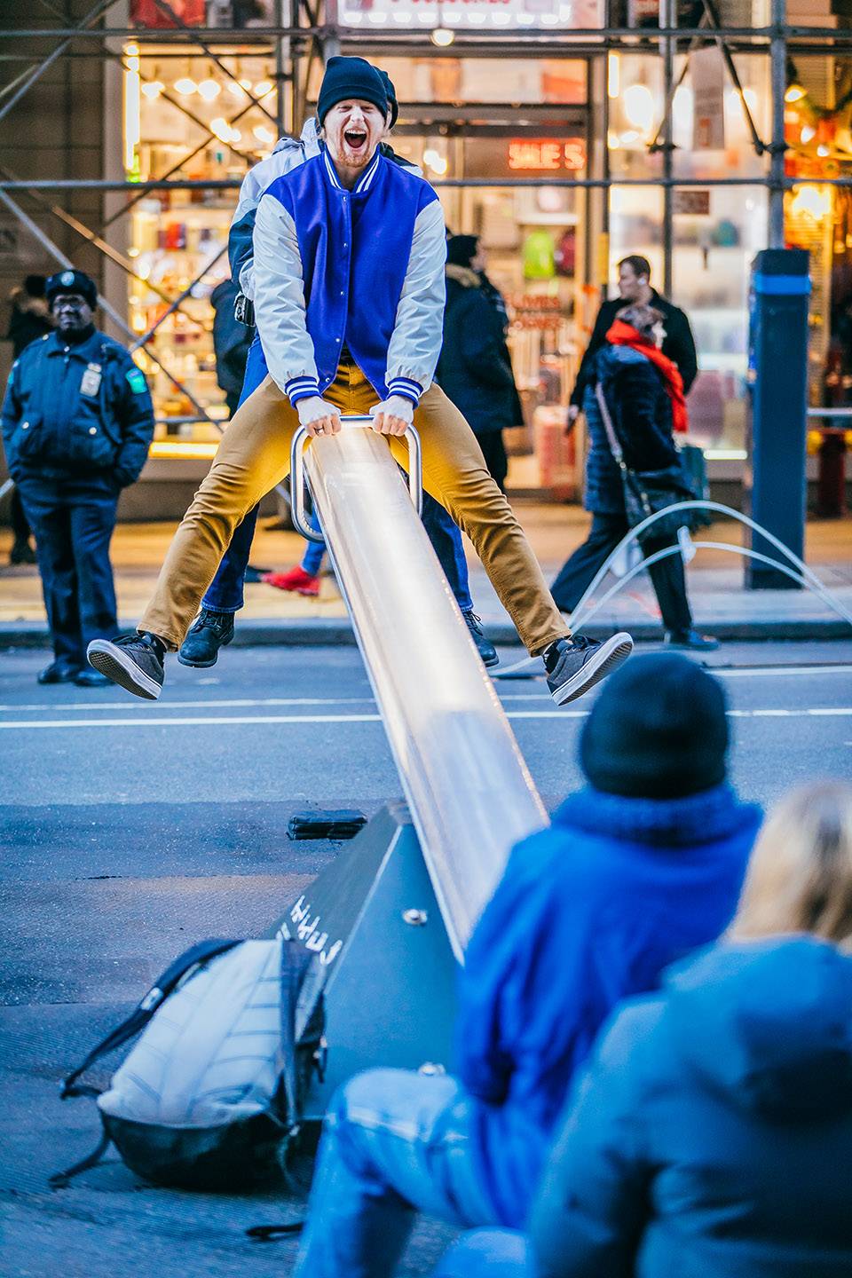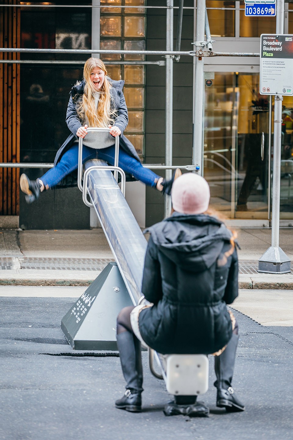 加拿大Lateral工作室設(shè)計(jì)的12個(gè)超大蹺蹺板聲光裝置被安置于紐約市區(qū)。裝置名為脈沖(Impulse),位于第37街與38街之間的百老匯大街步行廣場(chǎng),該區(qū)段現(xiàn)已禁止車(chē)輛通行。這些游樂(lè)場(chǎng)風(fēng)格玩具的長(zhǎng)度從16英尺至24英尺(4.8米至7.3米)不等。當(dāng)游客乘坐時(shí),會(huì)觸發(fā)裝置內(nèi)的聲光設(shè)施,使裝置更亮并發(fā)出音樂(lè)。