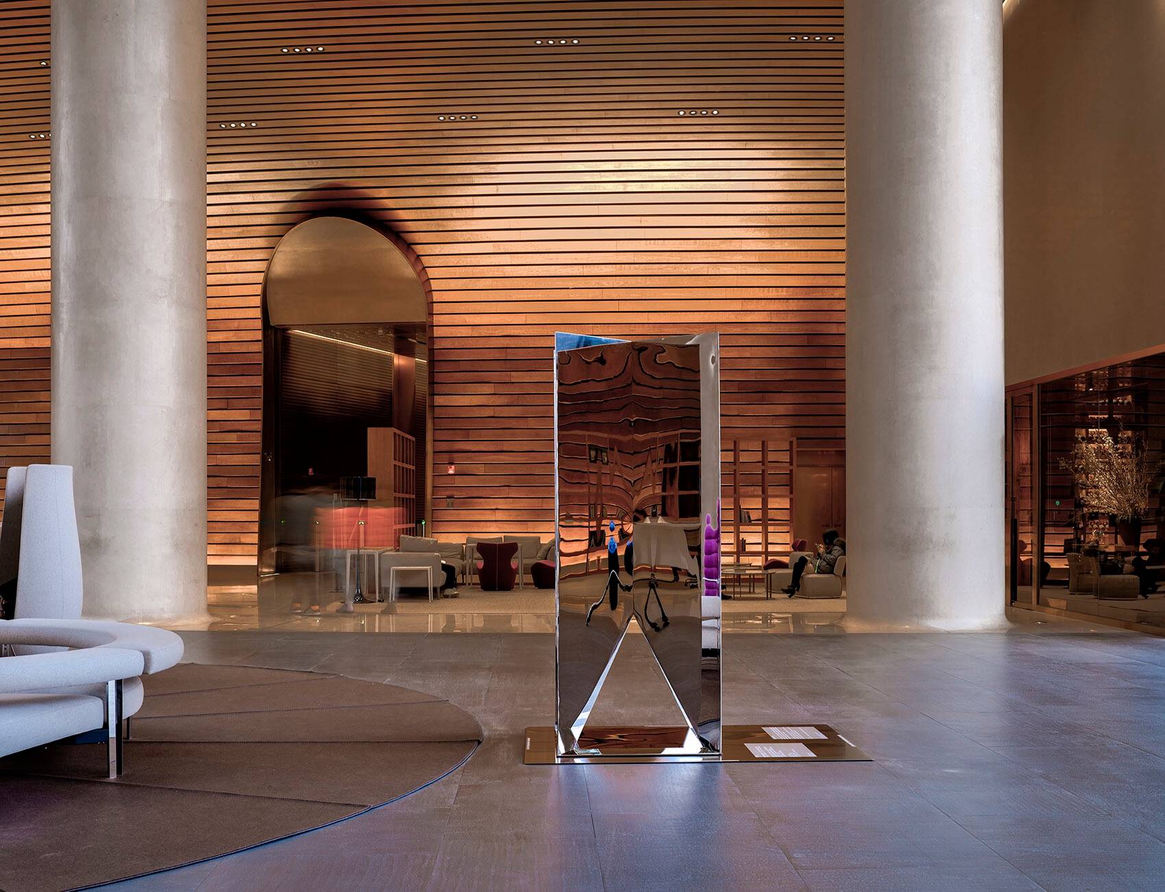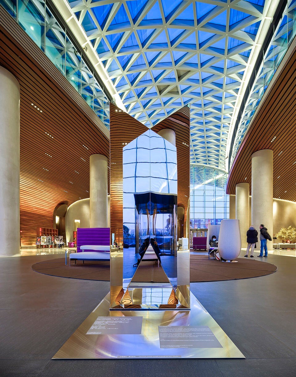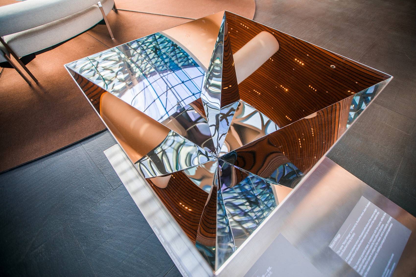 “千江月“”利用倒金字塔型呈現(xiàn)多棱角反射啟皓大堂層次豐富的天花景象,呼應(yīng)啟皓集團開放多元化的文化氛圍。作品巧妙重組了現(xiàn)代裝置材料,以通體鏡面解構(gòu)并呈現(xiàn)了空間。在作品所反饋的紛雜鏡像關(guān)系中,原有空間的立柱、曲面造型、天幕穹頂、玻璃幕墻等建筑精要得到了再度反饋,更將原空間的靈動、雅致進行再次詮釋衍射。