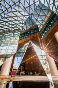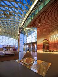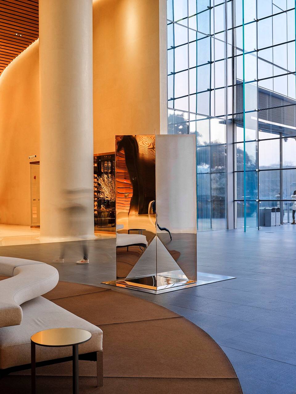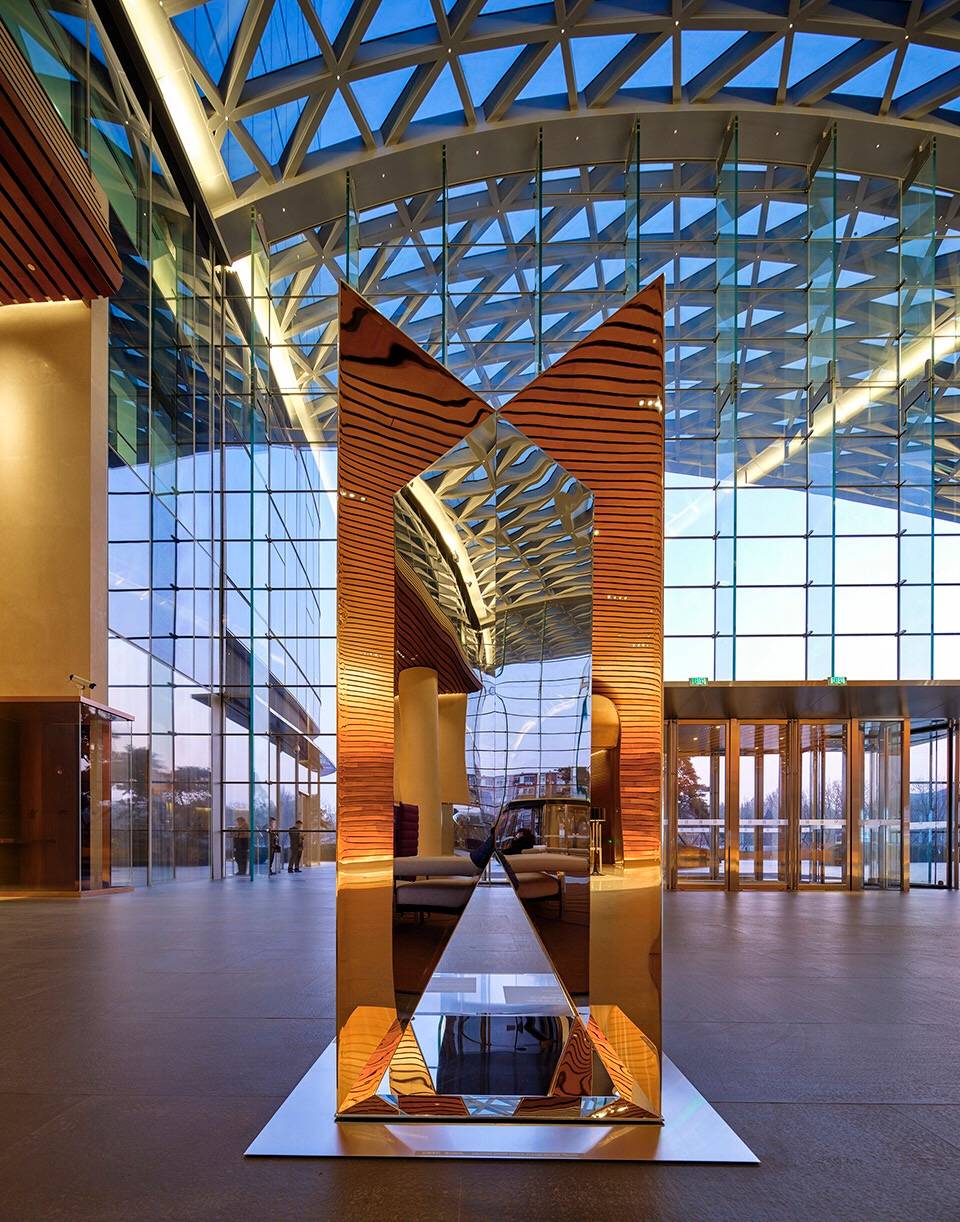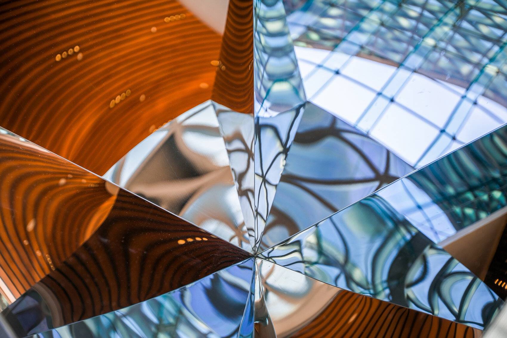 “千江月“”利用倒金字塔型呈現(xiàn)多棱角反射啟皓大堂層次豐富的天花景象,呼應(yīng)啟皓集團開放多元化的文化氛圍。作品巧妙重組了現(xiàn)代裝置材料,以通體鏡面解構(gòu)并呈現(xiàn)了空間。在作品所反饋的紛雜鏡像關(guān)系中,原有空間的立柱、曲面造型、天幕穹頂、玻璃幕墻等建筑精要得到了再度反饋,更將原空間的靈動、雅致進行再次詮釋衍射。