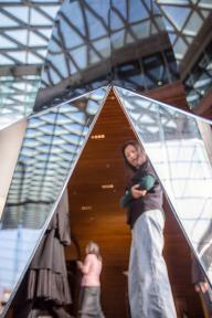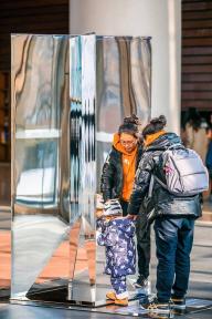 置于北側(cè)入口的另一個裝置名為“萬里天”(尺寸:1mx1mx2.2m),鏡面?zhèn)劝宓褂吵鋈藖砣送婋s的鏡像,而不變的是中間這個由”空”圍合而成的金字塔型。與作品<千江月> 兩相呼應(yīng):一個是由實面圍合而成的金字塔,另一個則是借助”空“形成金字塔形狀。一虛一實。外星探測器本身的造型和周圍的景觀形成了十分特別的對比。裝置玻璃墻體映照出熙熙攘攘川流不息的過路者,每個生命則更為鏡面中所反射的景象增添了動感和變化。視覺本身帶來一種思考,而參觀者倘徉其中,也會對真實與幻象產(chǎn)生思索。