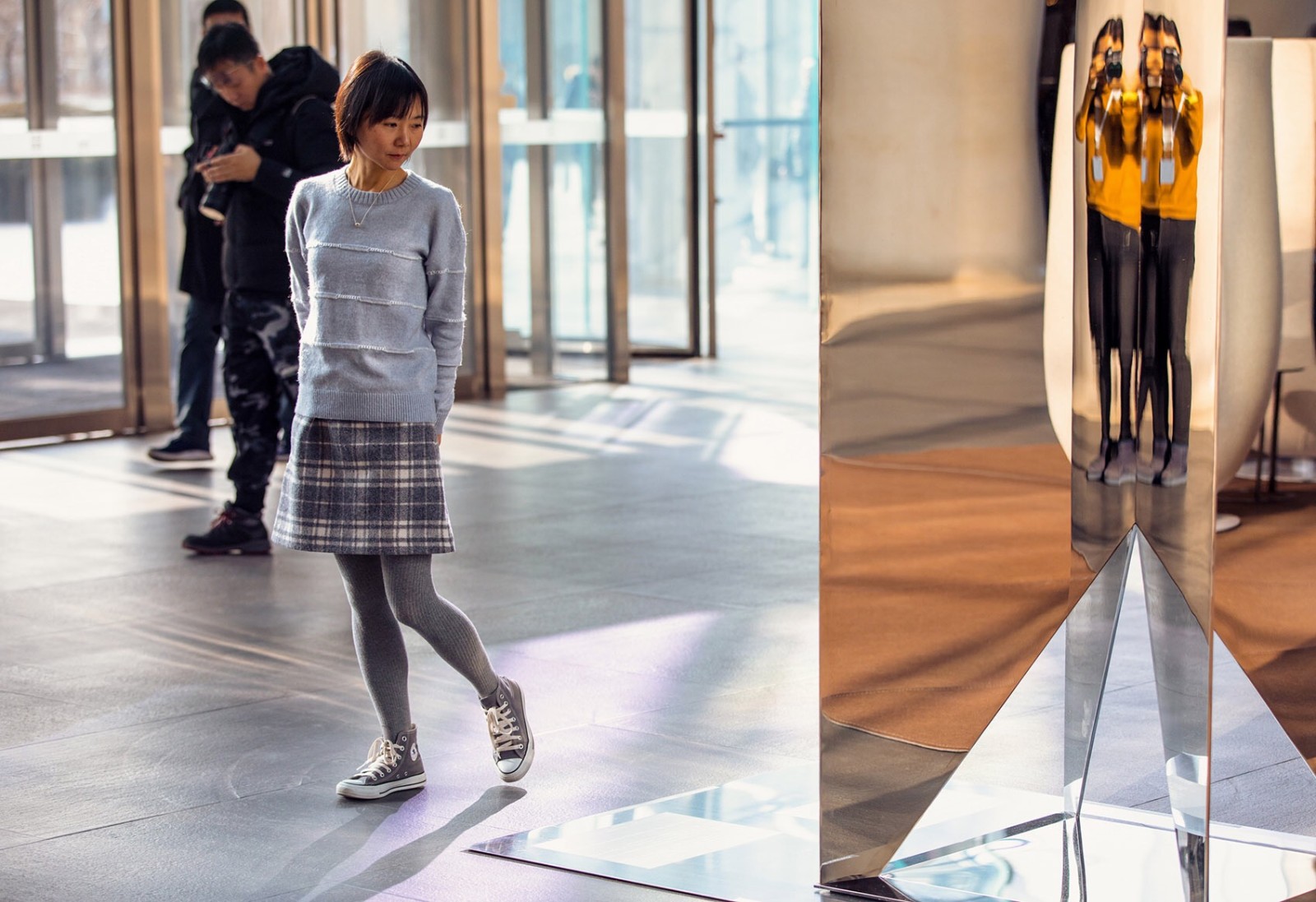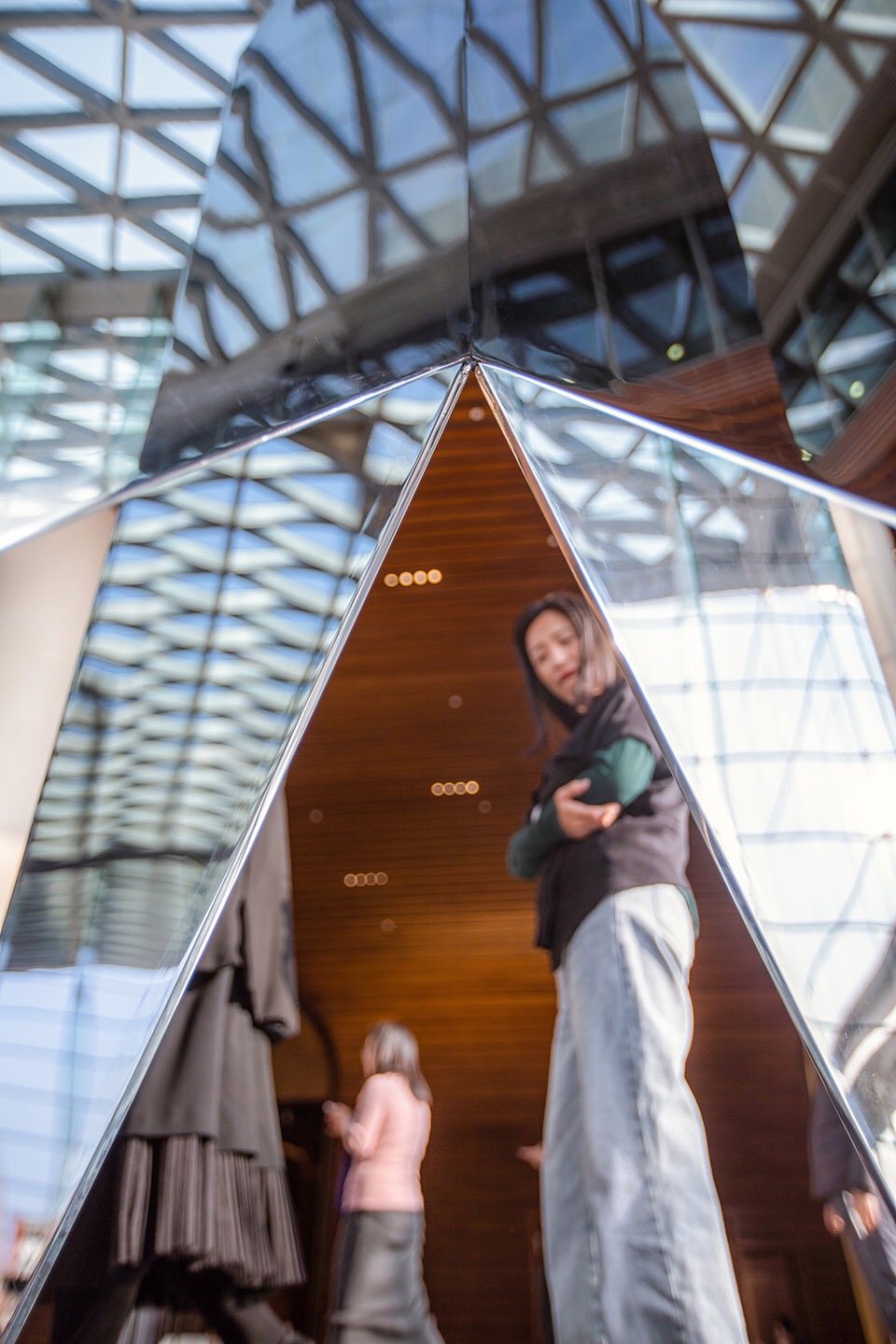 裝置玻璃墻體映照出熙熙攘攘川流不息的過路者,每個生命則更為鏡面中所反射的景象增添了動感和變化。視覺本身帶來一種思考,而參觀者倘徉其中,也會對真實與幻象產(chǎn)生思索。