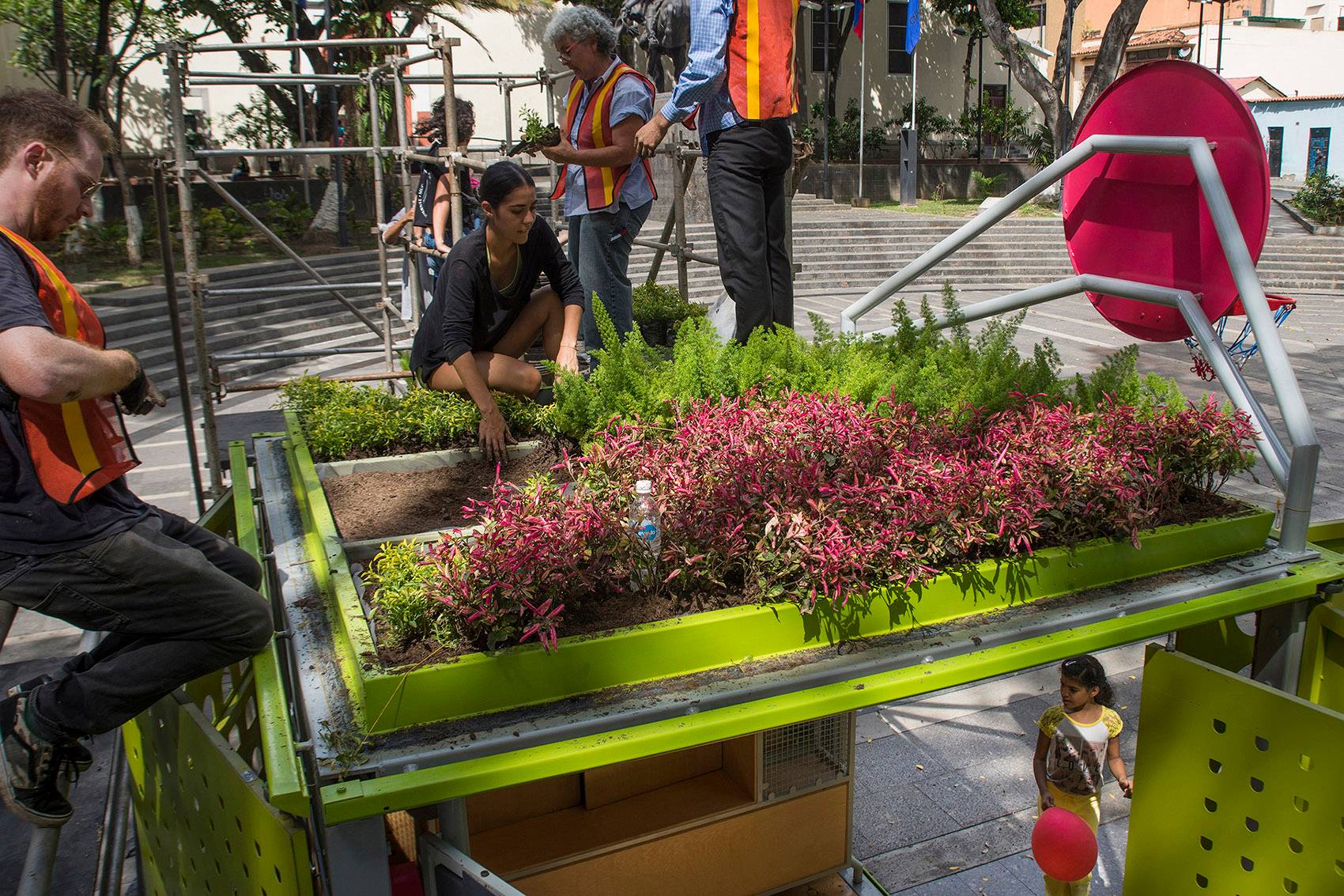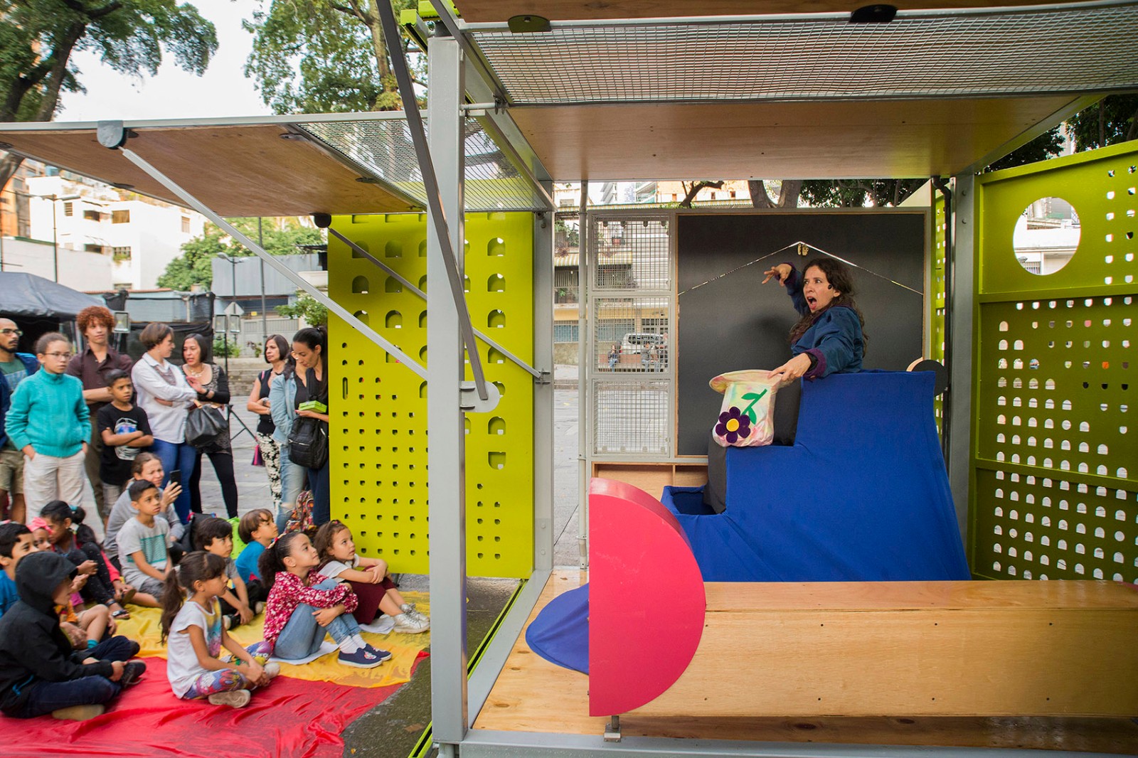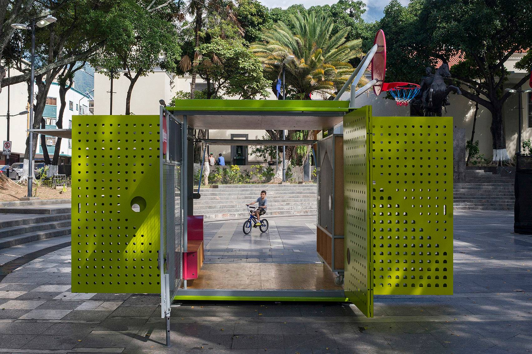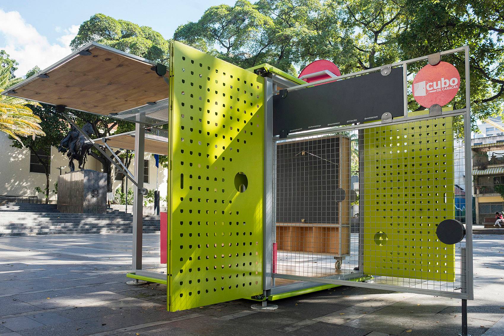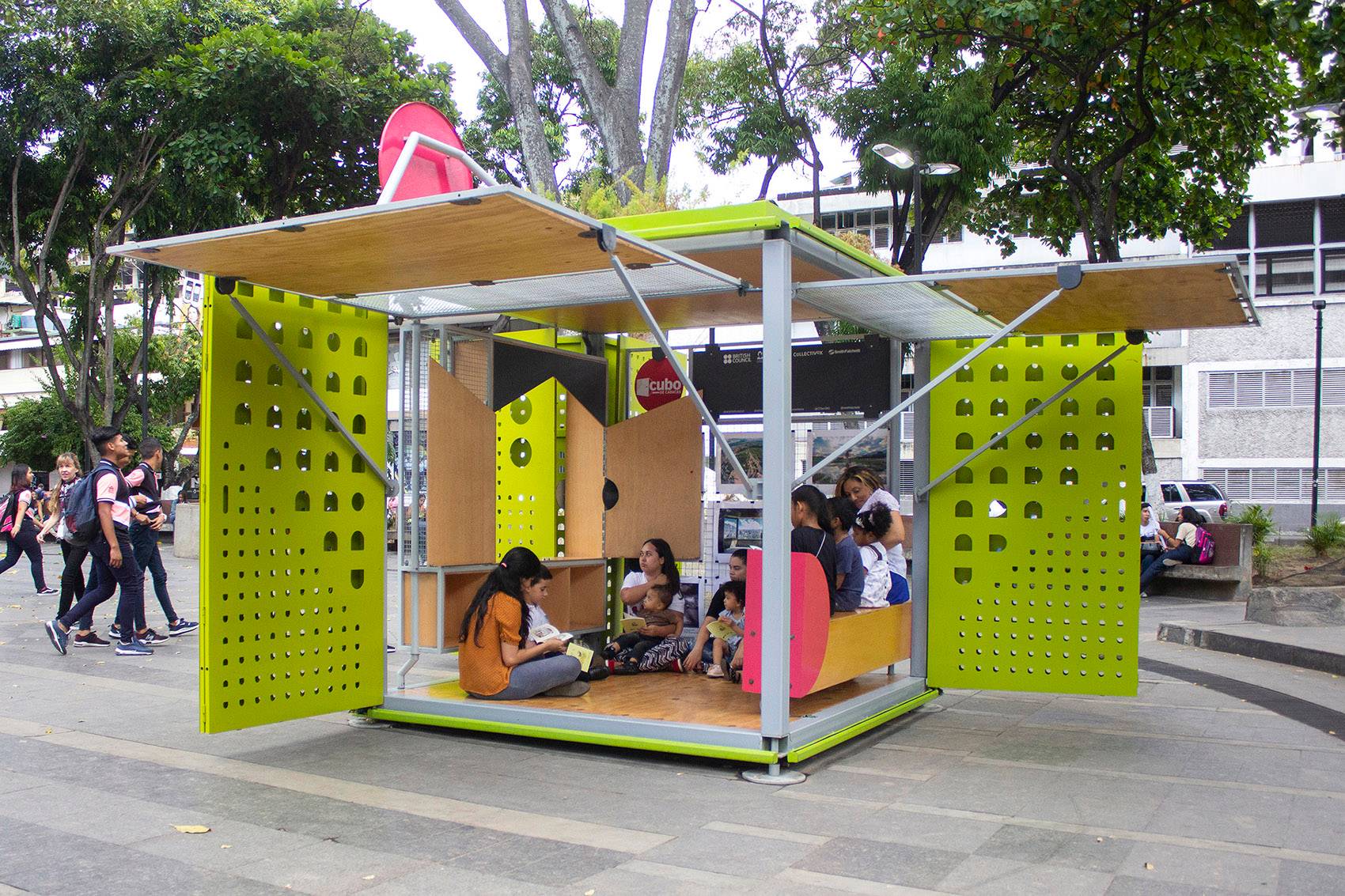 該裝置由來自倫敦的建筑師Will Sandy和來自加拉加斯的公司Incursiones共同設計,是一個小型的預制結構,可以為人們提供非正式的公共聚集空間。這個可移動的多功能立方體空間旨在促進社會、文化和教育之間的交流,為人們提供了一個實時的社區(qū)集會場所。