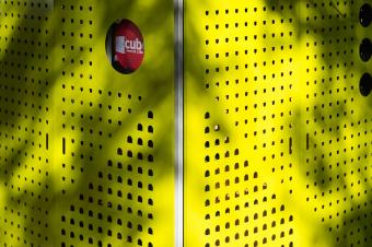▲裝置局部,采用黃色的穿孔金屬面板作為外圍護結構
