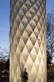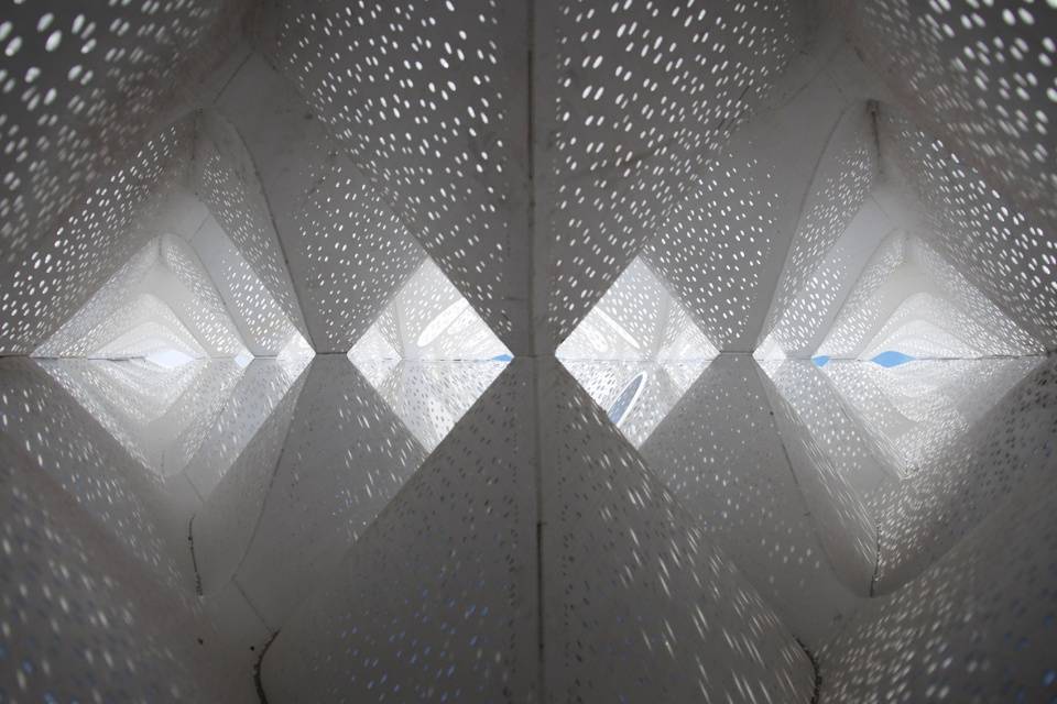 所有的結(jié)構(gòu)強(qiáng)度均是雕塑的外殼結(jié)構(gòu)所固有的。該項(xiàng)目利用了名為“貝殼花邊結(jié)構(gòu)”的仿生技術(shù),由Tonkin Liu首創(chuàng)并與Arup經(jīng)過了八年的共同開發(fā)。這種結(jié)構(gòu)以軟體動(dòng)物的外殼為參照,其曲率、波紋和扭曲導(dǎo)致了形式和強(qiáng)度之間的直接關(guān)系,從而消除了不必要的結(jié)構(gòu)。一體化的表面是由被彎曲的平板連接而成,是為形成剛性結(jié)構(gòu)而特別打造。