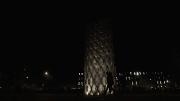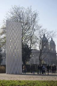 這座“雕塑”高10米,由厚度僅為4mm的薄板構(gòu)成。在4米寬的平面中心,雕塑的前后深度僅為1米,并在兩個(gè)開放的邊緣逐漸變細(xì)至10厘米。參觀者可以從這些邊緣看見結(jié)構(gòu)的構(gòu)成方式:兩個(gè)弧形的波紋狀表面相互連接在一起,不需要借助任何其他的內(nèi)部支撐結(jié)構(gòu)。