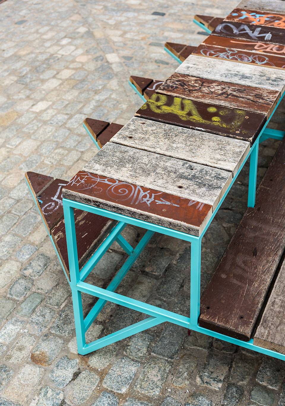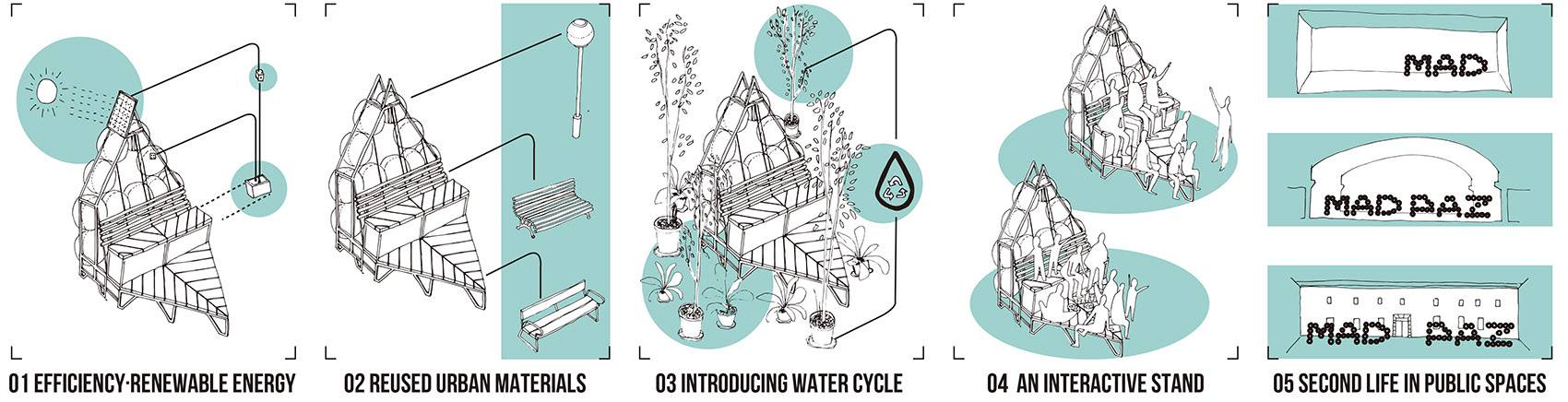 整套可持續(xù)的城市家具都是根據(jù)重復(fù)利用、易于發(fā)掘和可移動(dòng)的邏輯所構(gòu)建的。設(shè)計(jì)團(tuán)隊(duì)通過回收市議會(huì)倉庫中的廢棄燈具,搭配著由太陽能電池板供電的新LED元件,創(chuàng)造出一個(gè)全新的照明和標(biāo)識(shí)系統(tǒng),并將其與家具體量的金屬框架結(jié)合在了一起。此外,這個(gè)城市家具系統(tǒng)還包括了一系列座椅空間。這些座椅的材料都是從馬德里廢棄的木制長(zhǎng)凳中回收回來的,以前曾被毫無意義地堆積在市議會(huì)的家具倉庫中。總而言之,這一系列舉措都為其他以可持續(xù)和社交設(shè)計(jì)為基礎(chǔ)的項(xiàng)目提供了創(chuàng)造性的邏輯思維和寶貴的經(jīng)驗(yàn)。