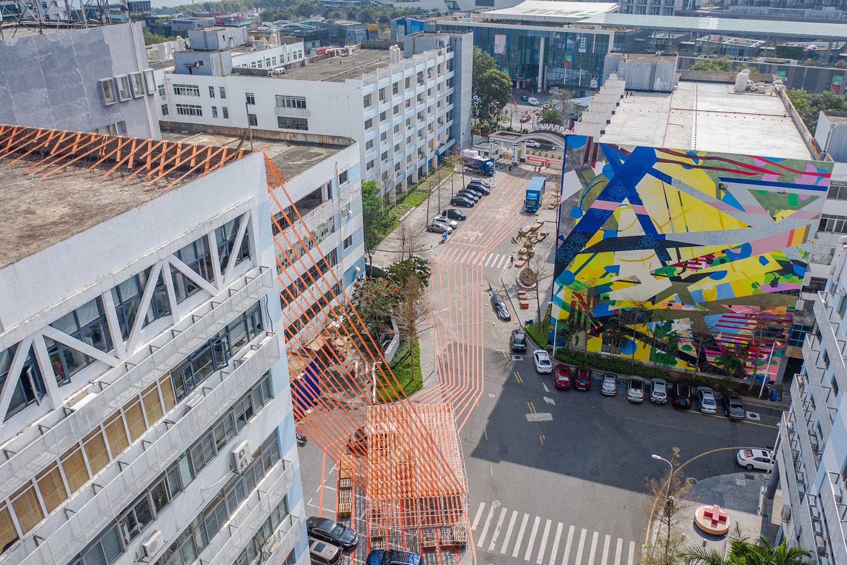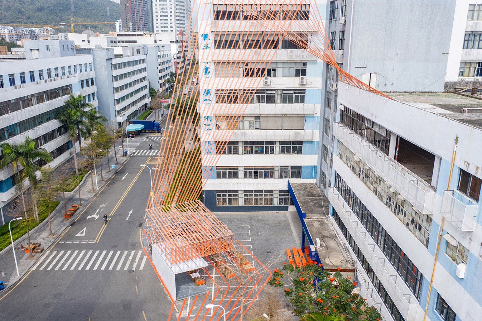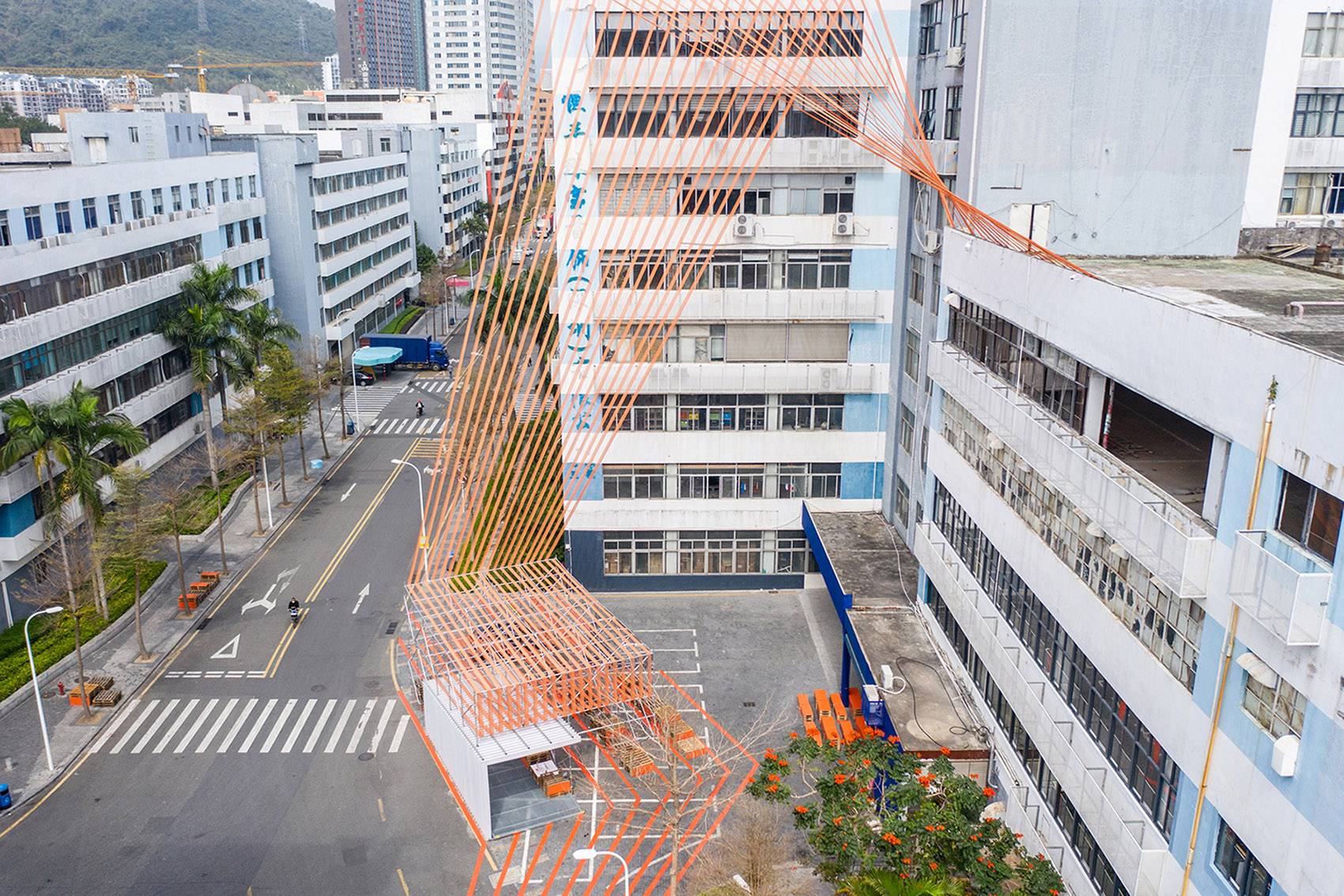戶外裝置《對(duì)流》將城市中的’流’(Streams)可視化,形成地面與空中的線條,詮釋展覽主題“對(duì)流城市”。裝置取材保稅區(qū)內(nèi)常見(jiàn)的材料,成為整個(gè)裝置的造型元素?!鳌木€條引領(lǐng)觀眾從保稅區(qū)西門進(jìn)入,引導(dǎo)視覺(jué)延伸至空中,線條兩側(cè)地面的街道家具由木托盤制作,將激活園區(qū)的公共空間。