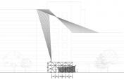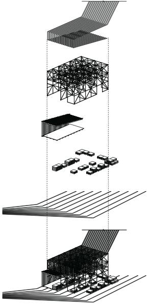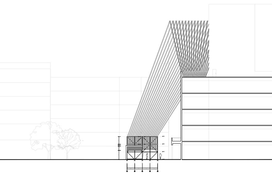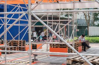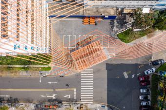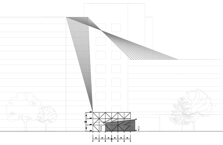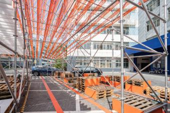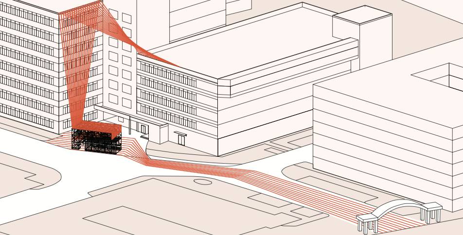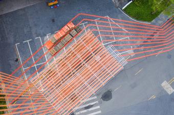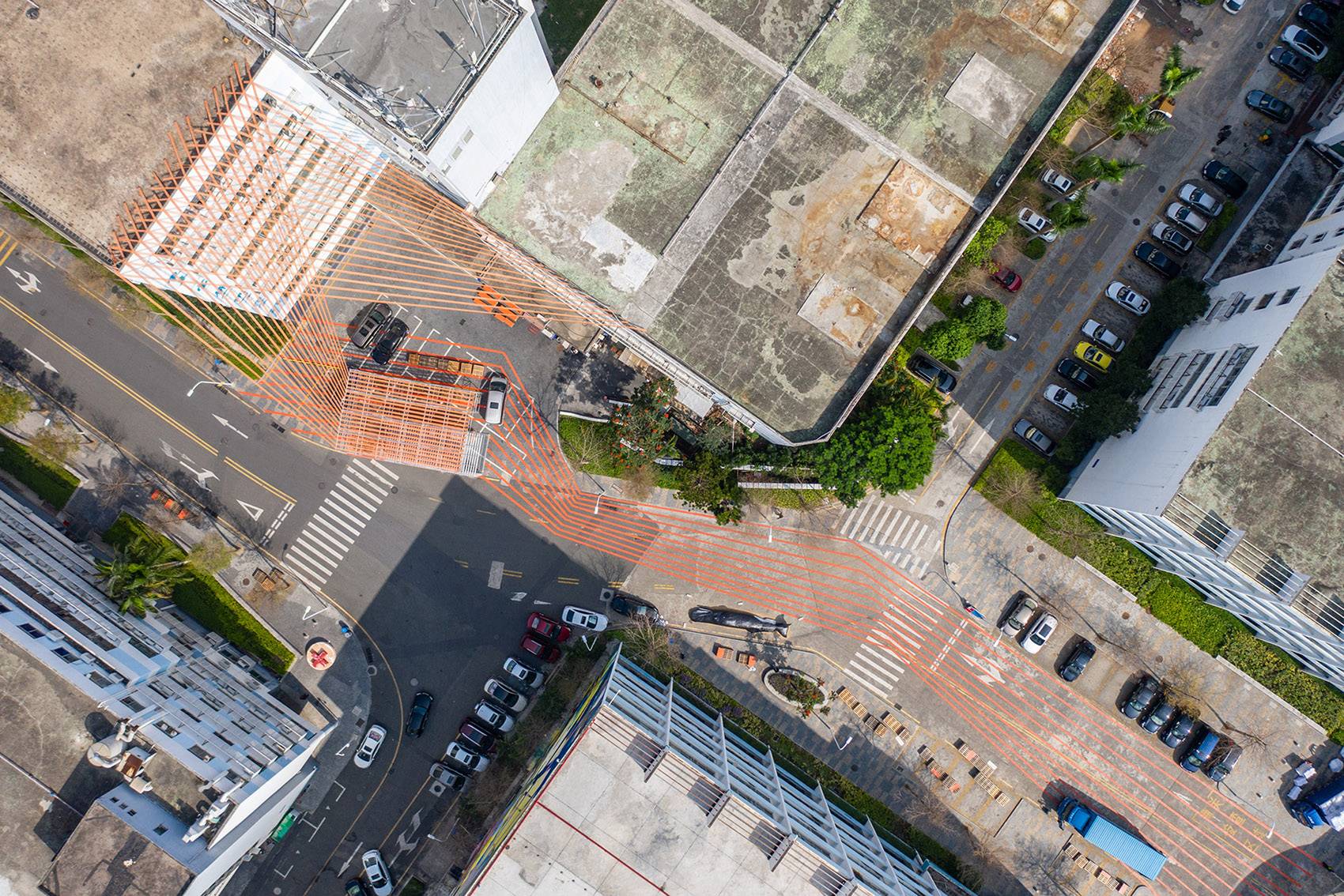 戶外裝置《對(duì)流》將城市中的’流’(Streams)可視化,形成地面與空中的線條,詮釋展覽主題“對(duì)流城市”。裝置取材保稅區(qū)內(nèi)常見(jiàn)的材料,成為整個(gè)裝置的造型元素?!鳌木€條引領(lǐng)觀眾從保稅區(qū)西門進(jìn)入,引導(dǎo)視覺(jué)延伸至空中,線條兩側(cè)地面的街道家具由木托盤制作,將激活園區(qū)的公共空間。