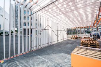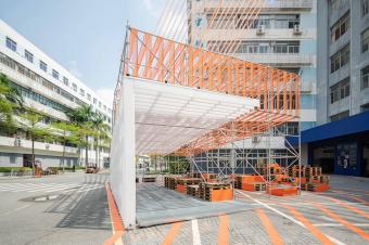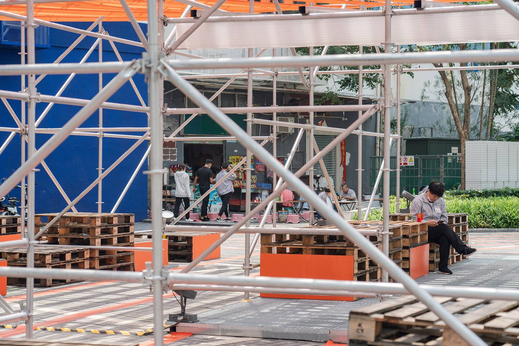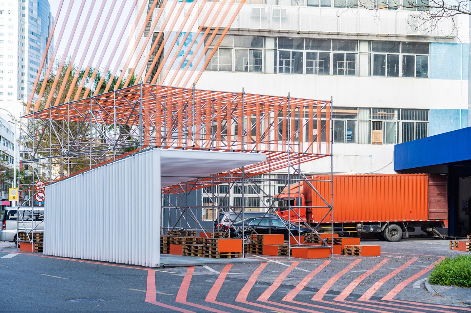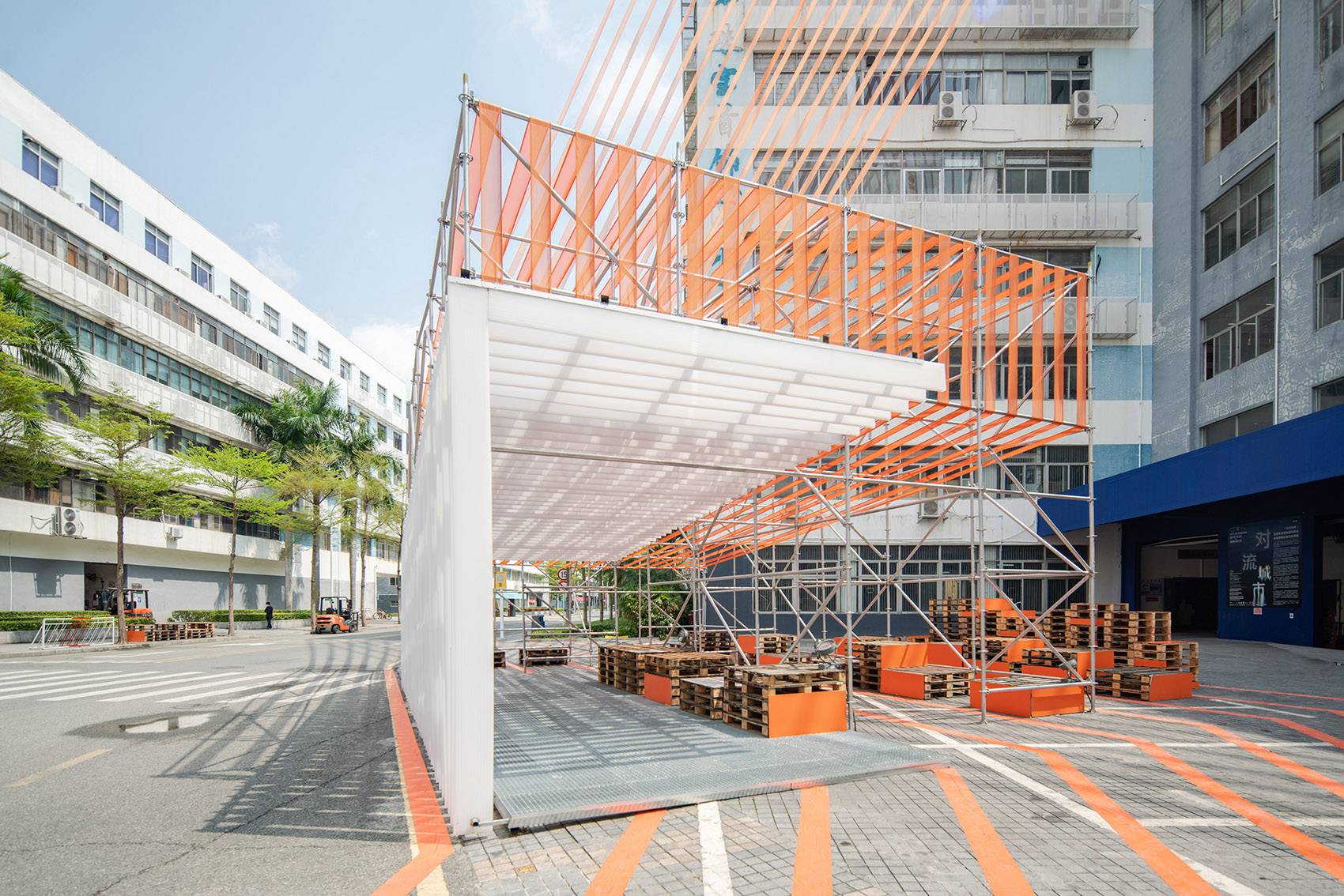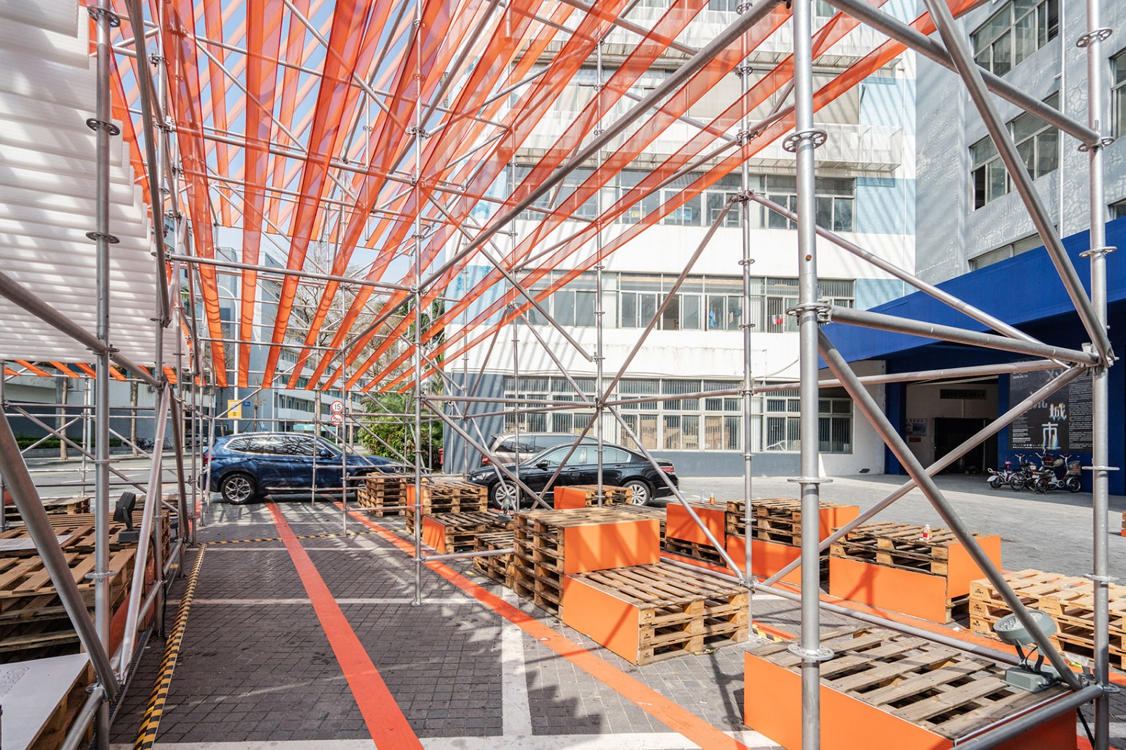室內(nèi)展場(chǎng)入口處的涼亭使用雷亞架作為主要結(jié)構(gòu),具有高度通透感。訪客可以在此稍事休息,展覽的戶外活動(dòng)也可以在這里舉行,如同保稅區(qū)的“城市客廳”,容納各種即將到來(lái)的展覽活動(dòng)。