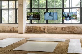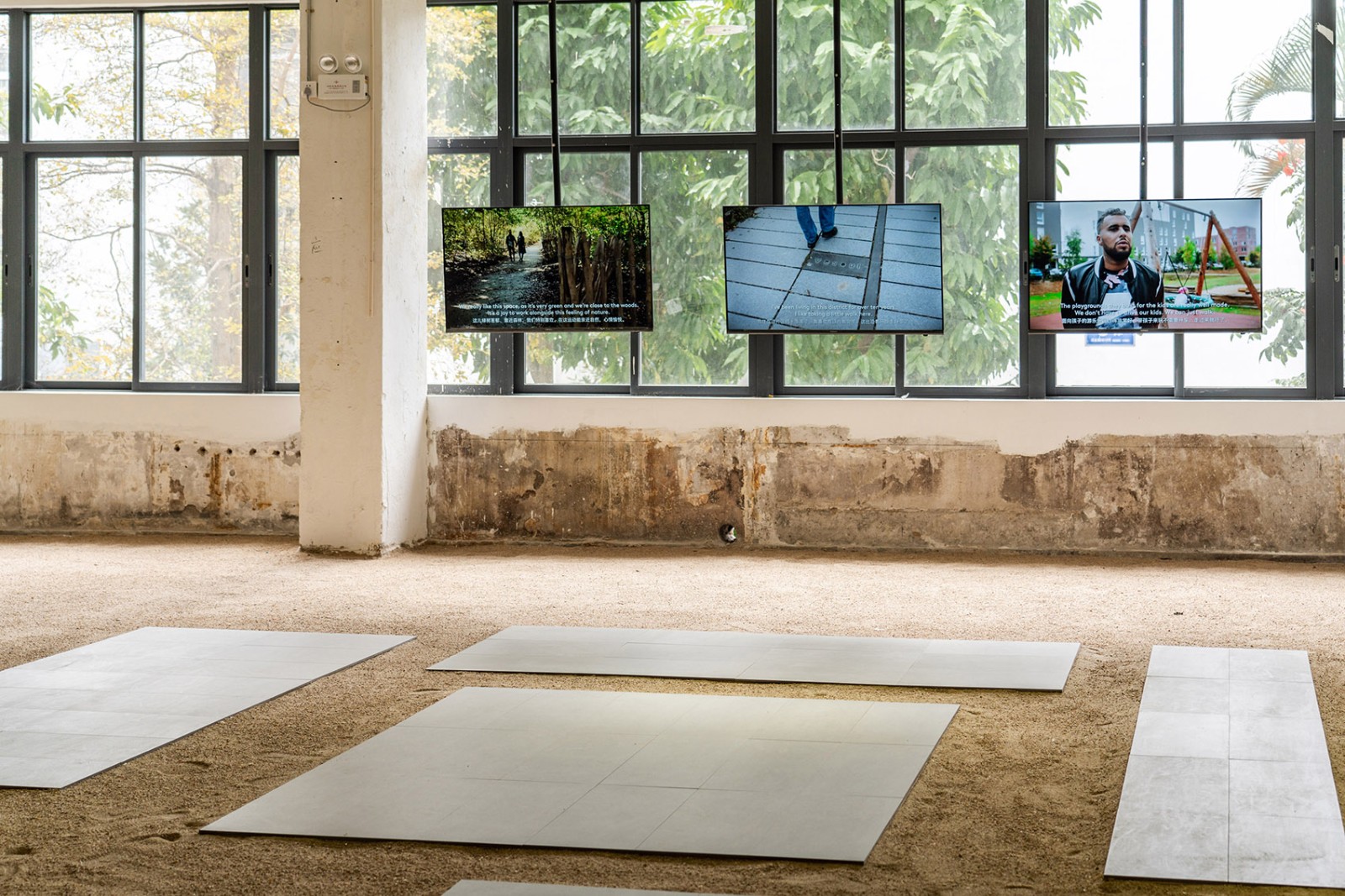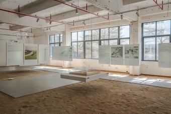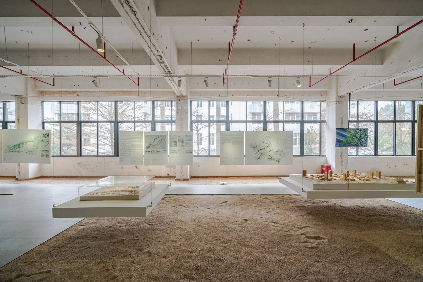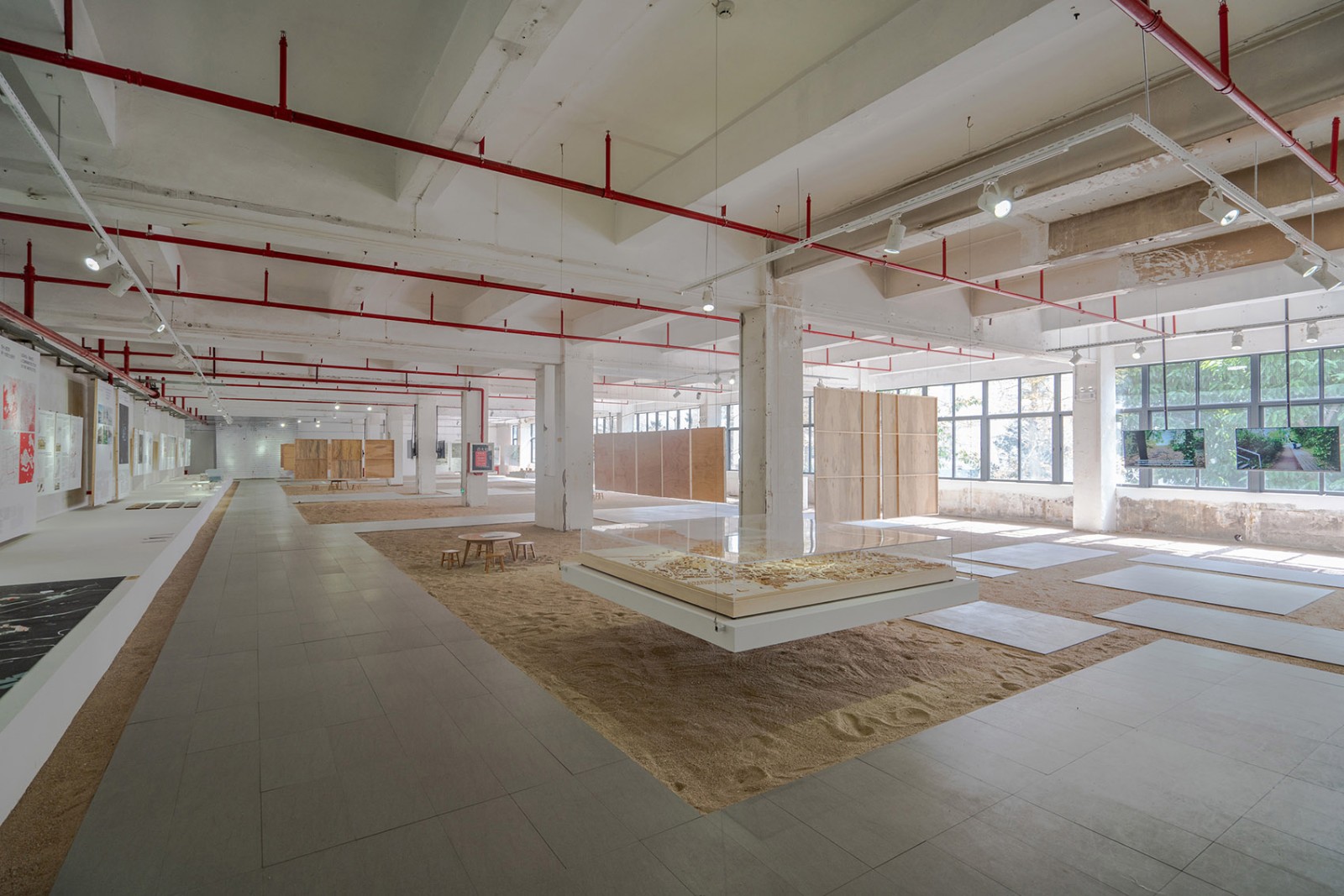 室內(nèi)展場(chǎng)設(shè)計(jì)突顯了工業(yè)空間的特色:大量未經(jīng)修飾的水泥墻與斑剝的柱子被保留下來(lái),地上的破洞與清不走的零件全部使用沙子遮蓋,形成了一個(gè)粗糙又統(tǒng)整的美感,也呼應(yīng)鹽田的海灘印象。沙地上用水泥磚的鋪面形成參觀與漫游的路徑,把所有的空間連成一體。展架以及展覽的呈現(xiàn)都使用純白色的量體,不論是模型、展版、電子屏幕,全部都懸吊在空中。所以整個(gè)展覽空間是非常通透的,極簡(jiǎn)與粗糙的元素相互穿插,形成極具特色的展覽空間。