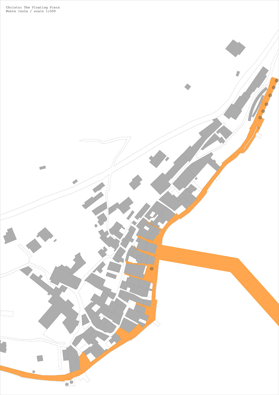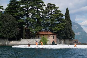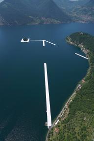 2016六月,200,000塊高密度聚乙烯方體將被連接在一起,形成面積高達(dá)70,000平方米的浮橋裝置,為意大利北部伊塞奧湖區(qū)增添一抹亮麗的風(fēng)采。這個(gè)由Christo設(shè)計(jì),16米寬,50厘米厚的浮橋系統(tǒng)總長(zhǎng)3公里,游客們將在隨著波浪微微搖擺的浮橋上漫步前行,從湖畔的小鎮(zhèn)Sulzano到達(dá)Monte Isola再前往被浮板所環(huán)繞的小島San Paolo。蜿蜒曲折步行系統(tǒng)的引導(dǎo)著人們從不同的角度欣賞這美麗的湖光山色。而登上環(huán)繞湖區(qū)的山脈,則可從空中俯瞰這道獨(dú)特的風(fēng)景線。而亮黃色的橋面布料也將延伸進(jìn)入城市,覆蓋Sulzano和Peschiera Maraglio1.5公里的步行街道。
