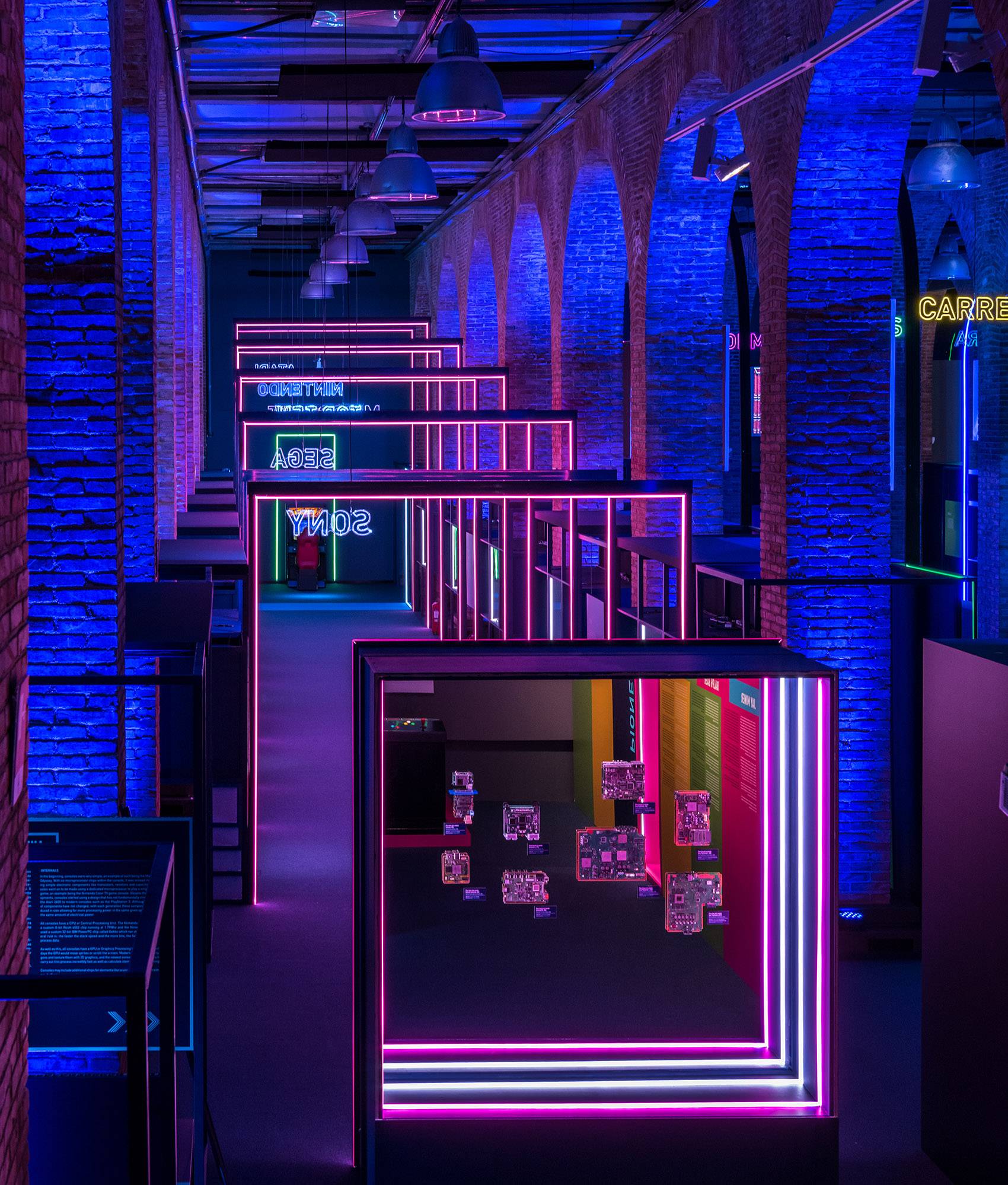 展覽呈現(xiàn)了來(lái)自重要收藏家的400件原始版本游戲機(jī)和繪畫作品,并邀請(qǐng)觀眾在現(xiàn)場(chǎng)體驗(yàn)150款電子游戲。項(xiàng)目的主要挑戰(zhàn)在于理解訪客與兩種對(duì)立又相互依賴的體驗(yàn)之間的互動(dòng)方式:一方面要營(yíng)造“游戲室”般嘈雜而活躍的氛圍,另一方面則要保持展覽所需的安靜且有序的環(huán)境,以便觀者能夠充分地了解關(guān)于電腦游戲的歷史。