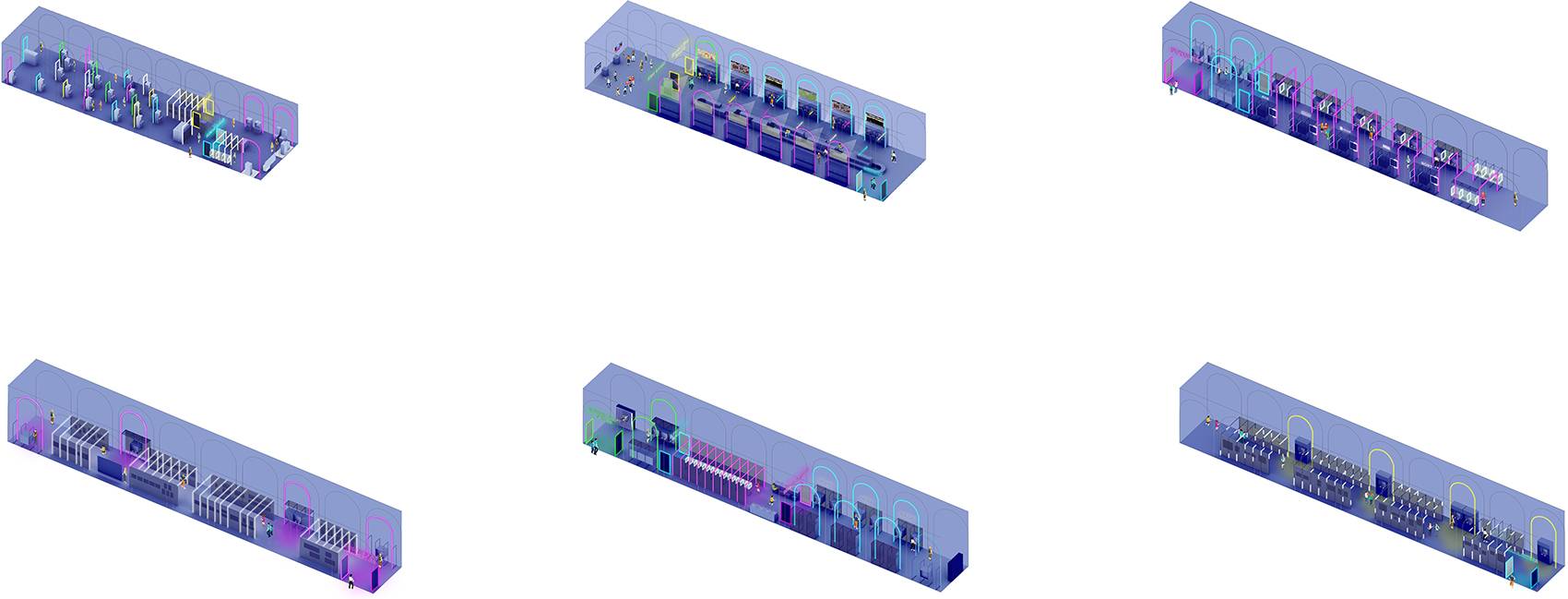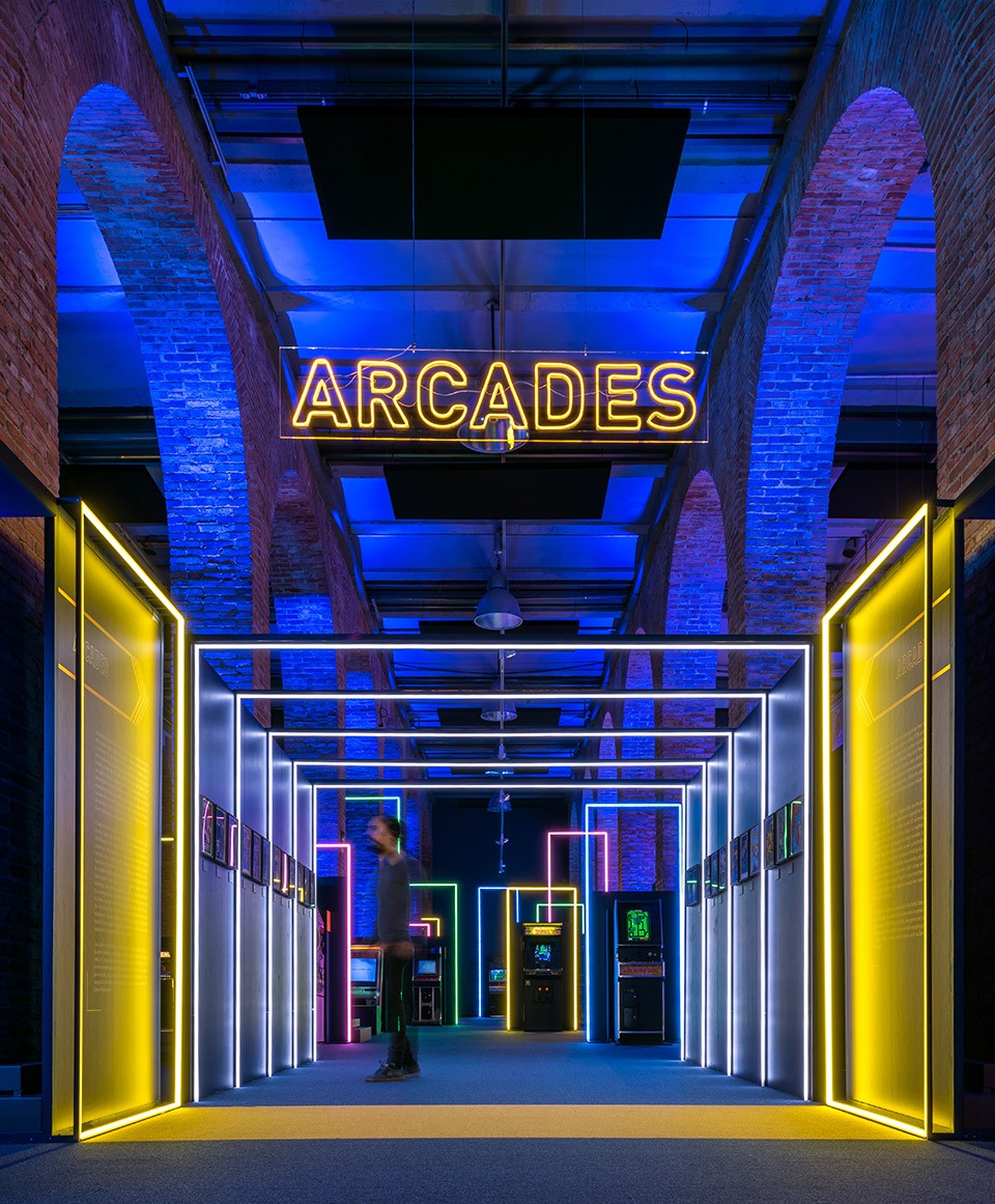 通過(guò)概念化的處理,兩種空間類型與水庫(kù)的原始結(jié)構(gòu)形成了不同的對(duì)話:在第一個(gè)類型中,一系列被彩色燈光照亮的拱形結(jié)構(gòu)容納著150款電子游戲機(jī),與既有展廳的空間秩序保持了一致,同時(shí)為電力維護(hù)裝置的優(yōu)化和控制提供了簡(jiǎn)潔而靈活的系統(tǒng);在第二個(gè)空間,一組燈光隧道為400件原始藏品提供了展示空間,創(chuàng)造出安靜的觀看和學(xué)習(xí)環(huán)境。