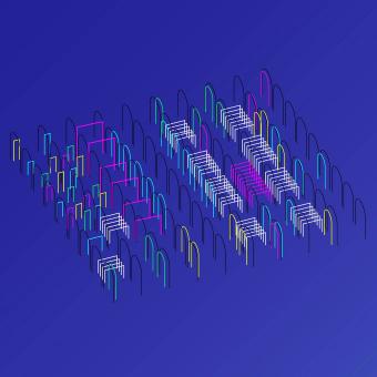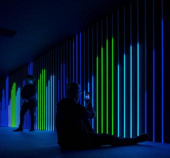 由重復(fù)元素和色彩組合創(chuàng)造出的視角促生了變化的氛圍,并以此致敬了極簡(jiǎn)主義藝術(shù)家Dan Flavin標(biāo)志性的熒光燈管裝置作品。