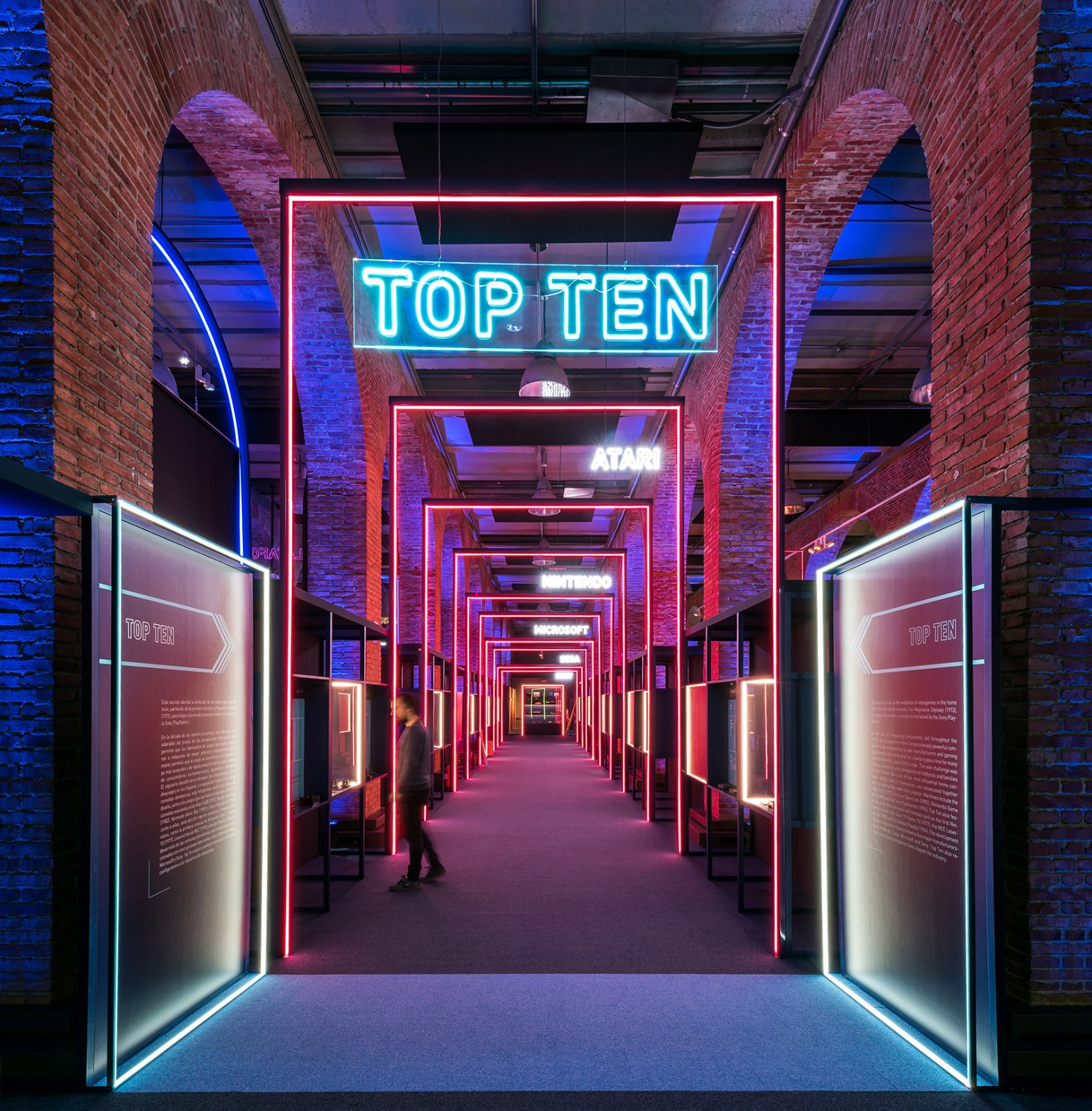 這種矢量美學(xué)是營(yíng)造電子游戲場(chǎng)景的一個(gè)重要參照點(diǎn),同時(shí)也是本次展覽空間概念的出發(fā)點(diǎn)所在。一系列彩色線性LED燈與不同的幾何形狀相配合,定義出每個(gè)展區(qū)的主題特征。漂浮的霓虹燈字牌起到引導(dǎo)游客的作用,同時(shí)與游戲機(jī)的計(jì)分系統(tǒng)相結(jié)合,讓人直觀地聯(lián)想到那些出現(xiàn)在古舊屏幕角落的經(jīng)典字體。