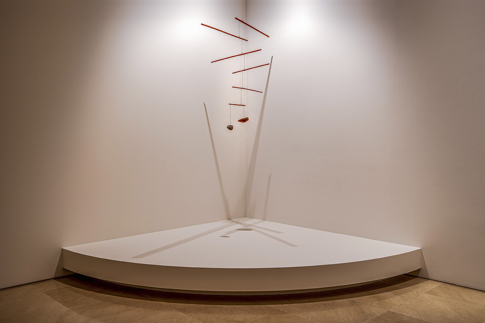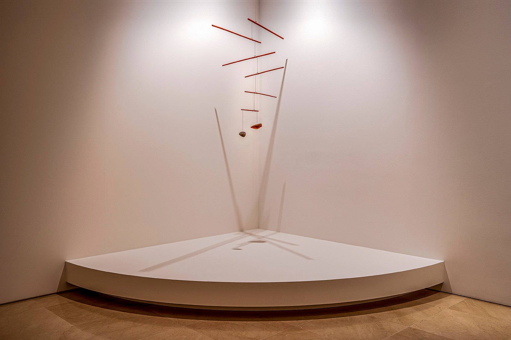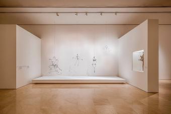 由于展出的許多作品都十分輕盈,團(tuán)隊(duì)面臨的挑戰(zhàn)之一就是如何更好地呈現(xiàn)那些幾乎看不見的物件。在展覽中,有好幾件作品都是用金屬絲從天花板上吊下來的,幾乎不占用空間。這也是為什么在展覽設(shè)計(jì)中,你可以看到地上平臺(tái)、展示墻面等離散而又巨大的建筑元素,它們在襯托作品的同時(shí),也實(shí)現(xiàn)了以下幾種功能: