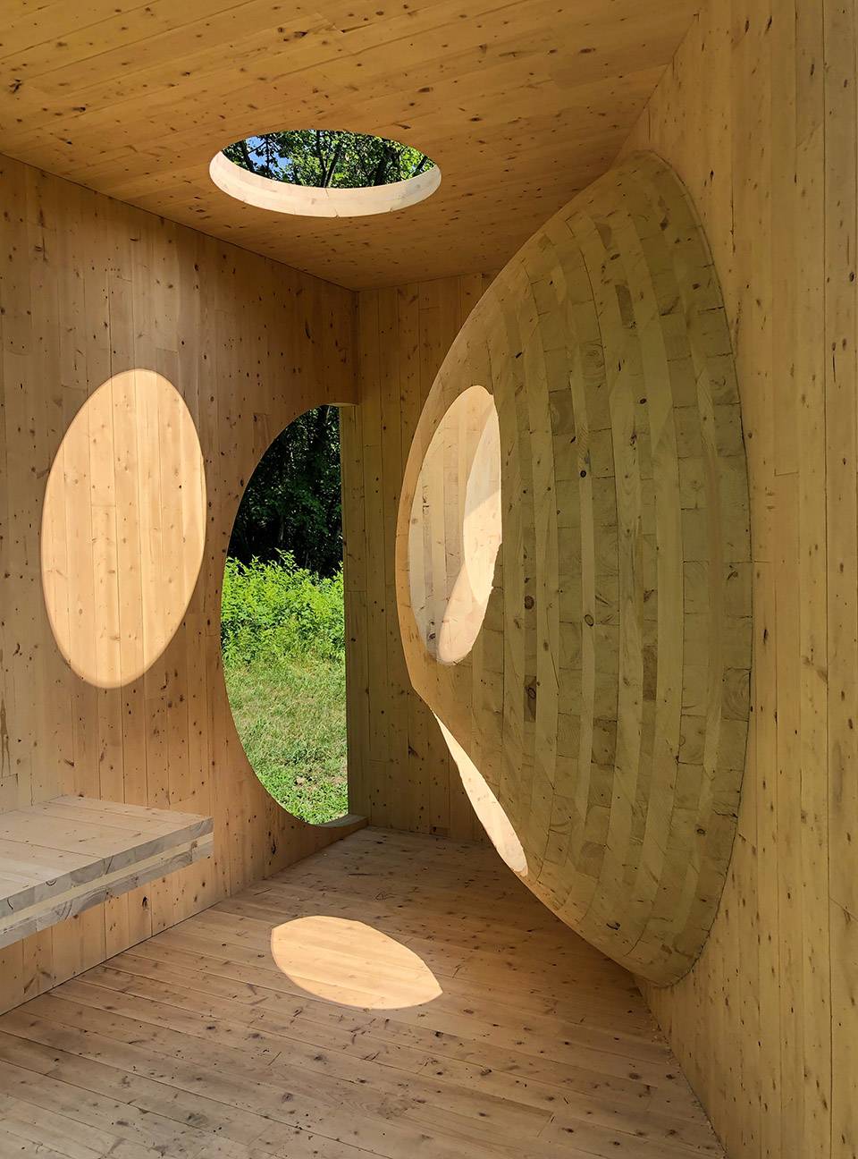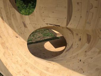 ▲OBLIN雕塑,由木板層層疊合制成