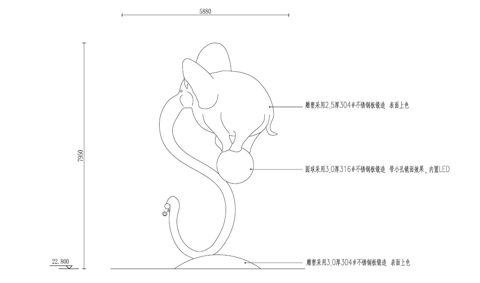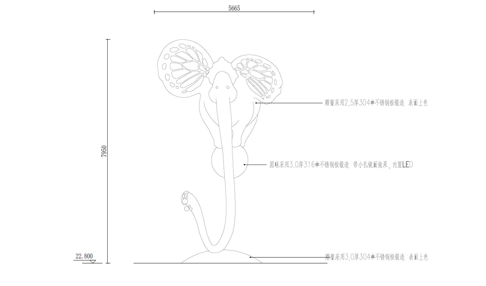 雕塑專注于人們的文化認(rèn)知感,材料使用鋼材304+316的不銹鋼板,大象鼻子使用Q355B型號的特殊鋼管,結(jié)構(gòu)上保證安全性,另外把原來鼻子的設(shè)計鋼管由12mm提升到16mm,安全系數(shù)整整增加一倍。