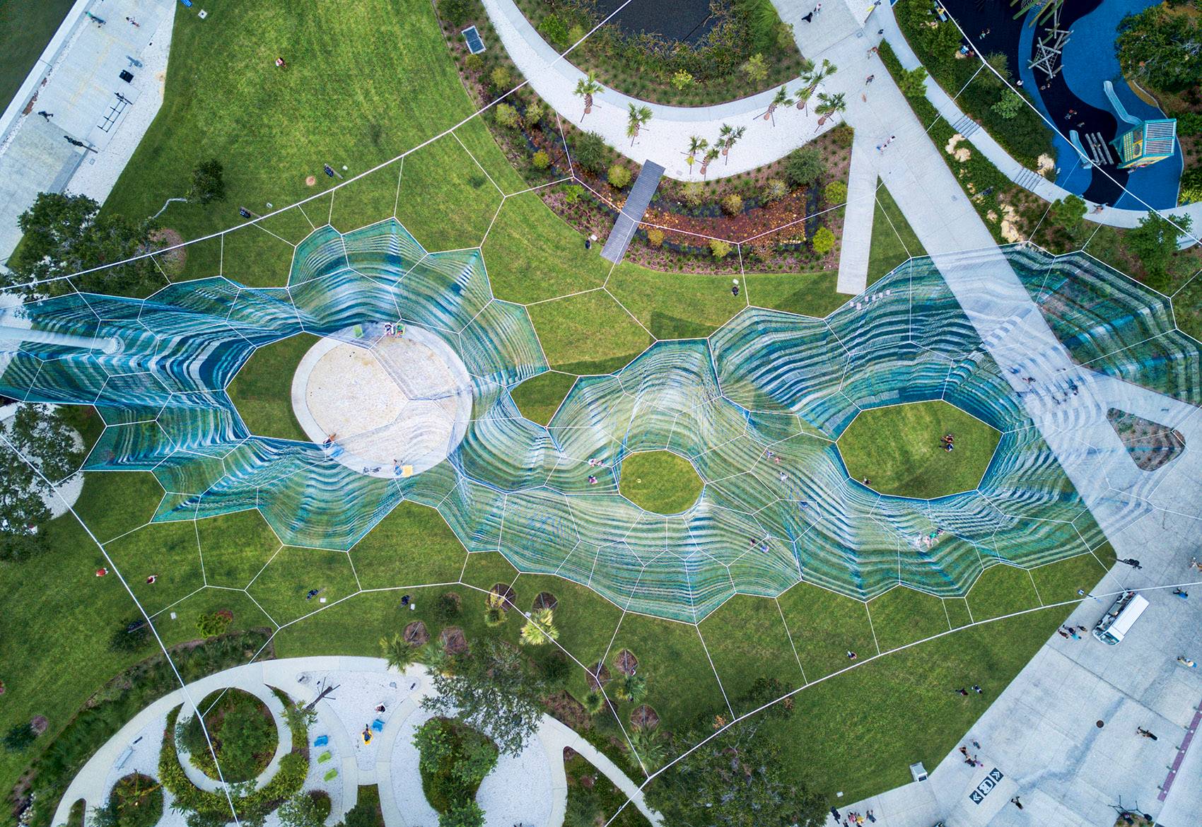 作為公私合營的項目,該纖維雕塑由私人捐助者出資,而其相關(guān)的基礎(chǔ)設(shè)施與公園建設(shè)則被納入9200萬美元的 Pier District 市政規(guī)劃項目中。這座巨大的雕塑完全由輕質(zhì)纖維制成,可承受150 mph的風(fēng)速,桅桿的最大承受力可達65噸。繩索由纖維編織而成,強度是鋼的15倍。這種材料也被NASA用于系鏈火星探測車。平面上,該雕塑的網(wǎng)面覆蓋了47,500平方英尺。 網(wǎng)和繩索共重5,330磅。