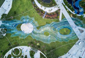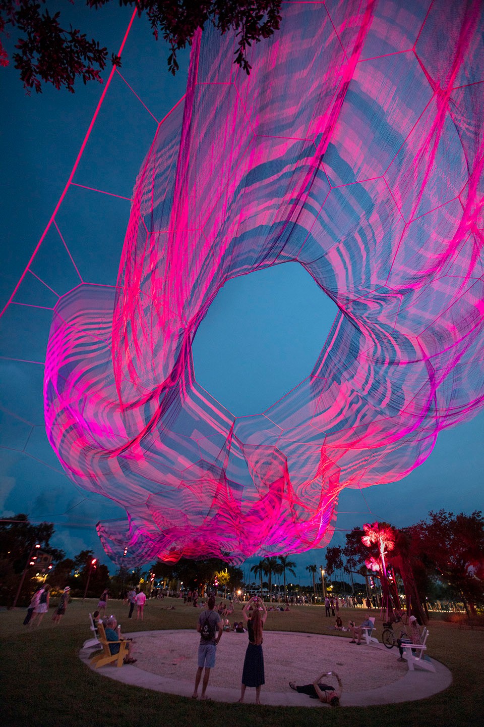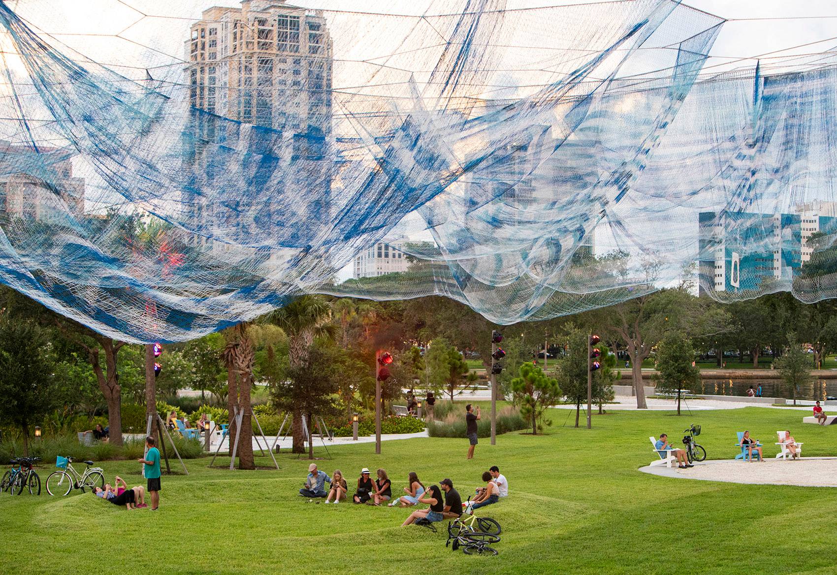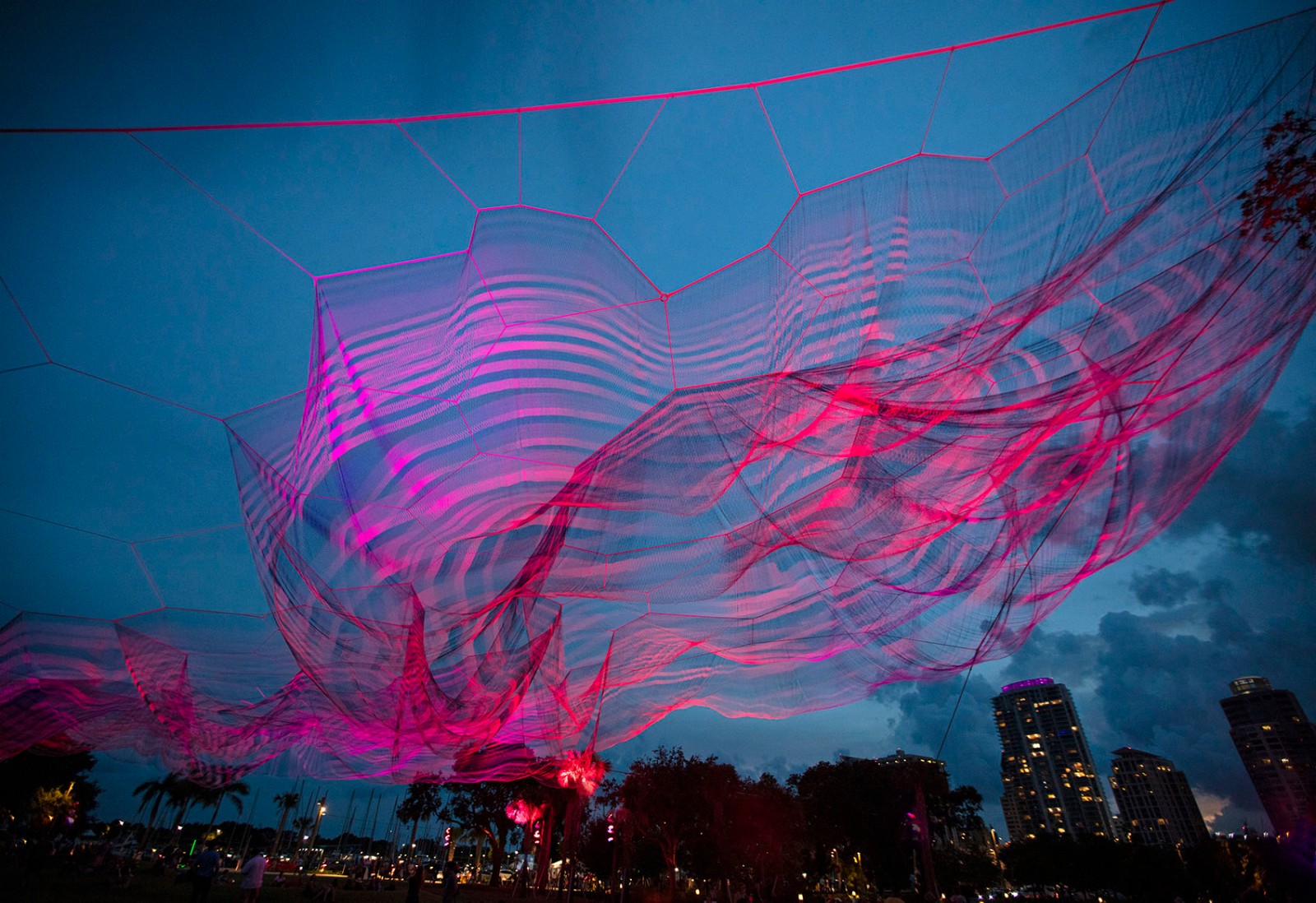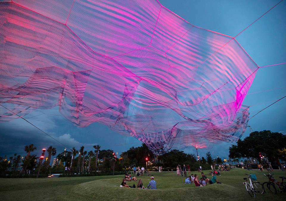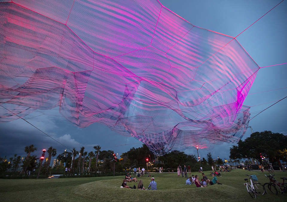 隨著圣彼得堡26英畝海濱碼頭的開放,Janet Echelman揭幕了其最新的永久裝置作品——彎曲的弧線。這座空中雕塑由1,662,528個繩結(jié)與180英里的繩索組成,總長達424英尺,最高點可達72英尺。