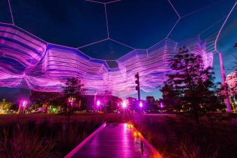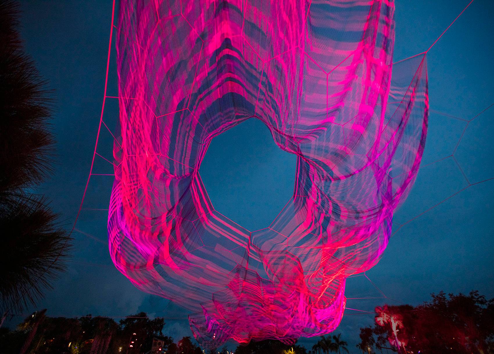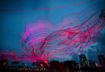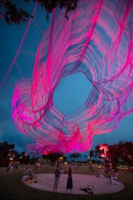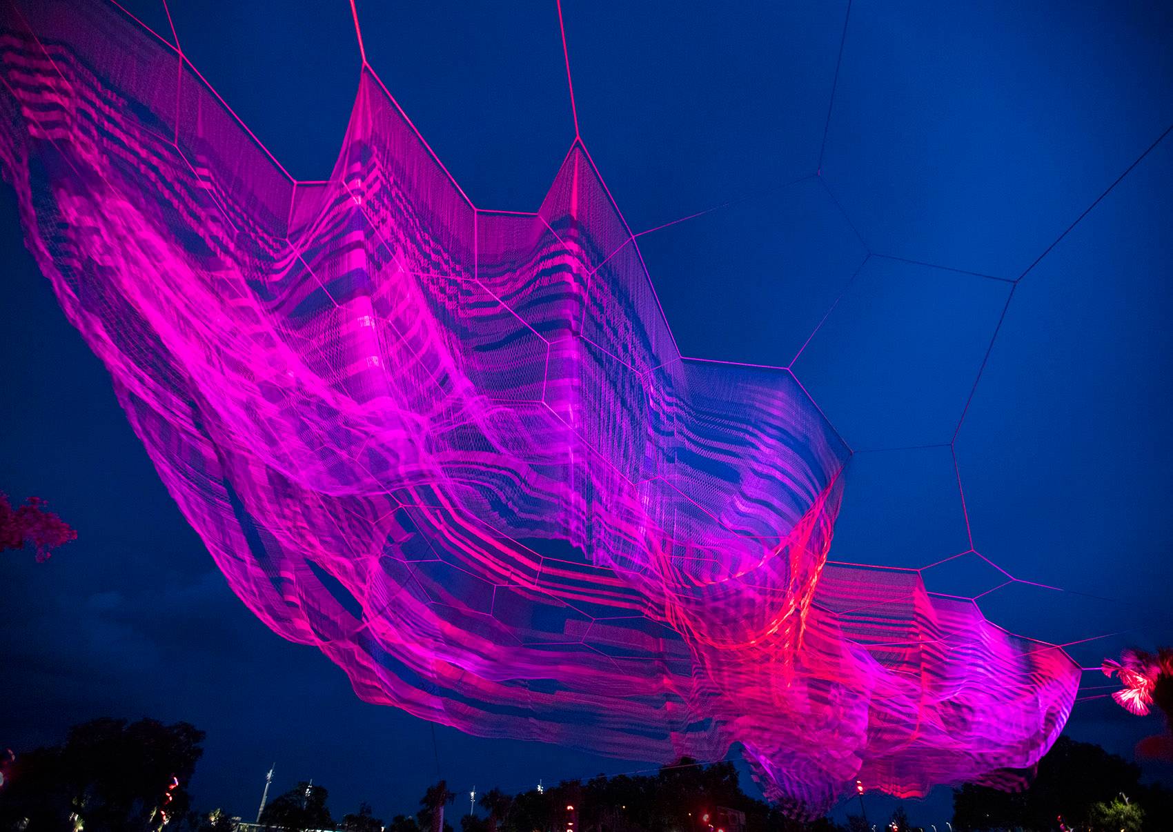 Echelman的藝術(shù)理念是擁抱變化。這座巨大的雕塑在碼頭上方輕輕搖曳。風(fēng)給雕塑柔軟的表面塑造了多變的造型,宛若舞蹈。雕塑的顏色也會隨著自然光與人工照明的變化而變化。白天,雕塑在公園的地面和游人身上投下陰影,晚上,則變成紅色與紫色交織的燈光裝置。