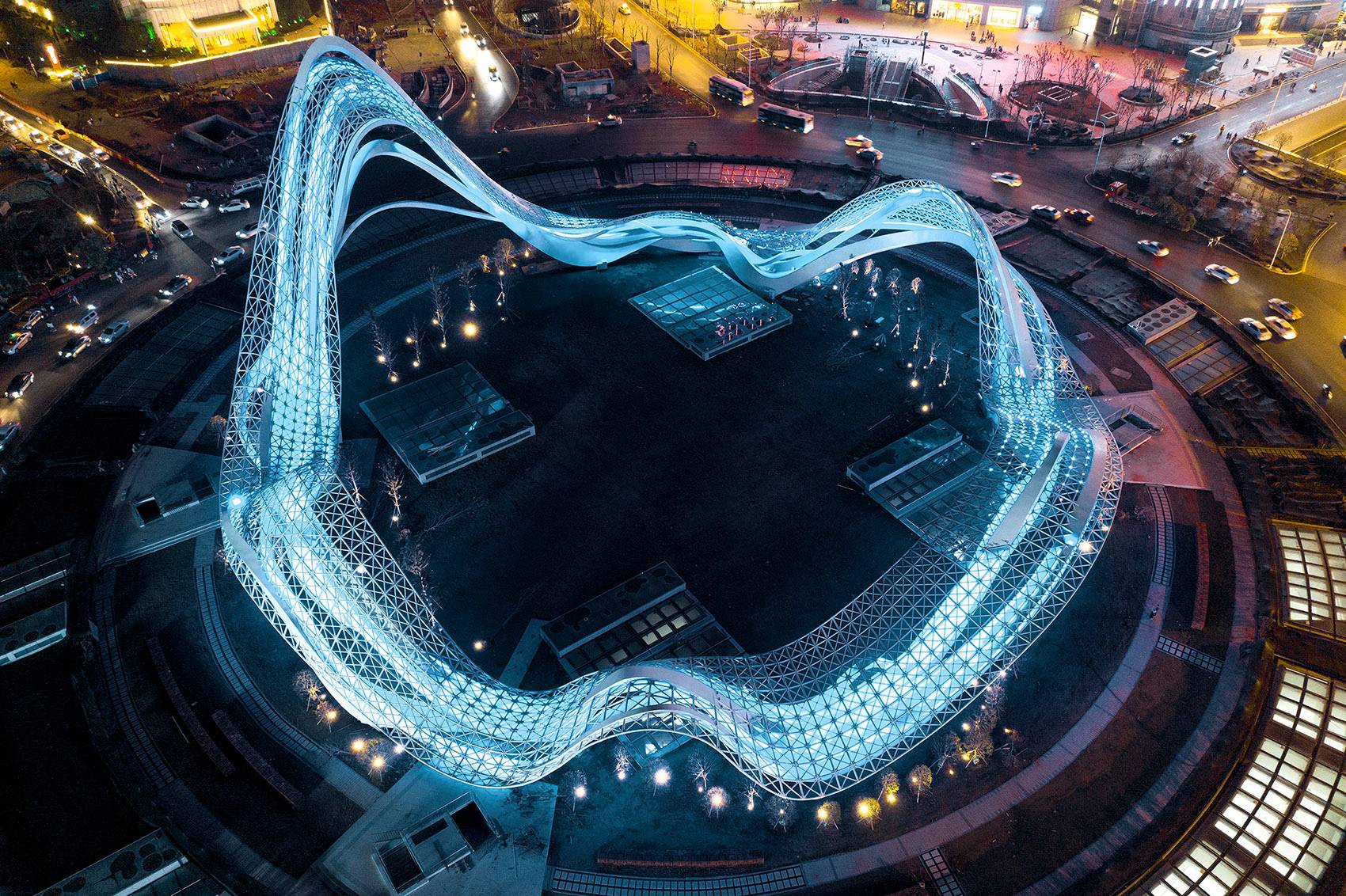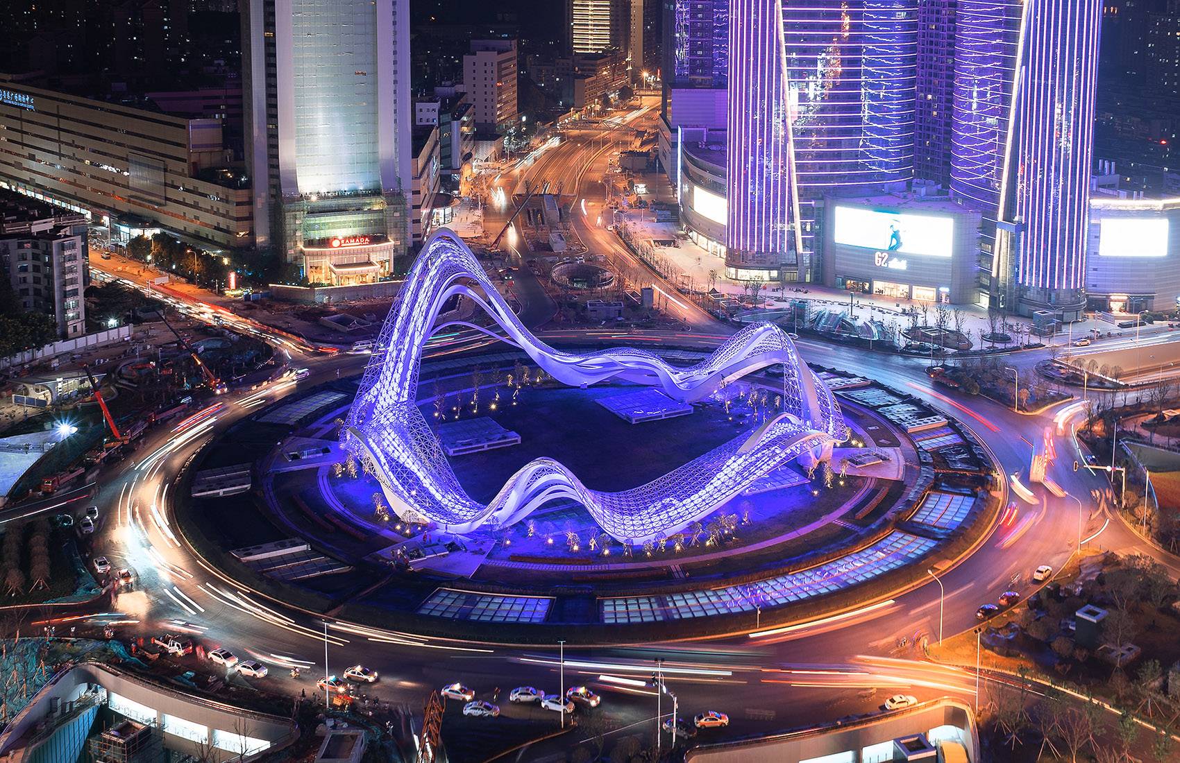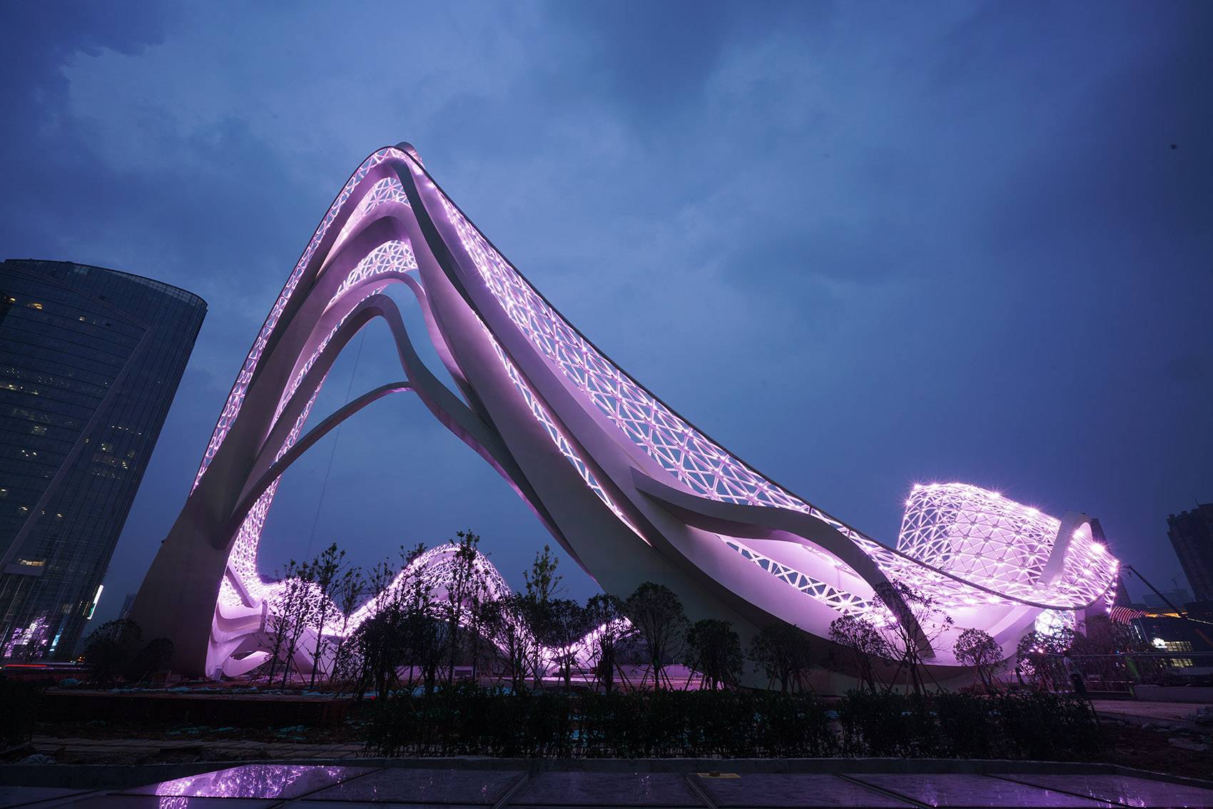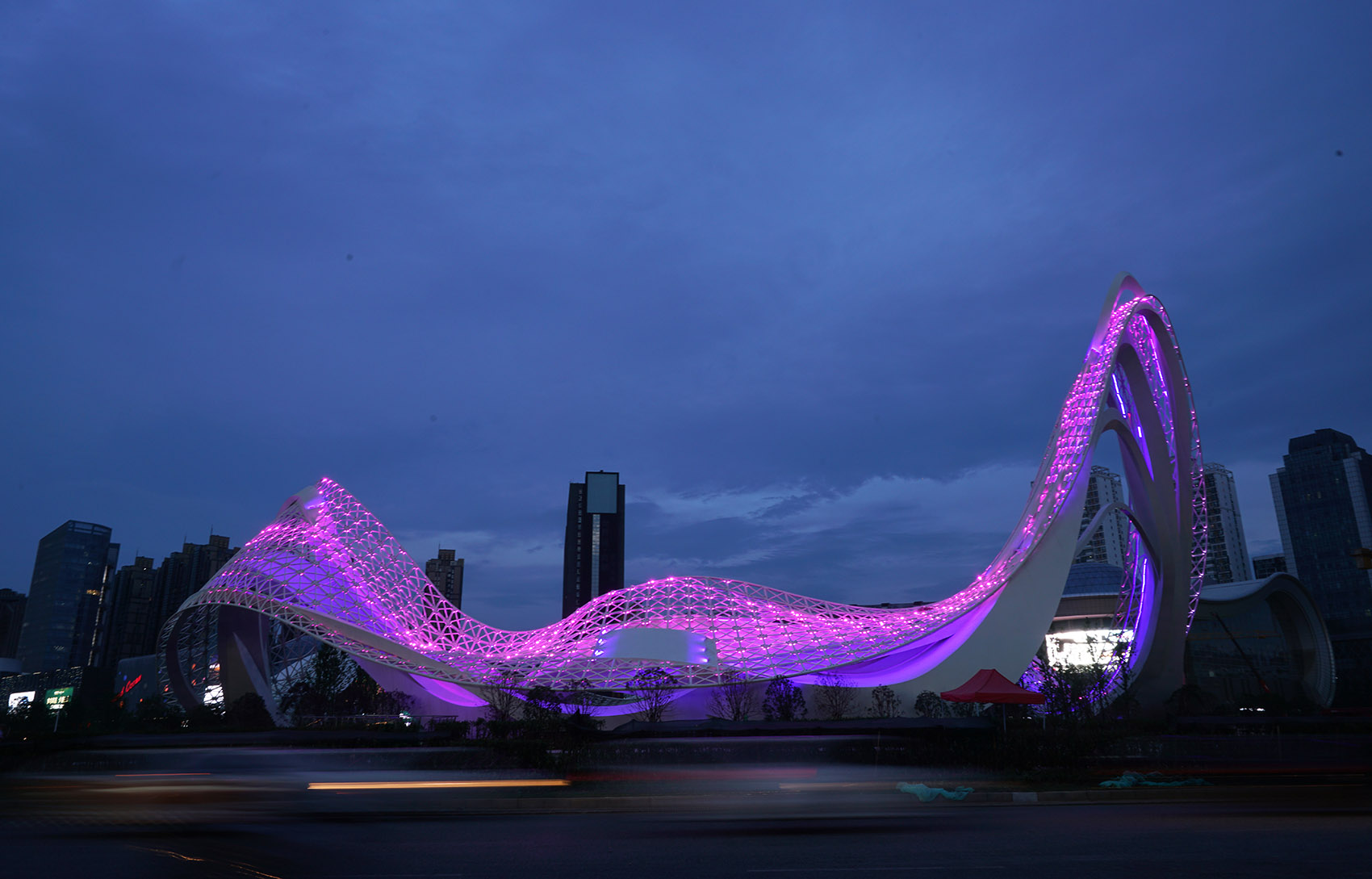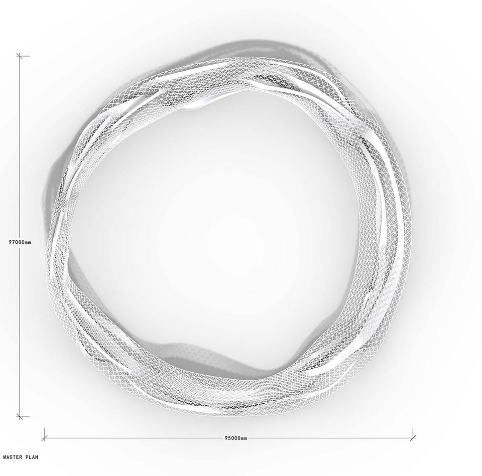 直徑90米的跨度與40米的挑高保證了其在空間中所應(yīng)呈現(xiàn)的體量。雕塑主體富有韻律的起伏造型象征武漢山水交融的城市地貌,3條顯現(xiàn)而充滿張力的曲線對(duì)應(yīng)雄峙鼎立的武漢三鎮(zhèn),俯瞰近似玉璧的環(huán)形形態(tài)是對(duì)未來美好生活的向往,線條交織所編織出邁向未來的夢想也將在深夜的星空點(diǎn)亮。