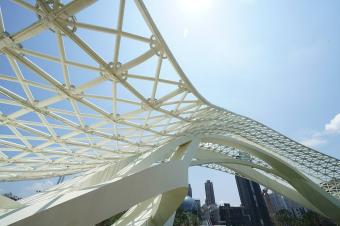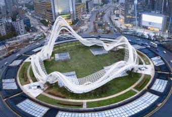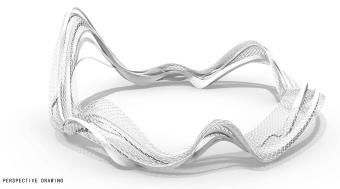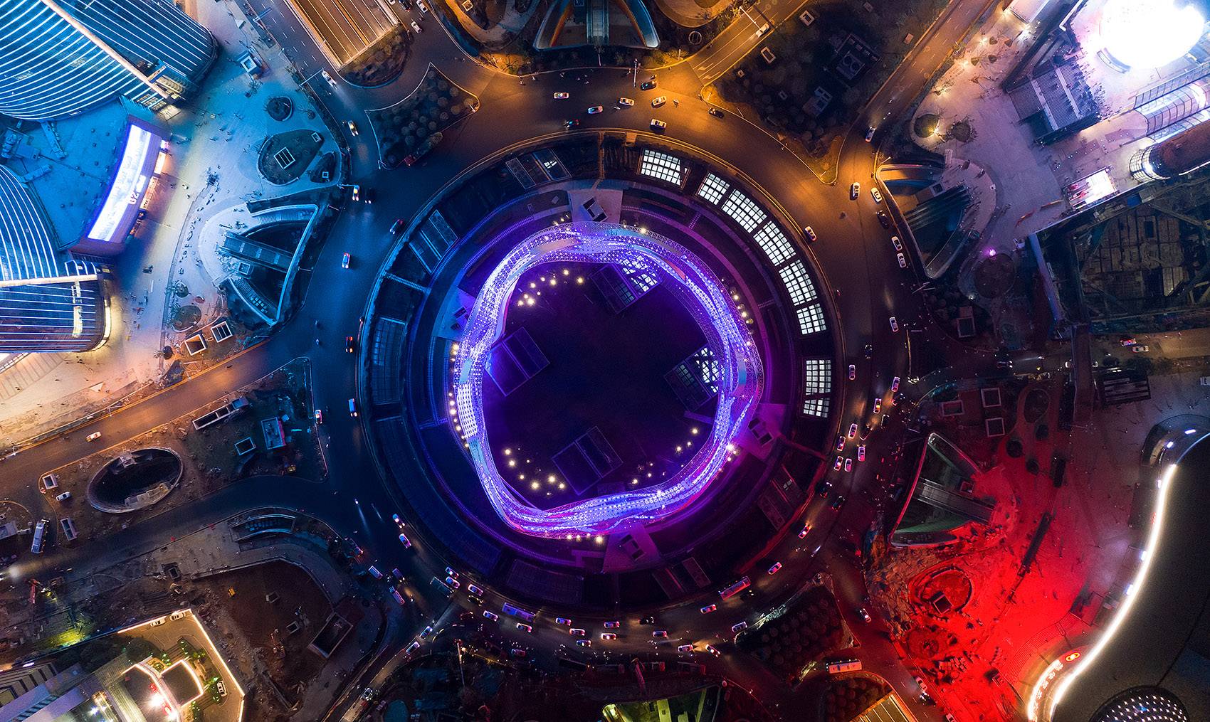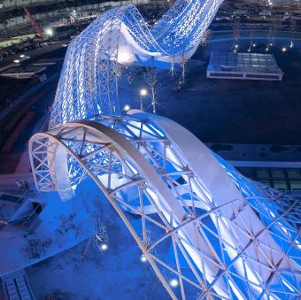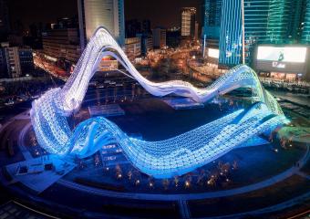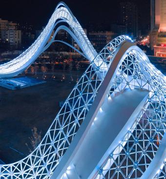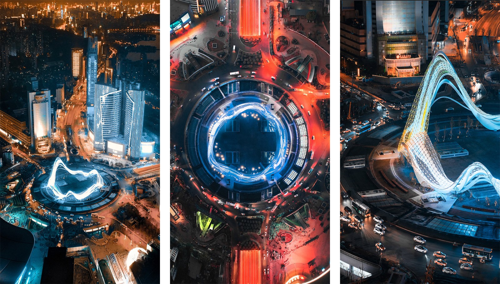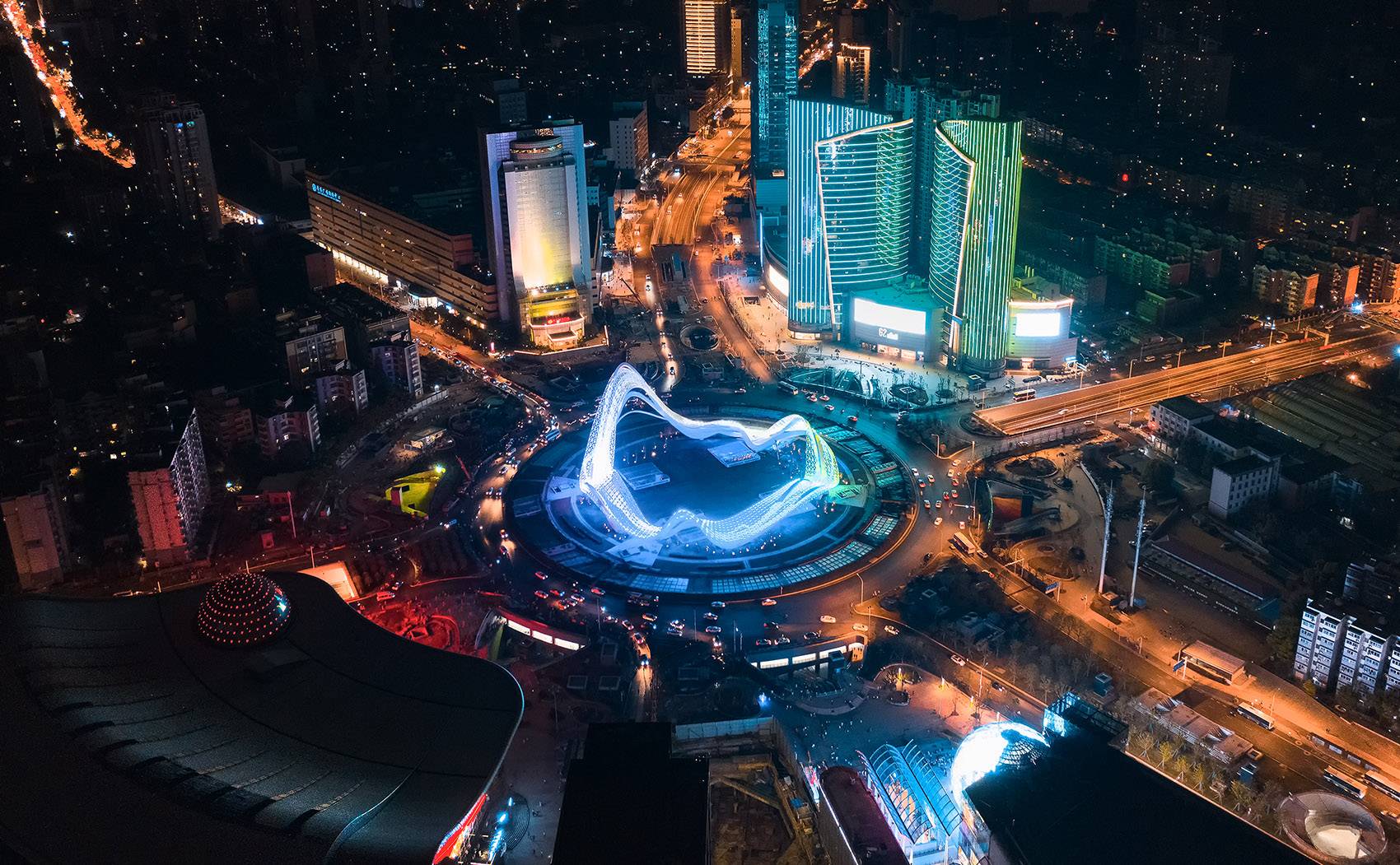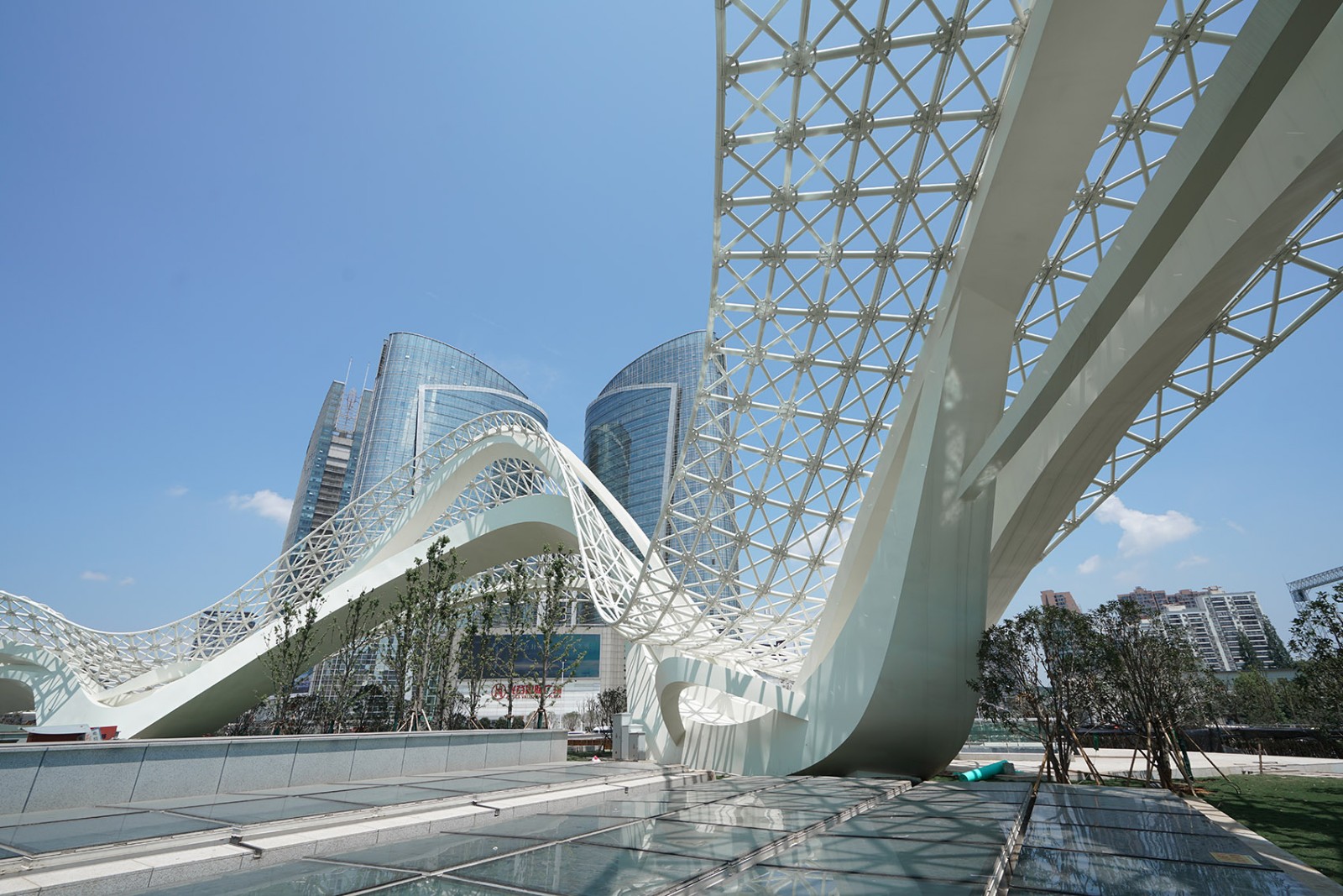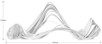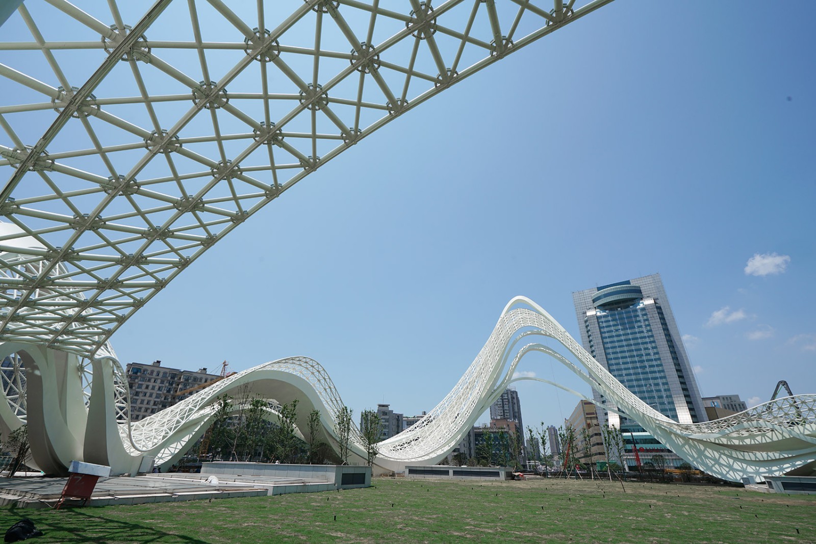 直徑90米的跨度與40米的挑高保證了其在空間中所應(yīng)呈現(xiàn)的體量。雕塑主體富有韻律的起伏造型象征武漢山水交融的城市地貌,3條顯現(xiàn)而充滿張力的曲線對(duì)應(yīng)雄峙鼎立的武漢三鎮(zhèn),俯瞰近似玉璧的環(huán)形形態(tài)是對(duì)未來美好生活的向往,線條交織所編織出邁向未來的夢想也將在深夜的星空點(diǎn)亮。