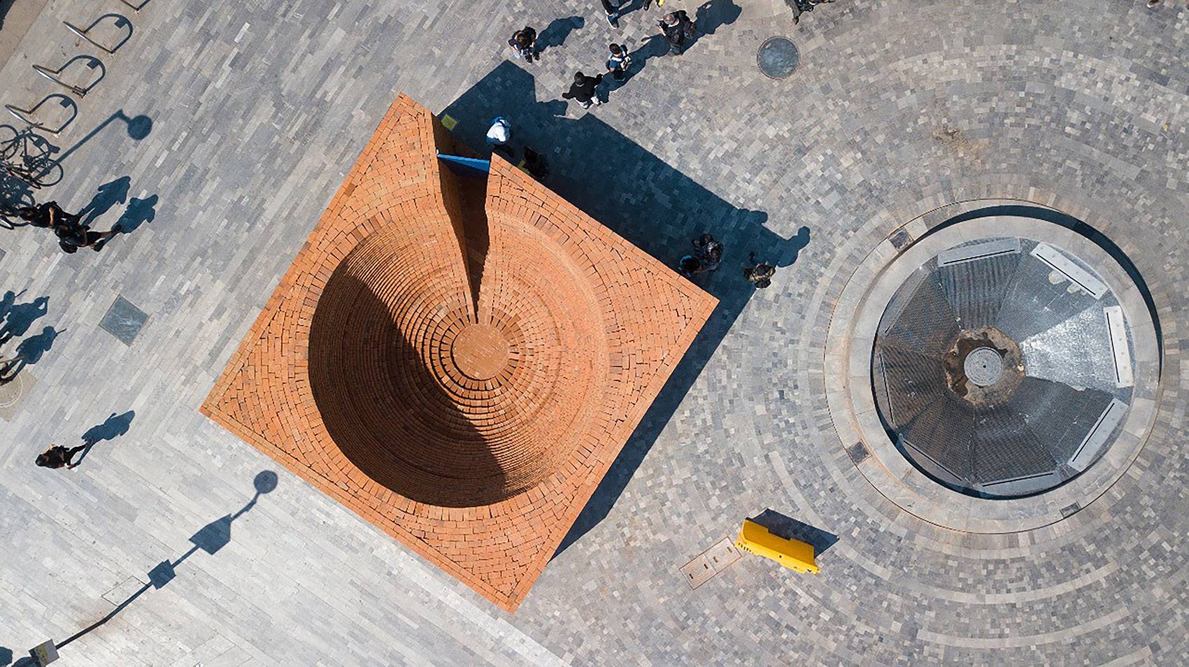 進入裝置,空間的邏輯被打破,內(nèi)部呈現(xiàn)出一個“被減去的”顛倒拱頂。沒有屋頂?shù)目臻g由連續(xù)凹面圍合,在紛雜的歷史城市中心創(chuàng)造出一片綠洲。