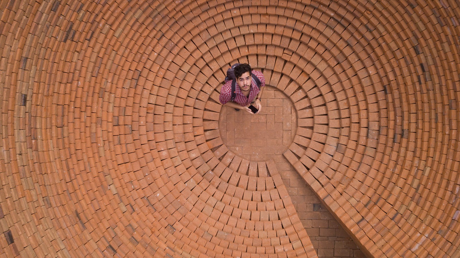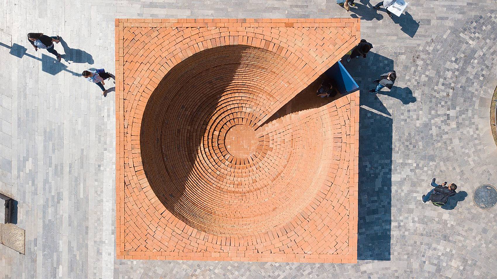 裝置外部是方整連續(xù)的墻壁,與內(nèi)部迷人的錯層圓拱形成了鮮明的對比。