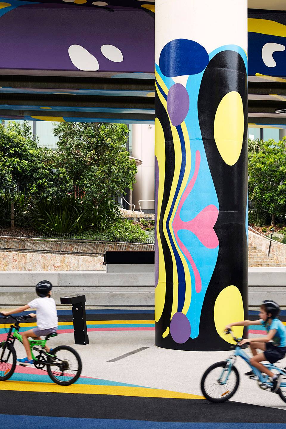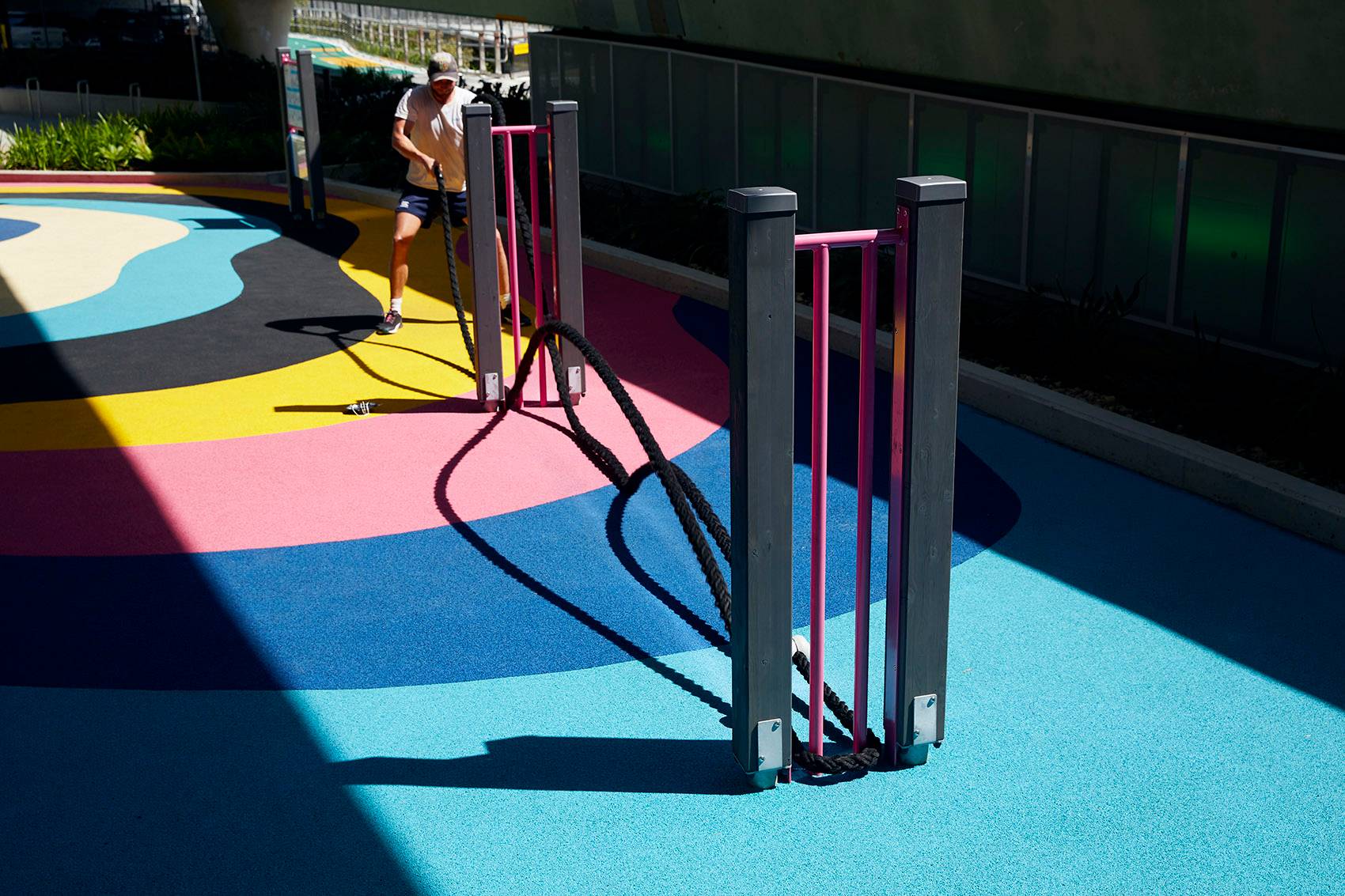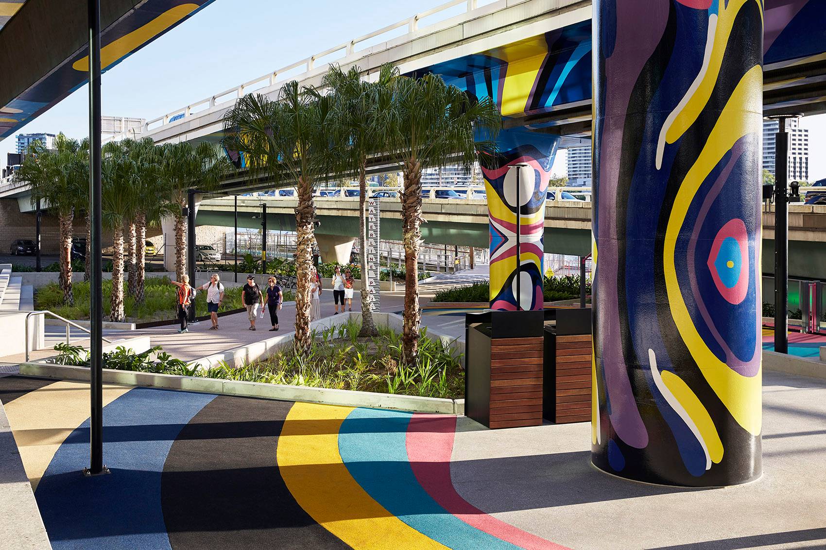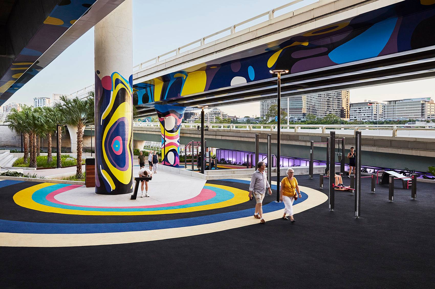 The brightly coloured artwork includes a mural to the underside of the Riverside Expressway, a soft fall ground plane, brightly coloured gym equipment and night activated lighting elements. The predominantly graphic work, with sub-tropical colour palette, is inspired by marble patterns synonymous with the cover pages and book spines of historical volumes and records.