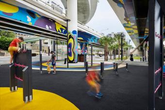 ▲高速公路下側(cè)的壁畫,軟質(zhì)鋪裝地面,色彩鮮艷的健身器, brightly coloured artwork includes a mural to the underside of the Riverside Expressway, a soft fall ground plane, brightly coloured gym equipment ? Alice Lang: Courtesy of Cian Sanders and UAP