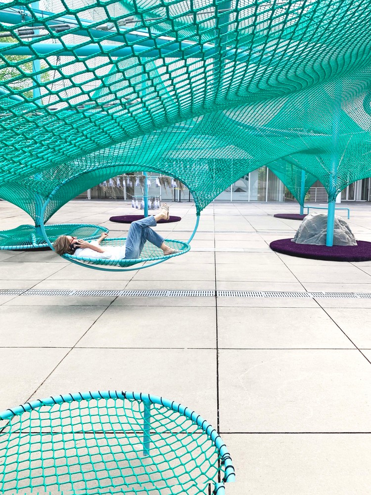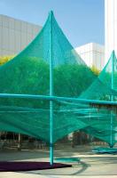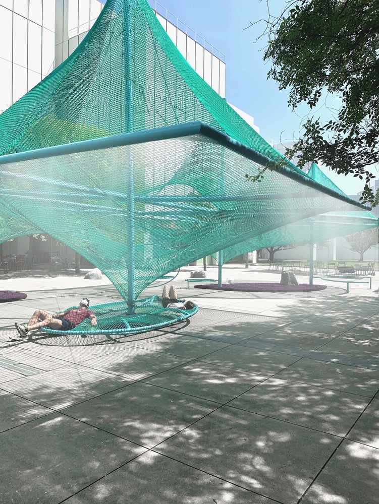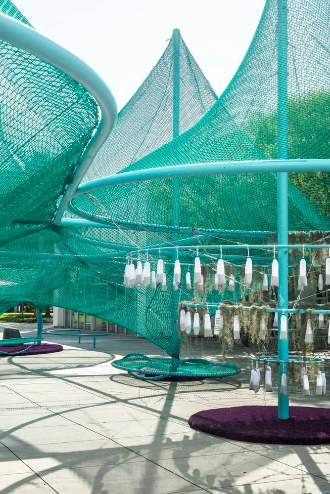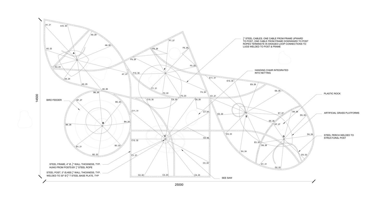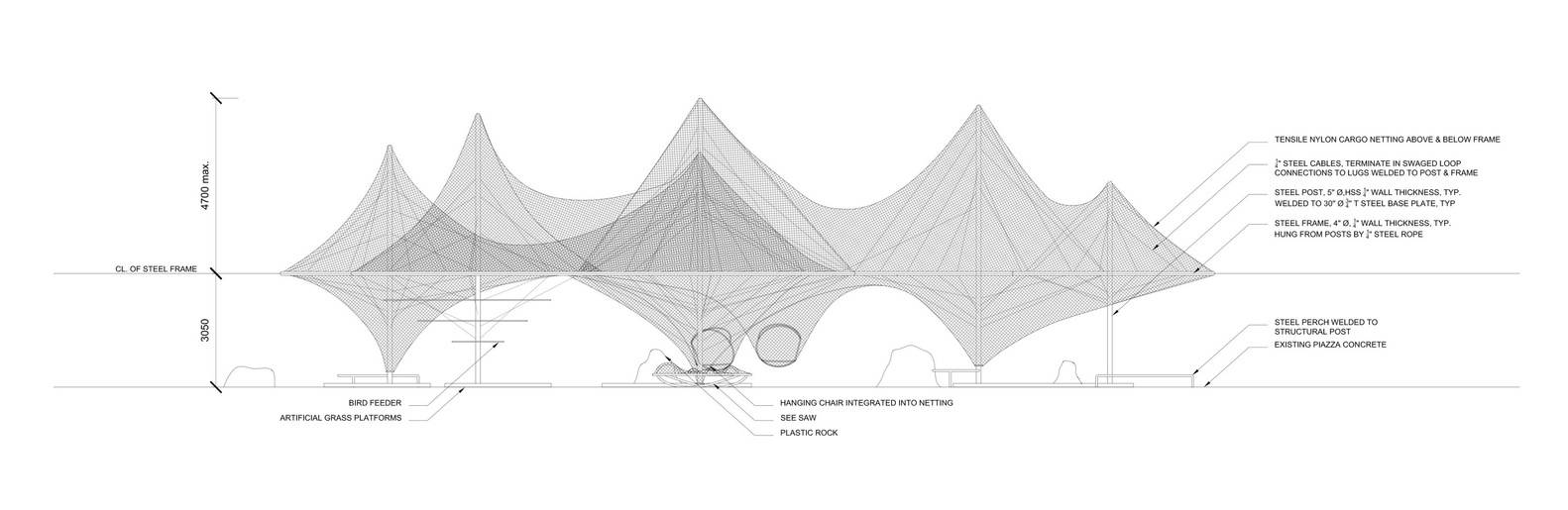 當(dāng)游客穿過廣場時(shí),他們被一個(gè)從鋼架上挑出來的模擬樹葉的網(wǎng)狀“樹冠”所包圍,因而想起這個(gè)區(qū)域常見的真實(shí)樹冠。我們與亞特蘭大工程師Uzun & Case 一同工作,建立一系列從六根桿懸挑出的金屬框架,并用農(nóng)業(yè)編制網(wǎng)包裹它們,從而為裝置塑形。雕塑式的布局回應(yīng)了它鳥群低語的形式,如一群鳥在瞬時(shí)飛旋在空中。樹冠上散落著豐富的鳥食器,座位架,和其它娛樂元素,以激勵(lì)互動、觀察和感知。這種游客體驗(yàn)旨在激發(fā)人們對于生物多樣性、物種滅絕和共同棲居的話題。