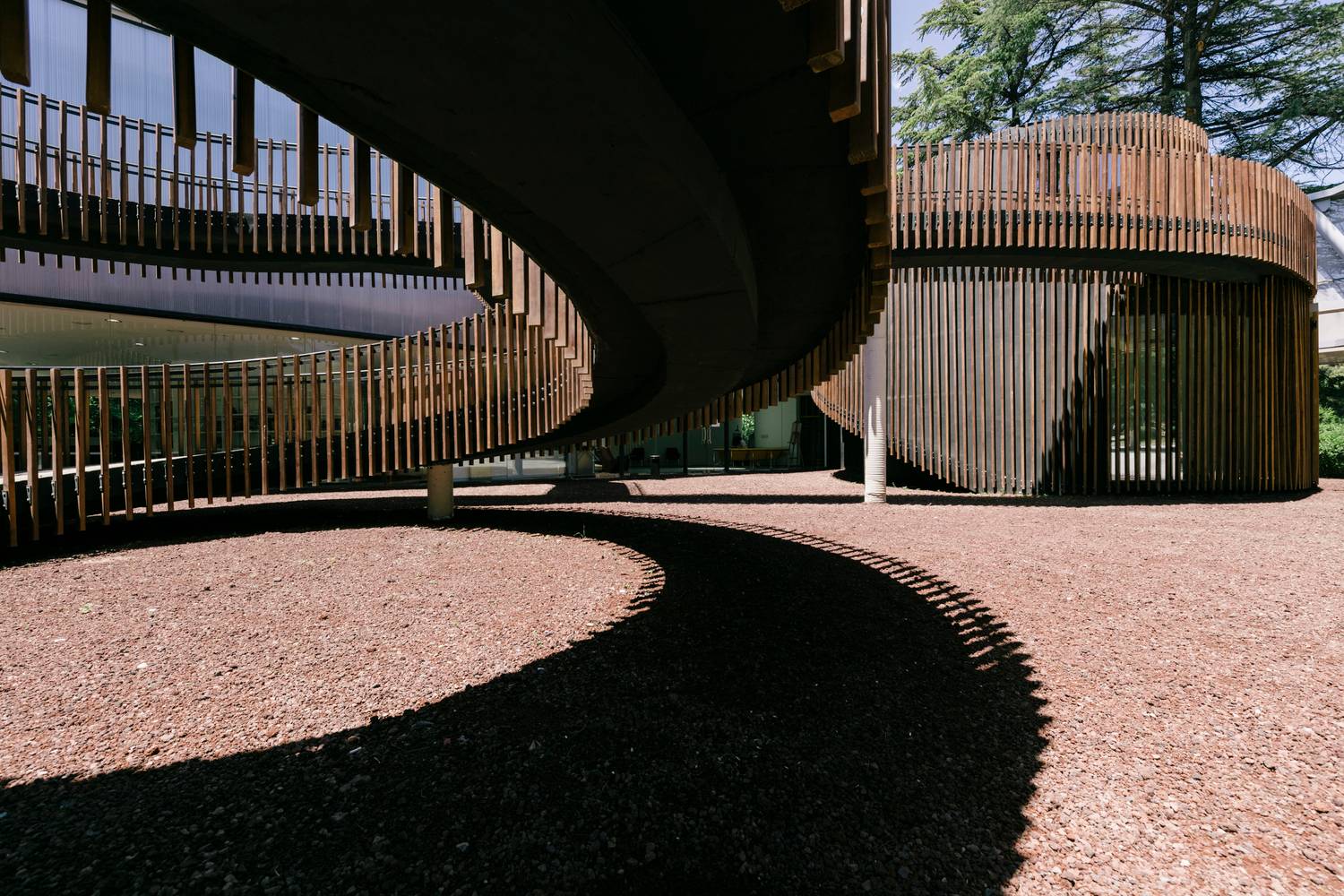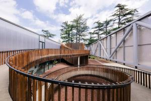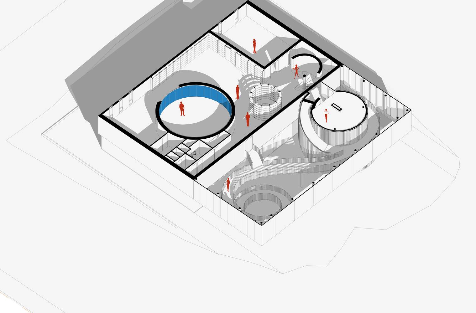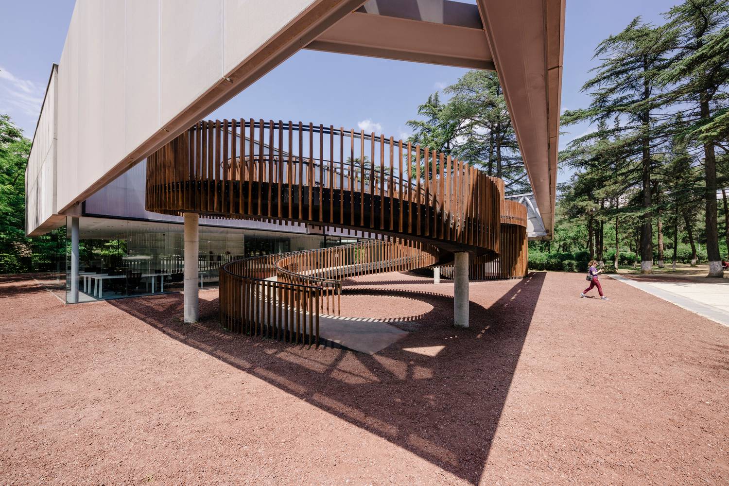 建筑上層的藍(lán)色圓形庭院也是一大亮點(diǎn),為內(nèi)部提供采光的同時(shí),也為各種室外活動(dòng)和陽(yáng)光下閱讀提供了完美的去處。