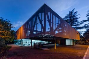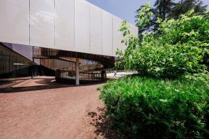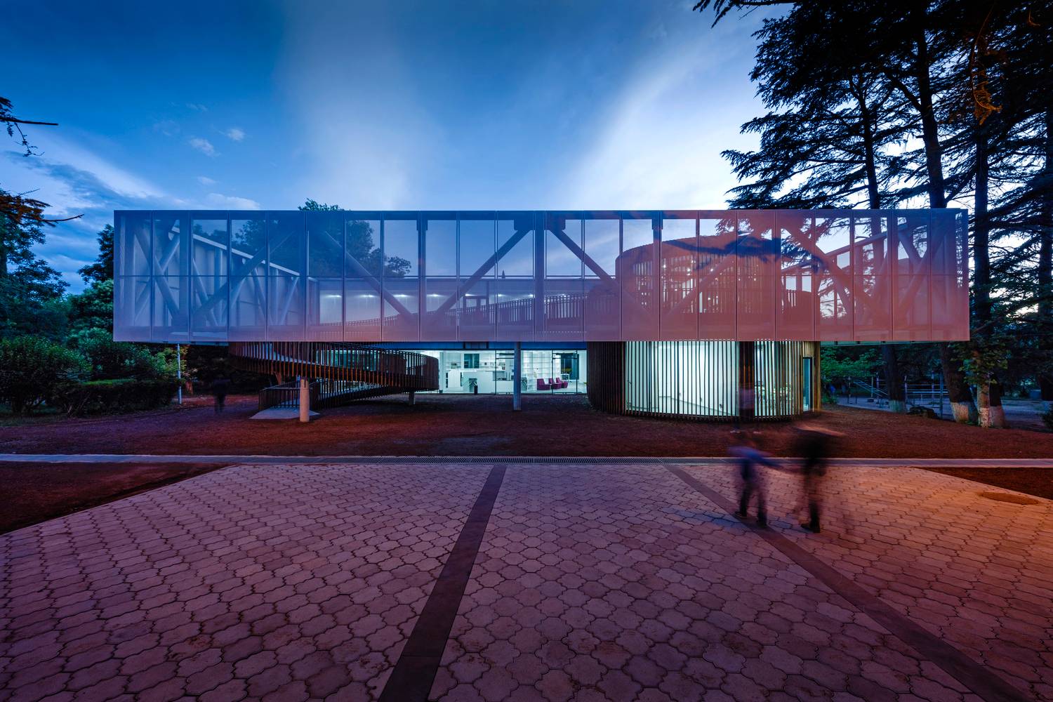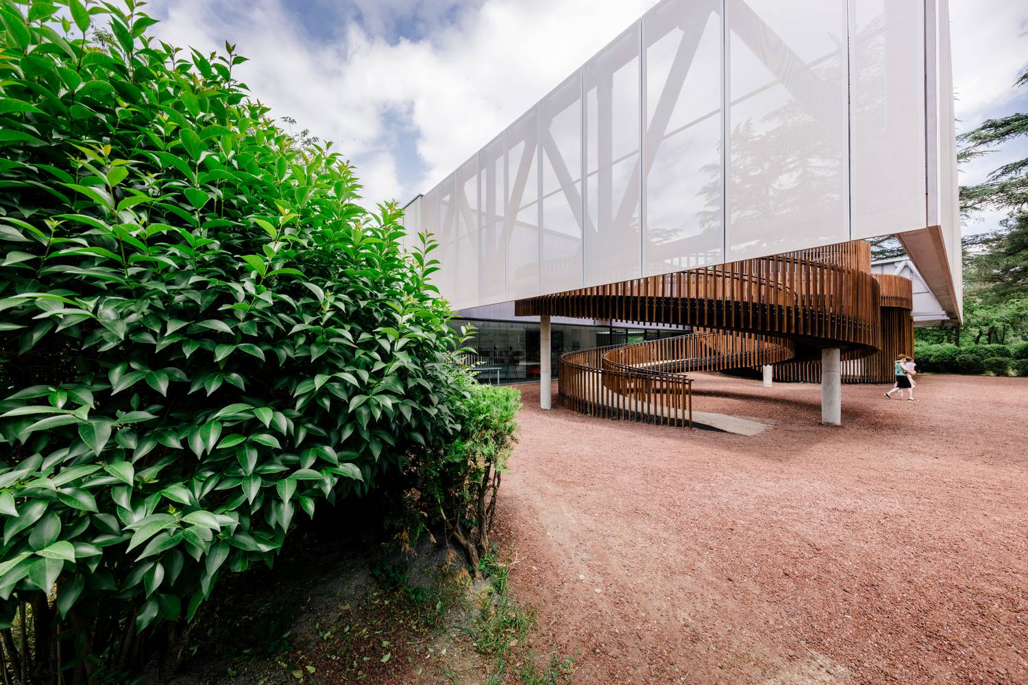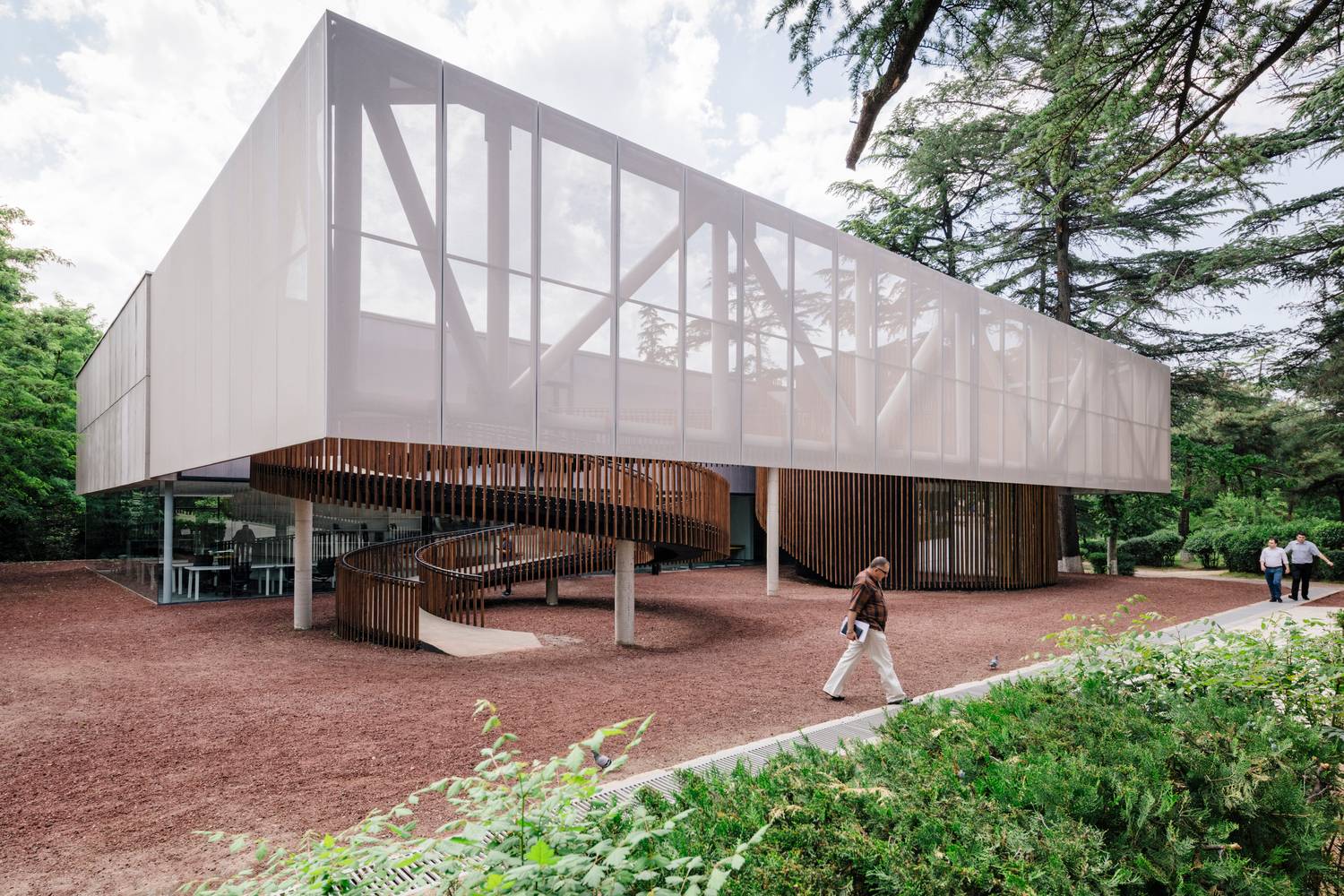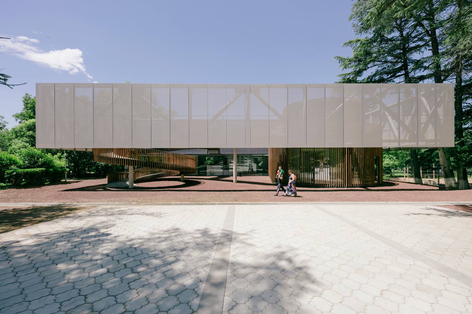 建筑的形式可以看作由單一長(zhǎng)方形框架統(tǒng)一起來(lái)的兩部分。建筑坐落于公園主路的盡頭,內(nèi)部流動(dòng)的形體在鋼架和織物表皮下展開(kāi),向前懸挑出12米,作為流動(dòng)形態(tài)組合(包括咖啡廳的圓柱體量和圍繞的螺旋樓梯)的終點(diǎn)。