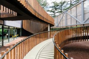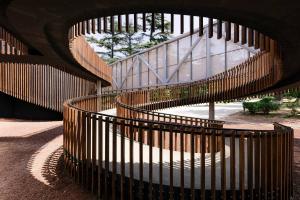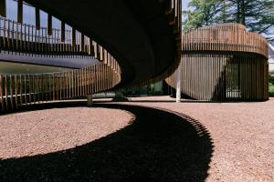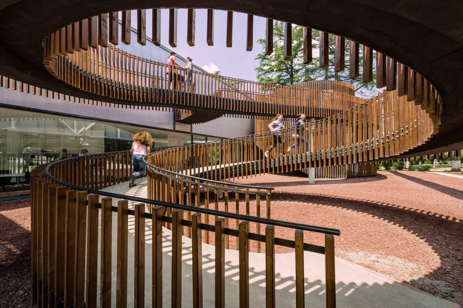 人進(jìn)入到鋼架的范圍內(nèi),到入口還有一段距離來(lái)會(huì)緩沖接近的感受。斜坡的形式從兒童滑梯發(fā)展而來(lái),為孩子們展示出歡迎的態(tài)度。