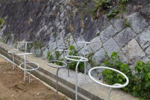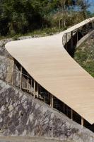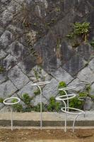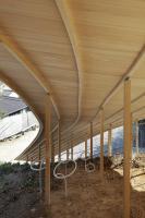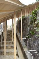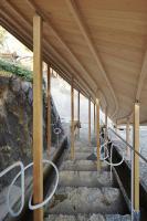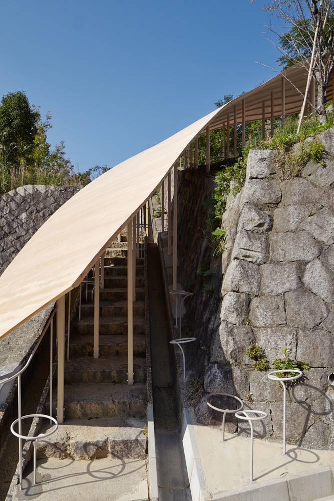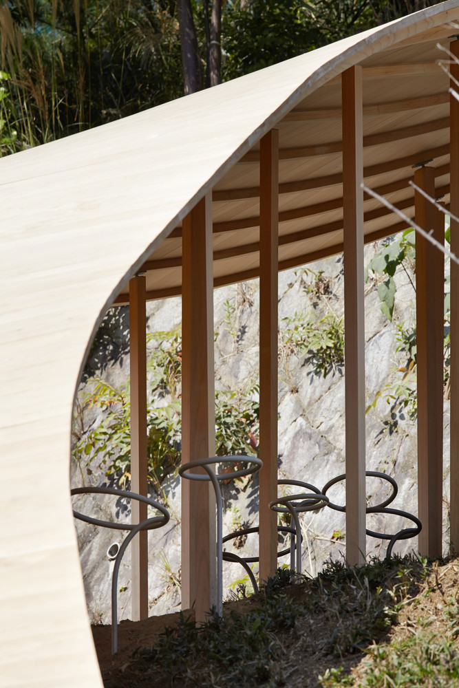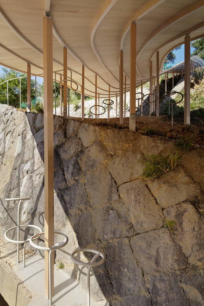 但是對于這個(gè)提供遮蔭、緊貼山坡、沐浴陽光的木構(gòu)建筑,我們認(rèn)為,將之形容為蘑菇更為貼切。這里的菌菇狀板凳是由手藝人手工制作而成,這樣能產(chǎn)生細(xì)小的形狀和大小的偏差,營造更自然的效果。這些板凳聚集在柱子的根部,或是石墻和臺階的角落和縫隙里,這種布局效仿了蘑菇在野生環(huán)境中生長的規(guī)律,扶手變成蘑菇等細(xì)節(jié)則延續(xù)了這個(gè)隱喻。我們希望設(shè)計(jì)出在空間中自然“生長”的建筑元素,而不是把家具放進(jìn)空間中。