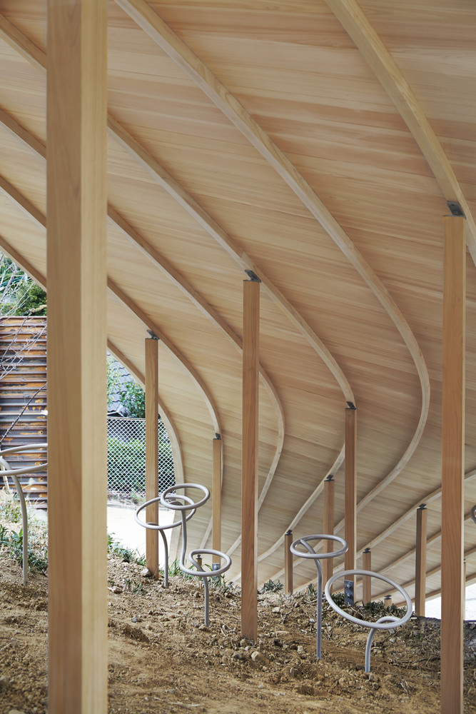 在一個(gè)晴朗的日子里,你可以在此數(shù)清京都東邊山脊線的36座山峰。臨近區(qū)域被劃作新的和風(fēng)梅花林,它們早春開花,馥郁芬芳,為這個(gè)建筑增光添彩。西澤使用了一個(gè)簡潔的屋頂,與這些元素相互配合,融匯進(jìn)這個(gè)臨時(shí)建筑的設(shè)計(jì)。