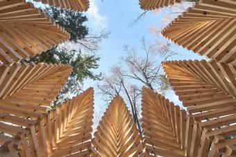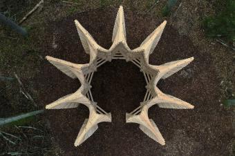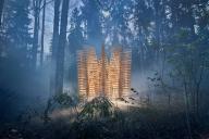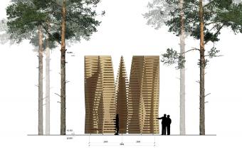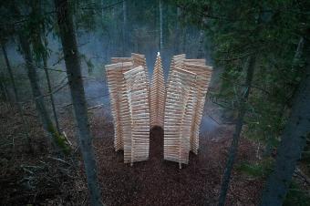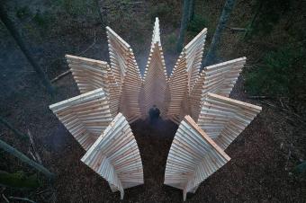Pavilion UGUNS is designed as a place for meditation and conversation. The character of the architecture refers to dynamics, fluidity and shading of fire. The wooden beam stacking is built by rotating each of the following elements at an angle of 2.5 degrees to the previous one, shaping 9 symbolic flames. The arrangement of the seats inside the pavilion is taken from the principle of the campfire, where sitting in a circle unifies people.