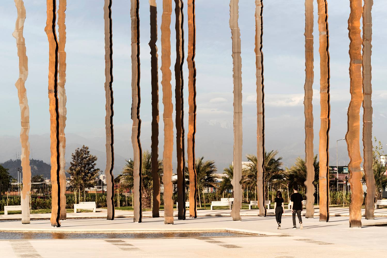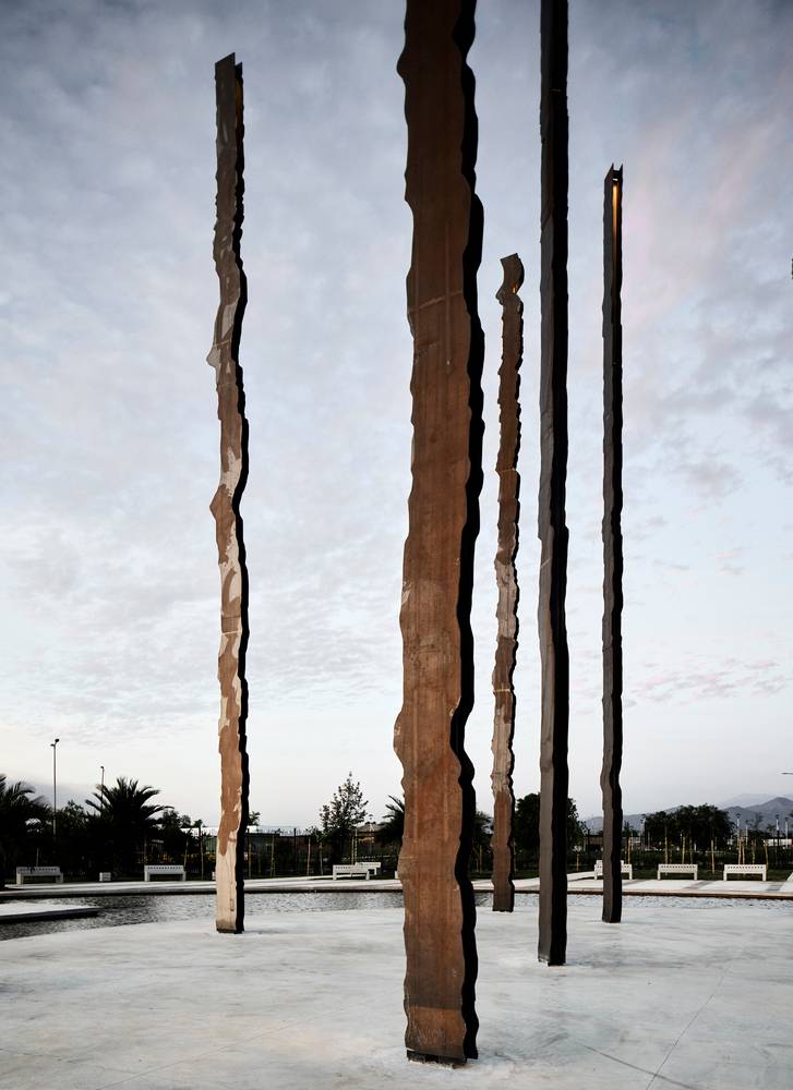 建筑師將山峰輪廓提煉概括,并在Los Cerrillos大都會公園中垂直放置時(shí),實(shí)現(xiàn)安第斯山脈區(qū)域內(nèi),水平延伸的自然維度與垂直維度的對話。安第斯山脈如同是構(gòu)成南美大陸的脊柱。這是一個(gè)恰當(dāng)?shù)碾[喻,暗示著團(tuán)結(jié),同時(shí)也是給我們一個(gè)短暫的領(lǐng)土占有脆弱性中認(rèn)識自己的機(jī)會。它一直堅(jiān)守著,作為無可辯駁的見證人來儲存記憶,并通過其地殼構(gòu)造般的外觀使我們保持警醒;它包容、定界、定位并定義居住的可能性。就其本身而言,它是一個(gè)與我們認(rèn)知相悖的生態(tài)系統(tǒng),通過大地景觀與占地來確定其標(biāo)志性與自身的詩意。