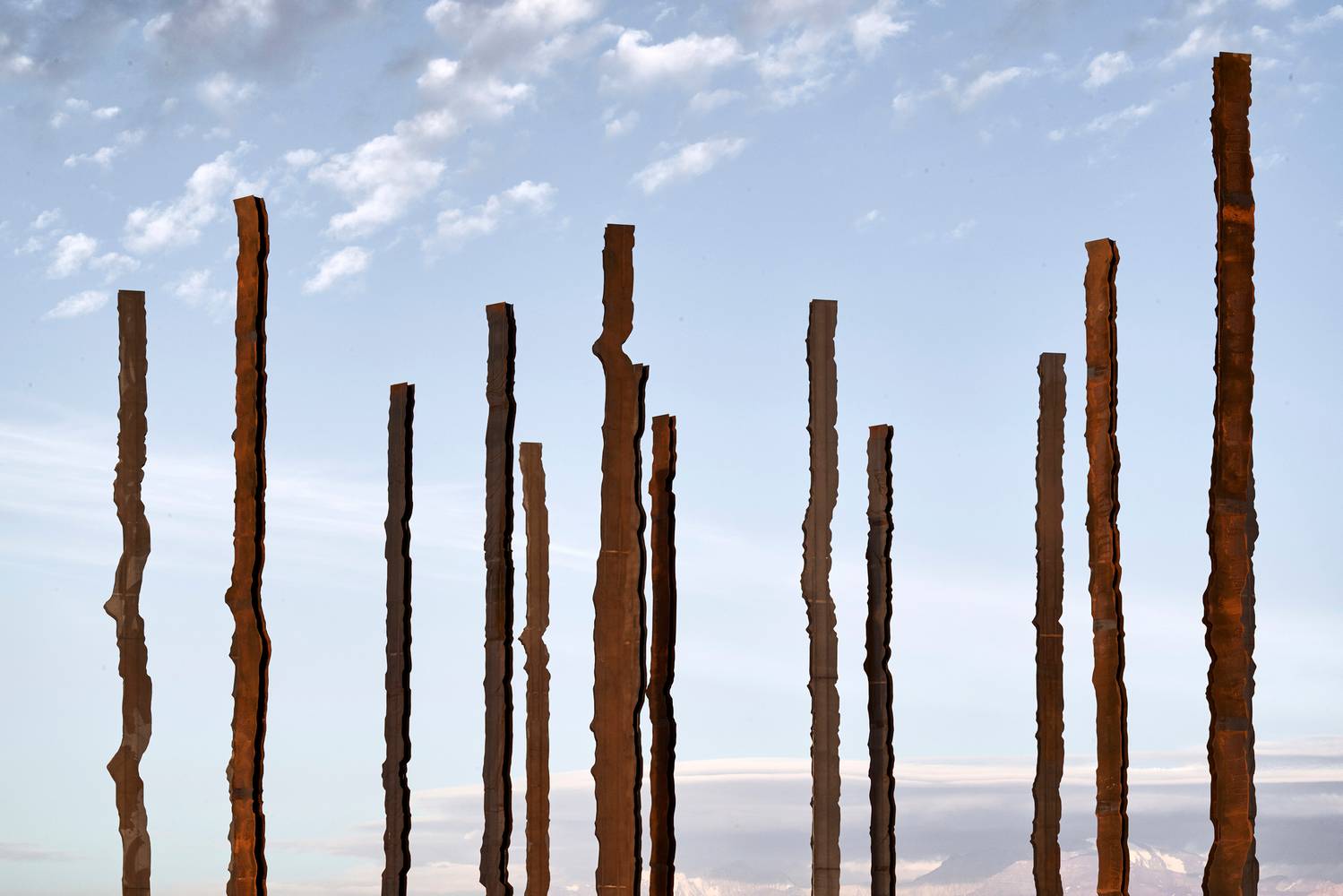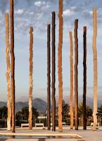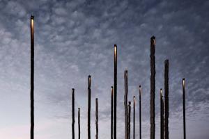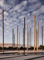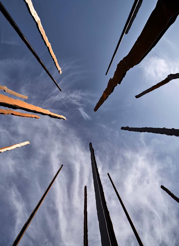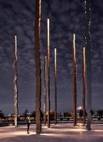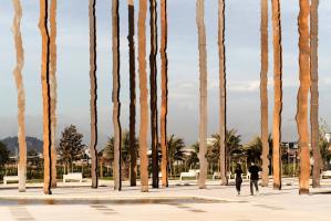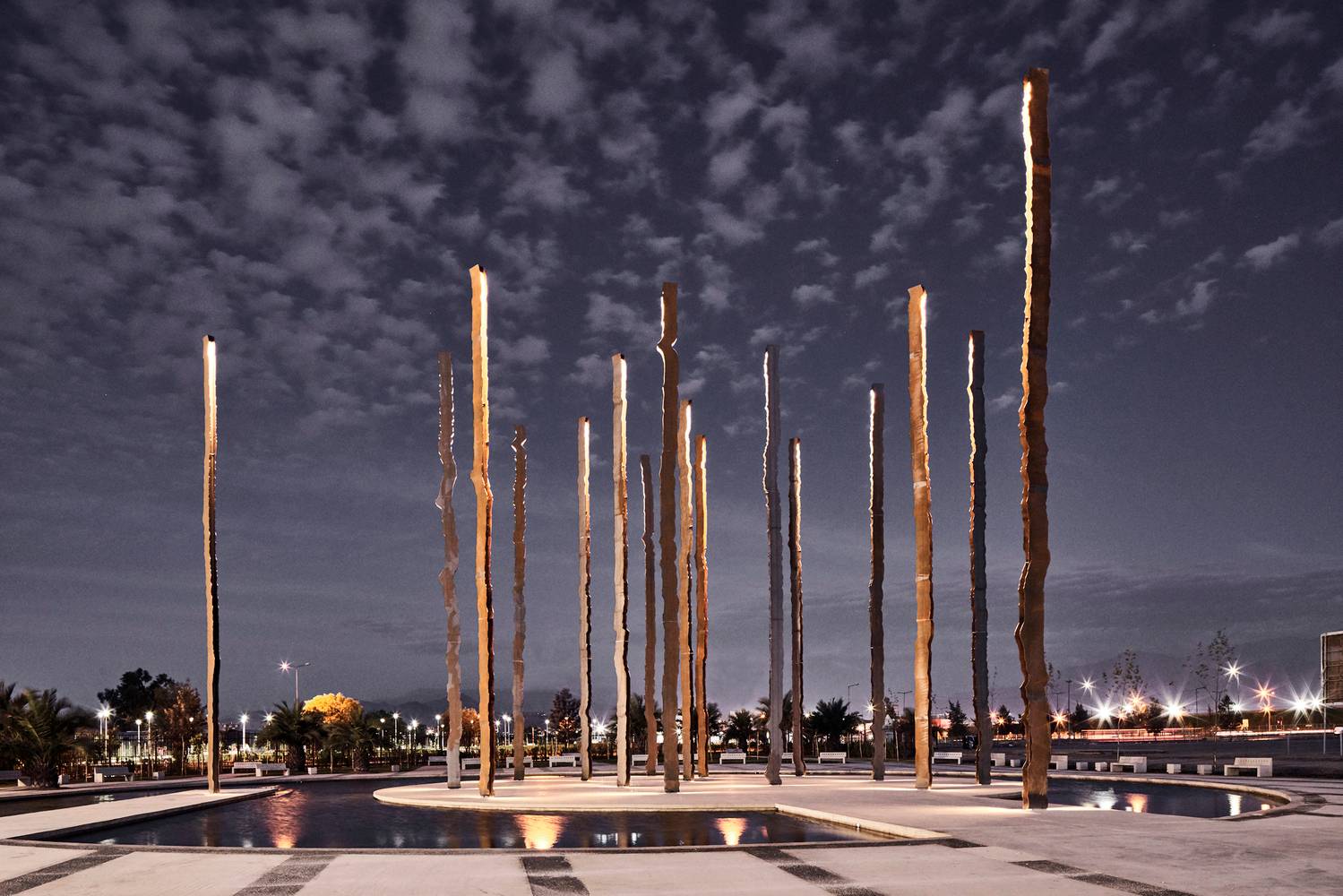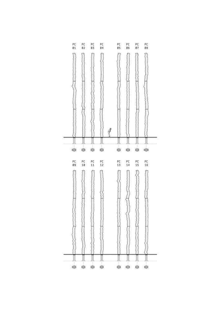 其中八根圓柱與百年紀(jì)念公園中心軸線平行,其余八根與主要出入口相呼應(yīng)。每根鋼柱高16米,由中部H型鋼梁構(gòu)成,兩側(cè)焊接有兩塊10毫米厚的薄板,共同組成構(gòu)筑物。