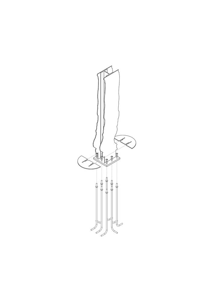 在下部區(qū)域,每根柱子均單獨(dú)錨固。一組地腳螺栓將金屬結(jié)構(gòu)連接到一立方米混凝土的獨(dú)立基礎(chǔ)上。