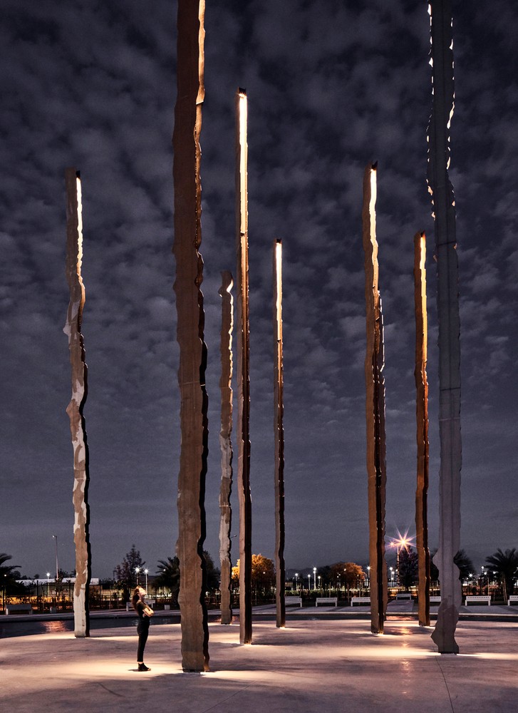 為了避免光污染,每根柱子在頂部都有六個(gè)照明設(shè)備指向其基座,表現(xiàn)出山脈輪廓。這是與Limarí Lighting Design(LLD)合作的提案。