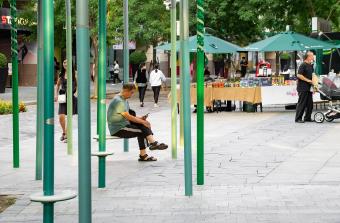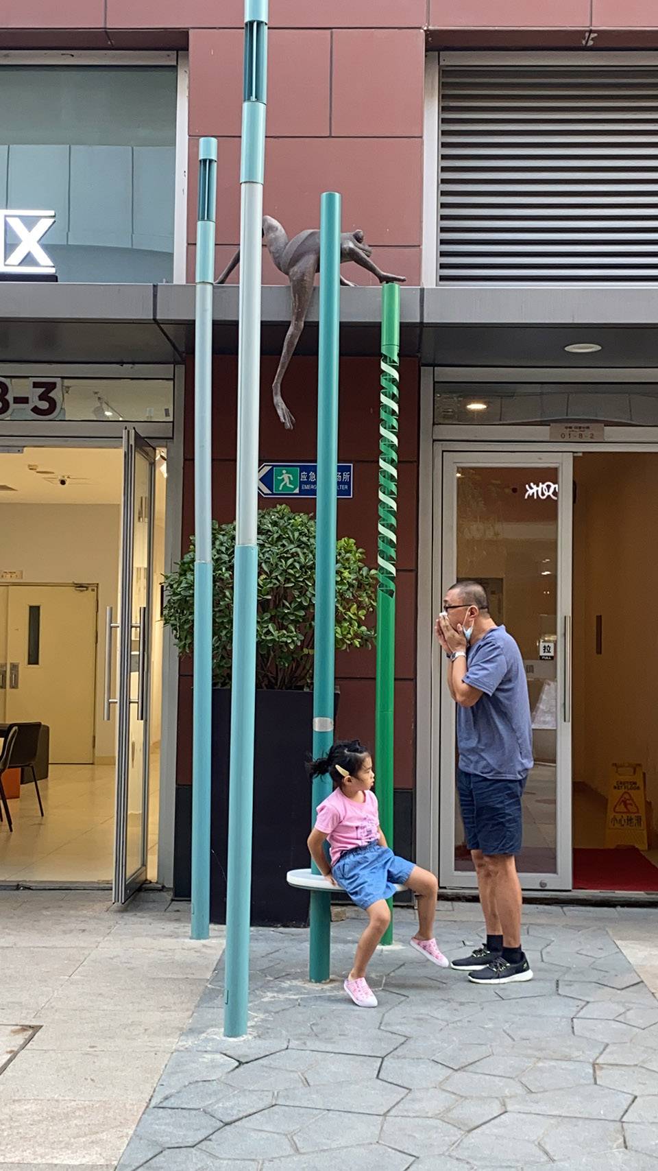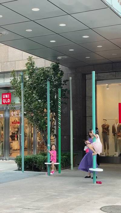 Column A is a free-wheeling seat made of metal with a height of 400mm. It adopts an eccentric design. Bearings are installed between the seat body and the column to make the seat body rotate freely around the center of the column. From the use of perspective, the column offer visitors leisure grounds, and bearing system means more fun and convenience. For tourists who are waiting or shopping, you can take a short break. Those who are familiar with the two seats turn to each other, among the stranger, they can adjust the direction of the seats for themselves, so as to maximize the use of functions and facilitate gathering or discrete use. For children, it is not only a “toy” that can be played, also discover different ways of using it.