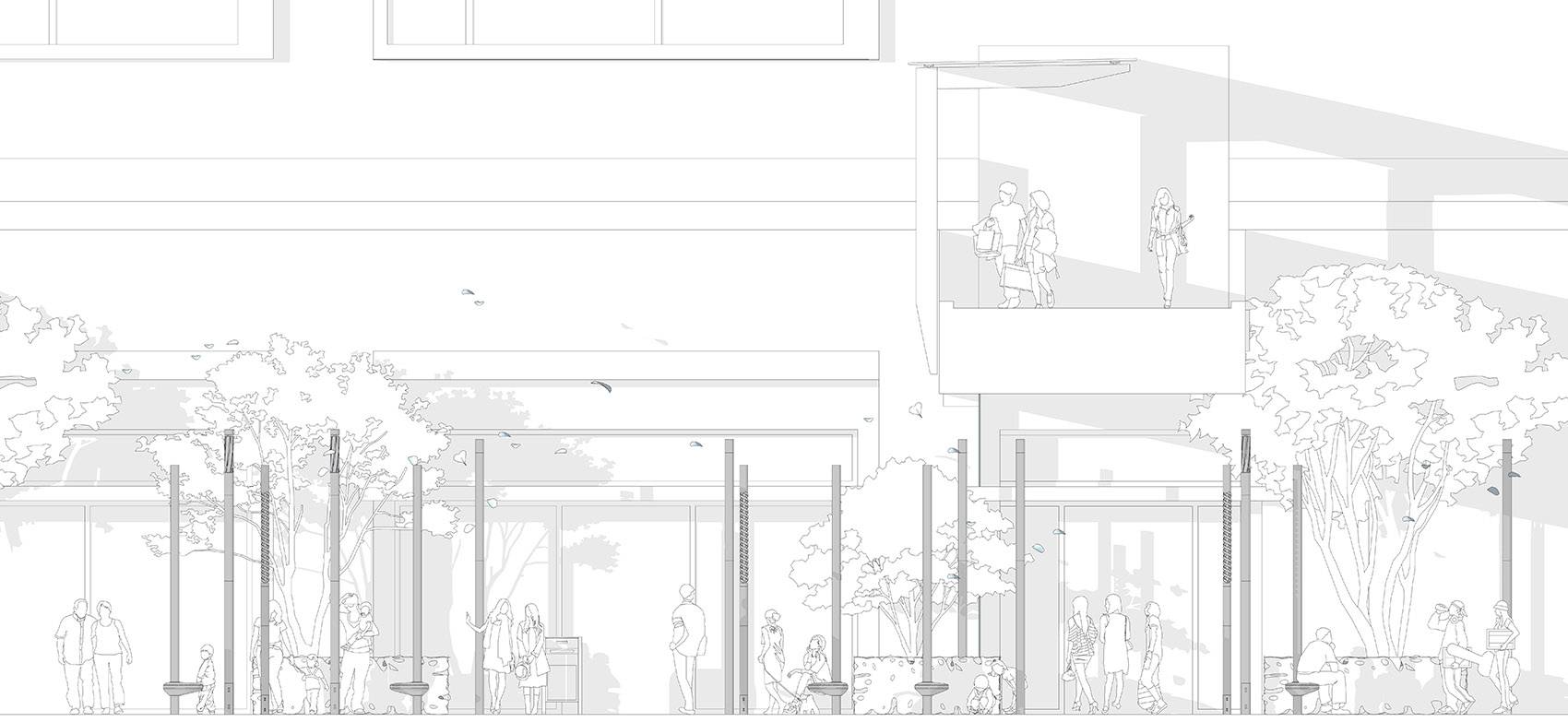 The column divide space, resulting in cut off in sight, half-empty half real, riching people experience and use of space level. Form,visually oriented and spaces lines are uniform, reduce the pressure of the pinch and improve the comfort of travel. Reducing passability properties of the depth permeability space to extend the residence time of the crowd and create three-dimensional spatial experience rich block.