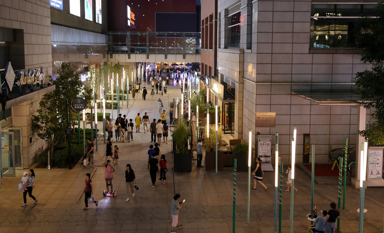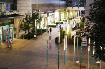 景觀柱劃分空間,在視線中造成隔斷,半虛半實,豐富空間層次及使用人群體驗;形式上與視覺導向、空間線條一致,降低夾道壓迫感,提升可游性舒適感;降低空間縱深的通透性及通過空間屬性,延長使用人群滯留時間,打造豐富立體的空間體驗街區(qū)。