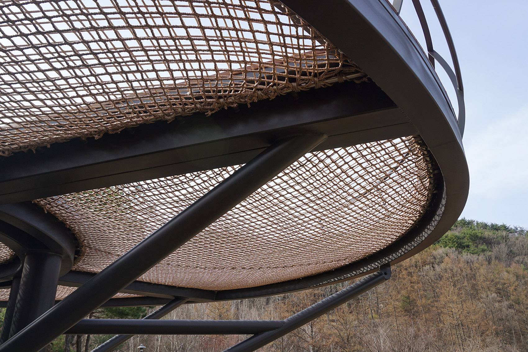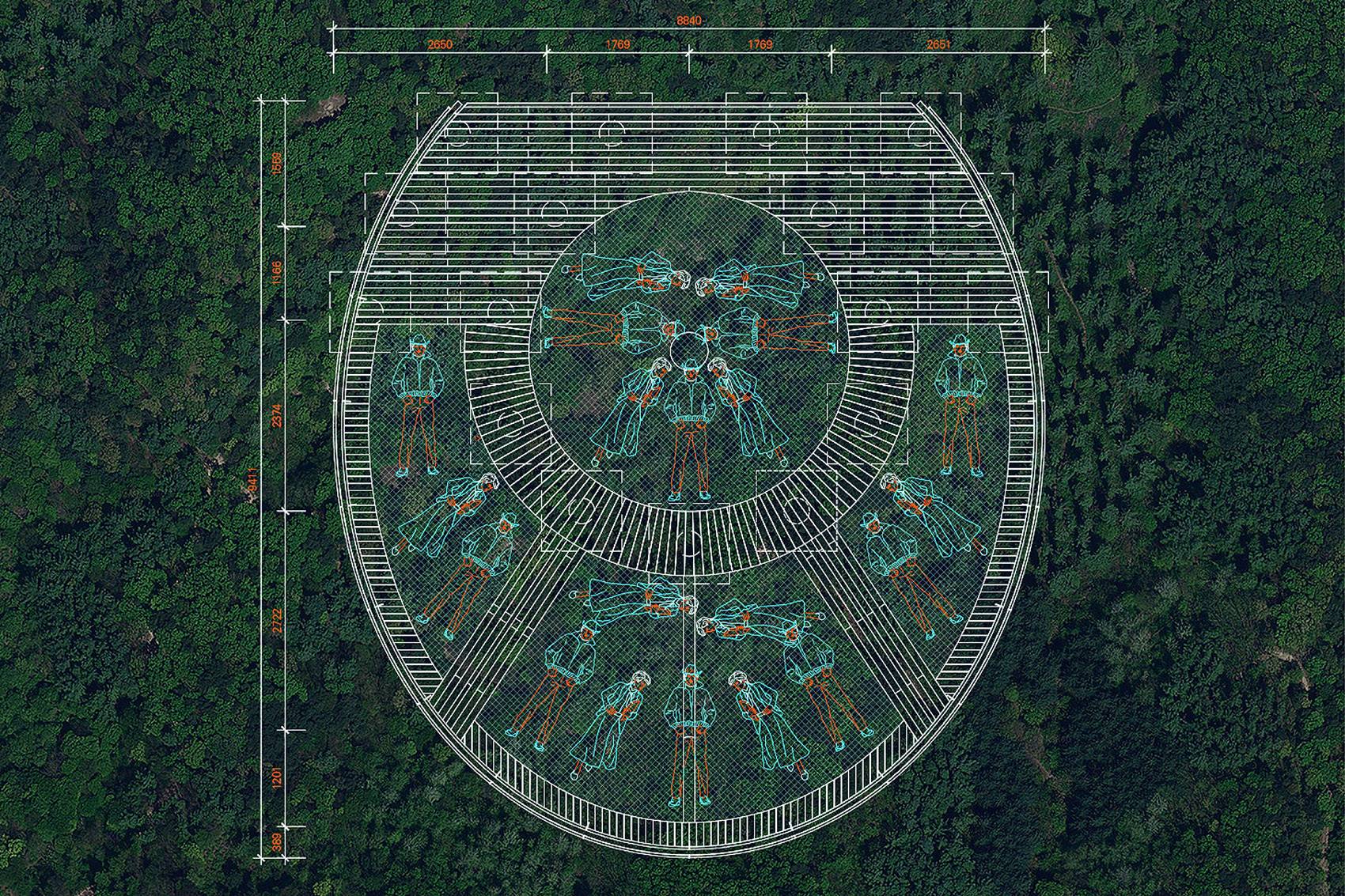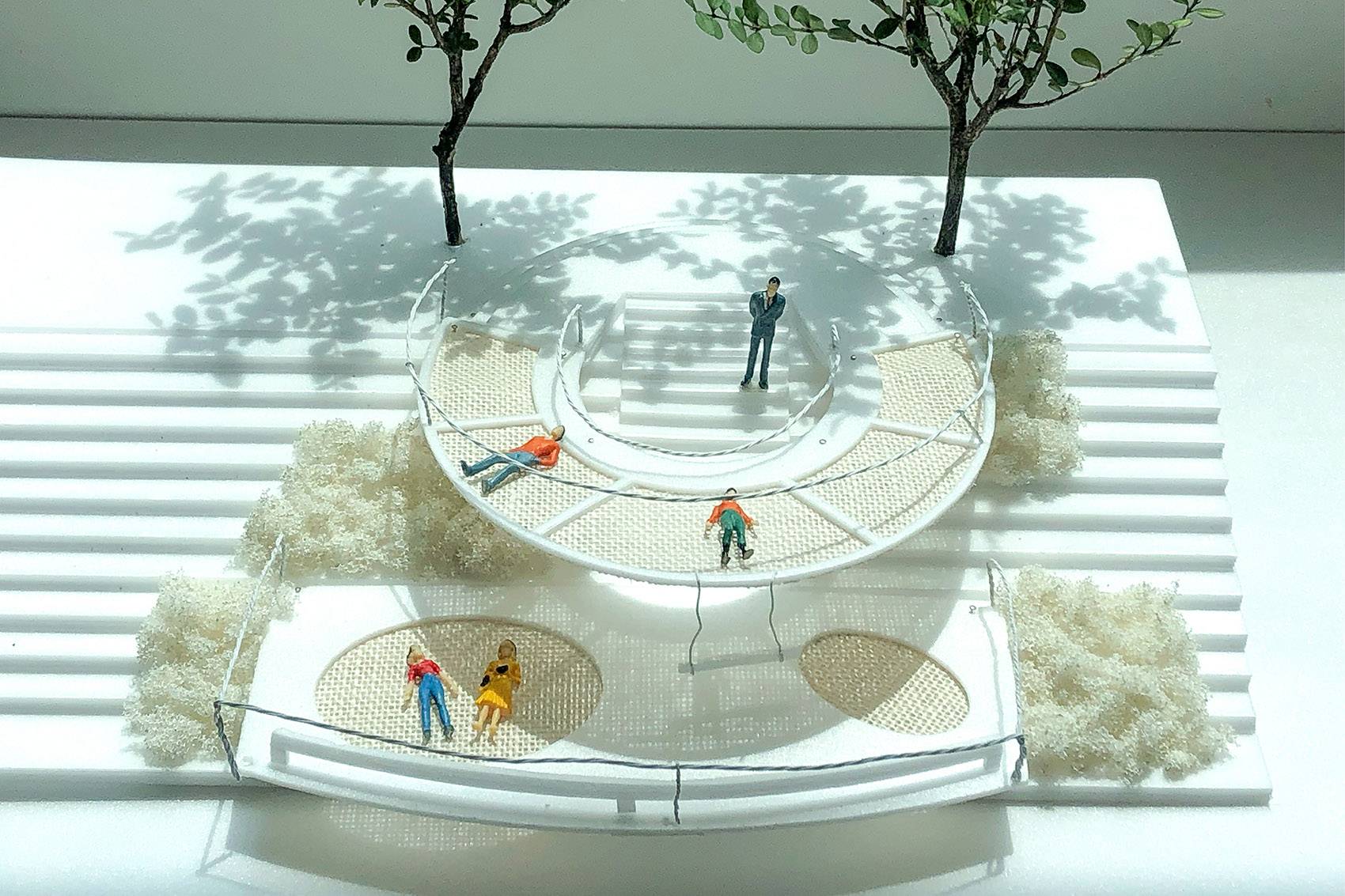 該大型吊床裝置可同時容納至少20人,由一系列的定制元件組裝而成。裝置上設(shè)有大小不一的吊床,以適應(yīng)不同身材不同年齡層的使用者。吊床的邊緣設(shè)有一圈狹長的走道,可以作為觀景臺以及吊床的桌椅使用。