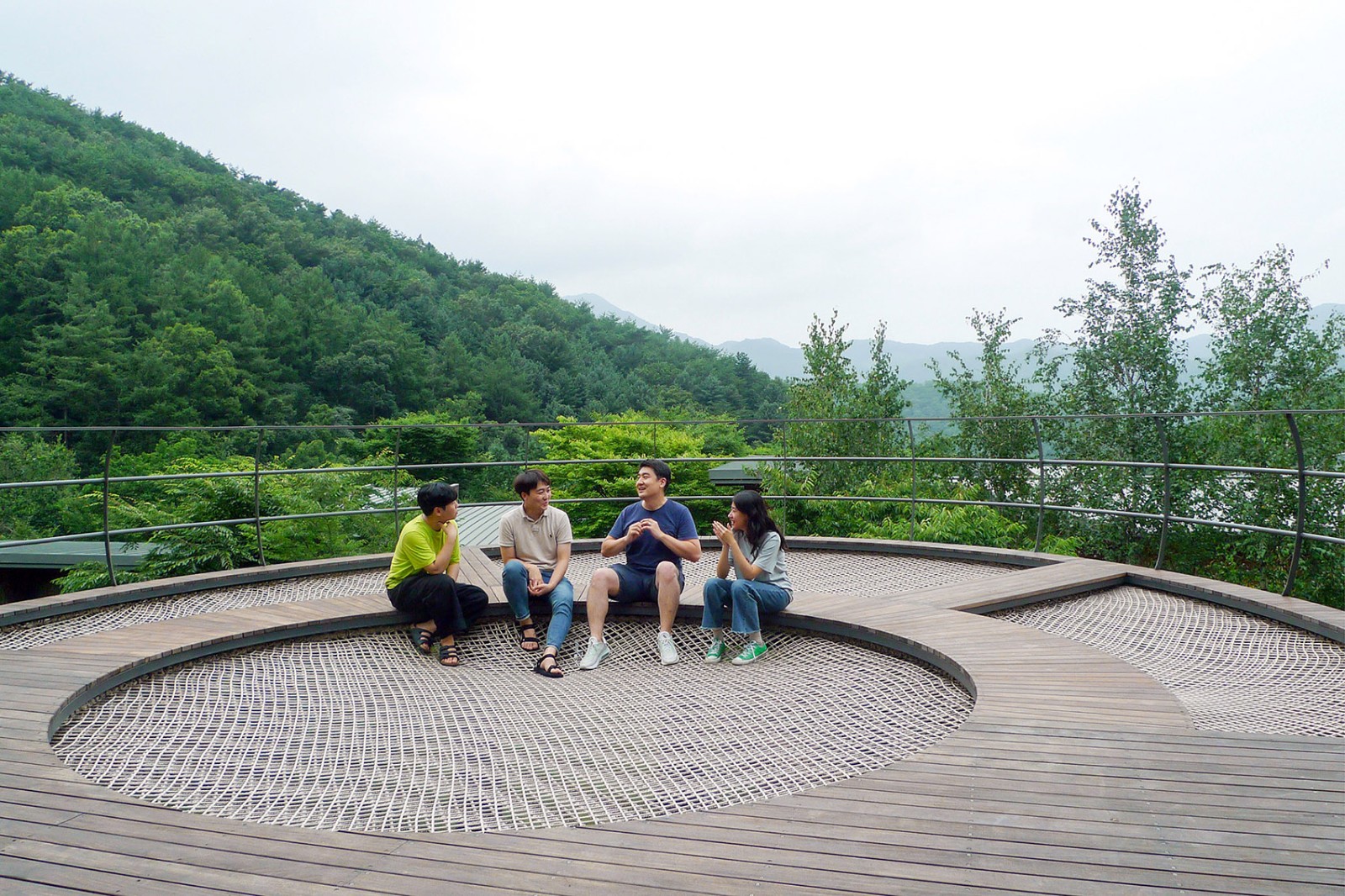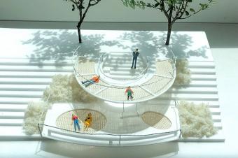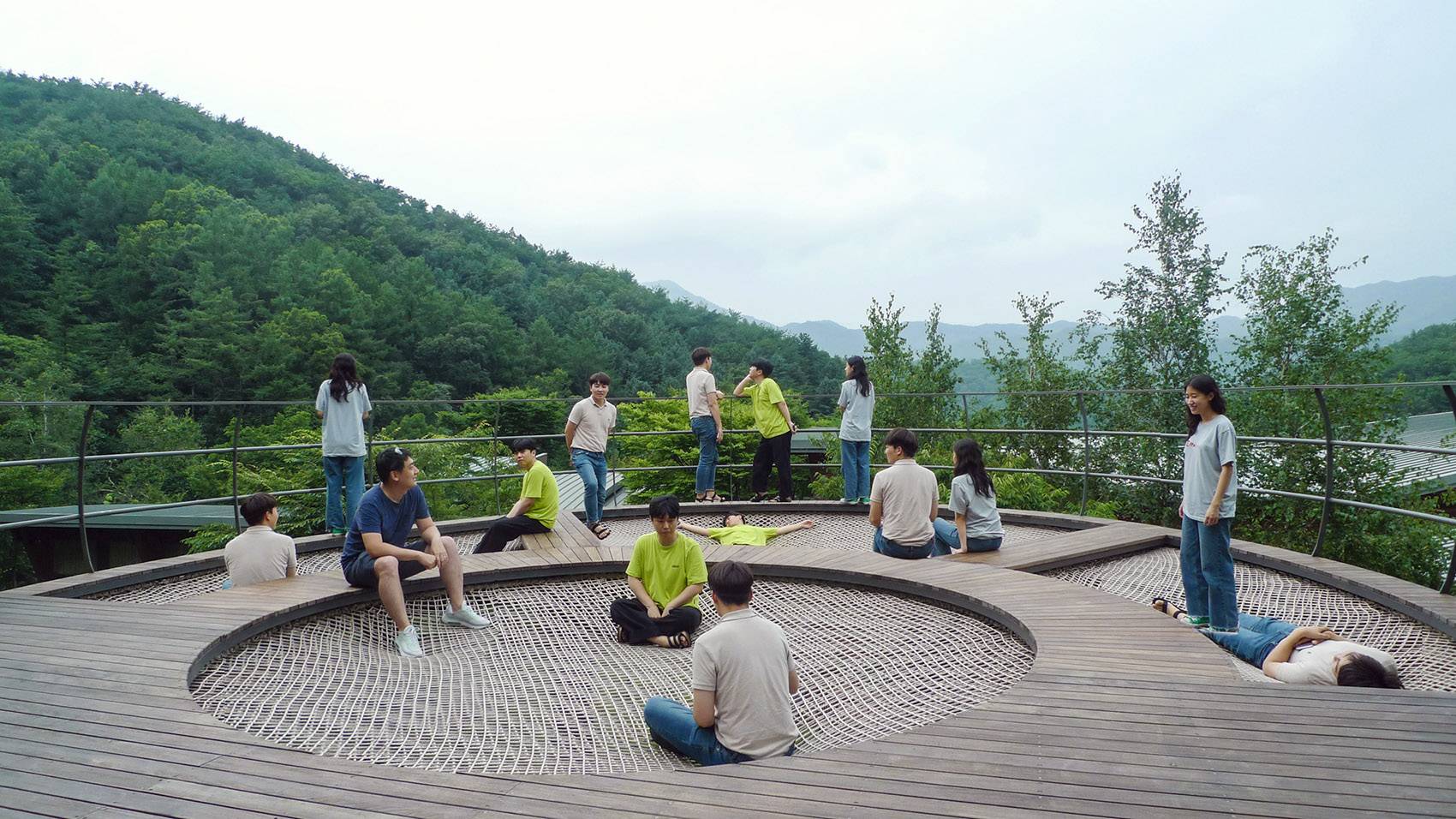 Along with installation of group furniture sets, big-sized hammock serving for more than group of 20 people is proposed. Hammock settings of various sizes can accommodate people of various sizes, and the narrow walkway at the perimeter edge serves as an observation space and a table for hammock use.