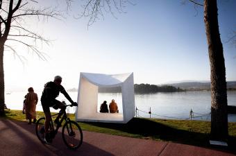 ABRIGO裝置由一個適應(yīng)場地的框架構(gòu)成,描繪出一隅沉思的角落。它為人們提供了河邊休憩的場地,使人們在體驗(yàn)裝置空間的同時,悠閑地欣賞河岸的美景。于此,獨(dú)特的裝置元素,將周圍的景觀統(tǒng)一起來,營造出和諧的氛圍。